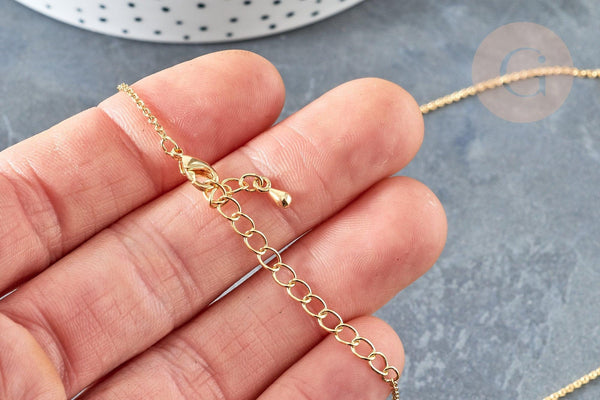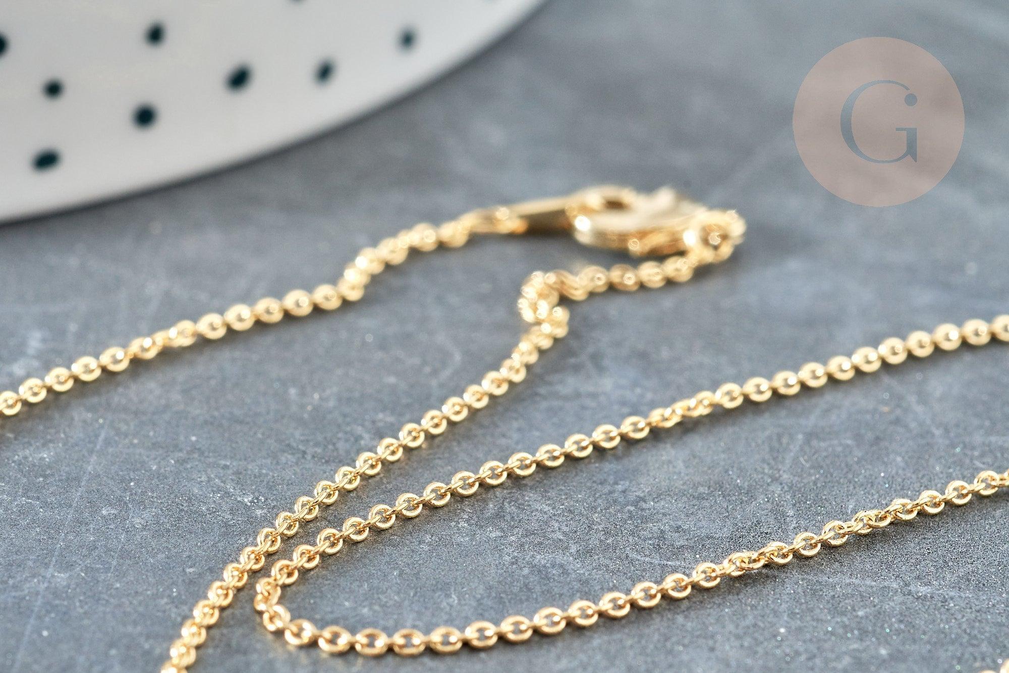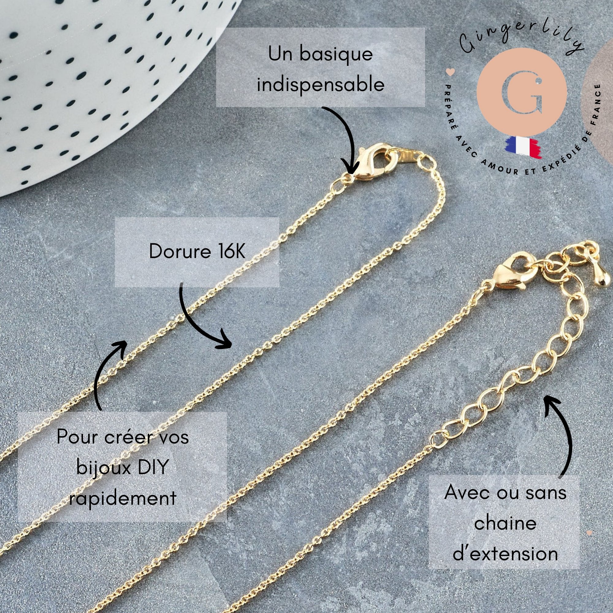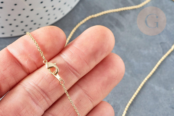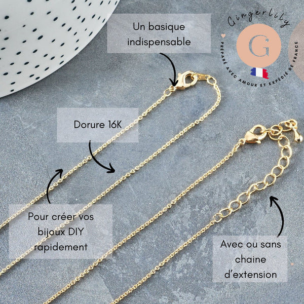 Dale un toque de delicadeza y brillo a tus creaciones con esta fina cadena barbada bañada en oro de 16 quilates (2,5 micras de grosor) . Gracias a su cierre integrado, es perfecta para crear elegantes collares en un abrir y cerrar de ojos, para lucir sola o con colgantes.