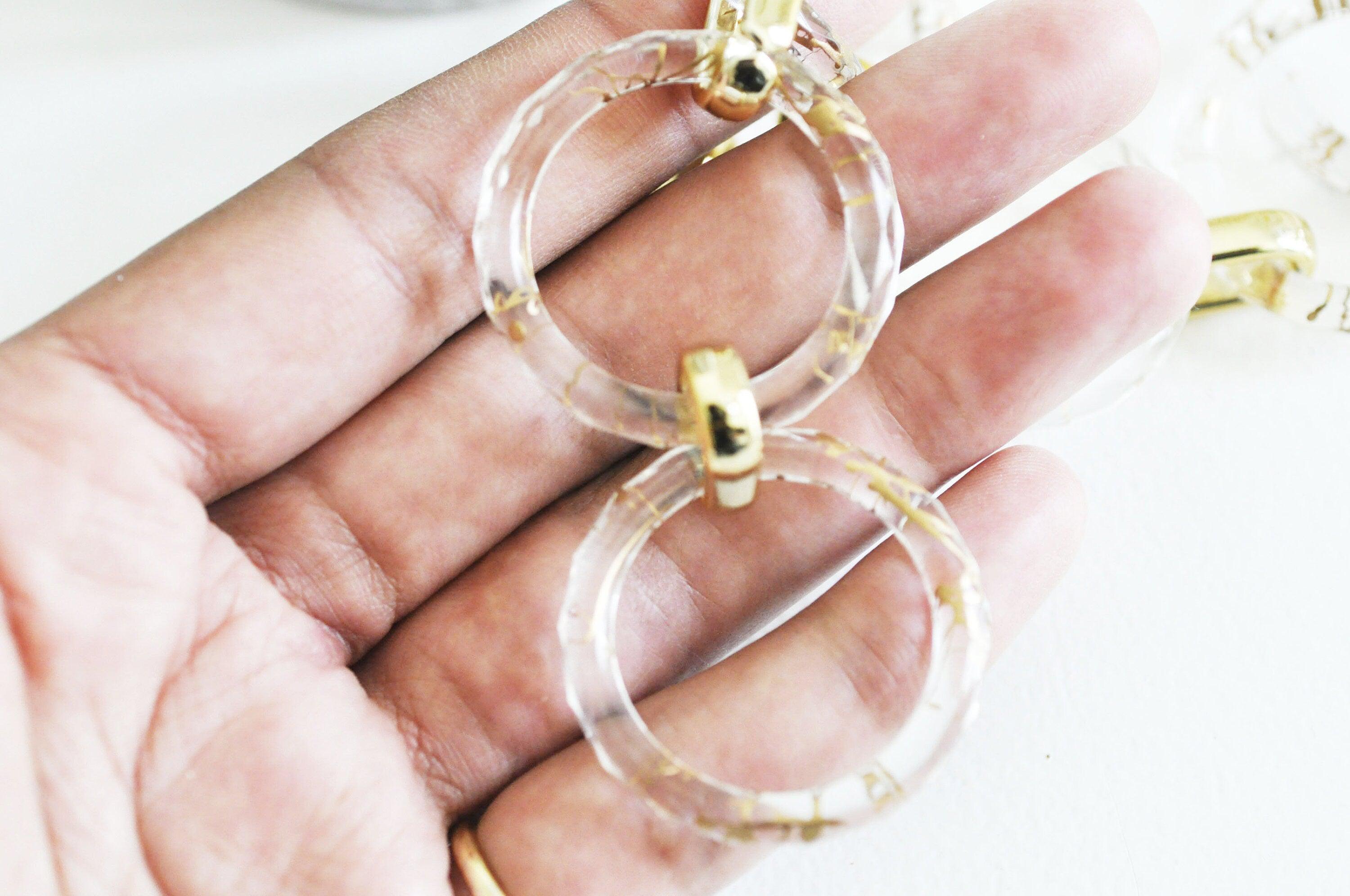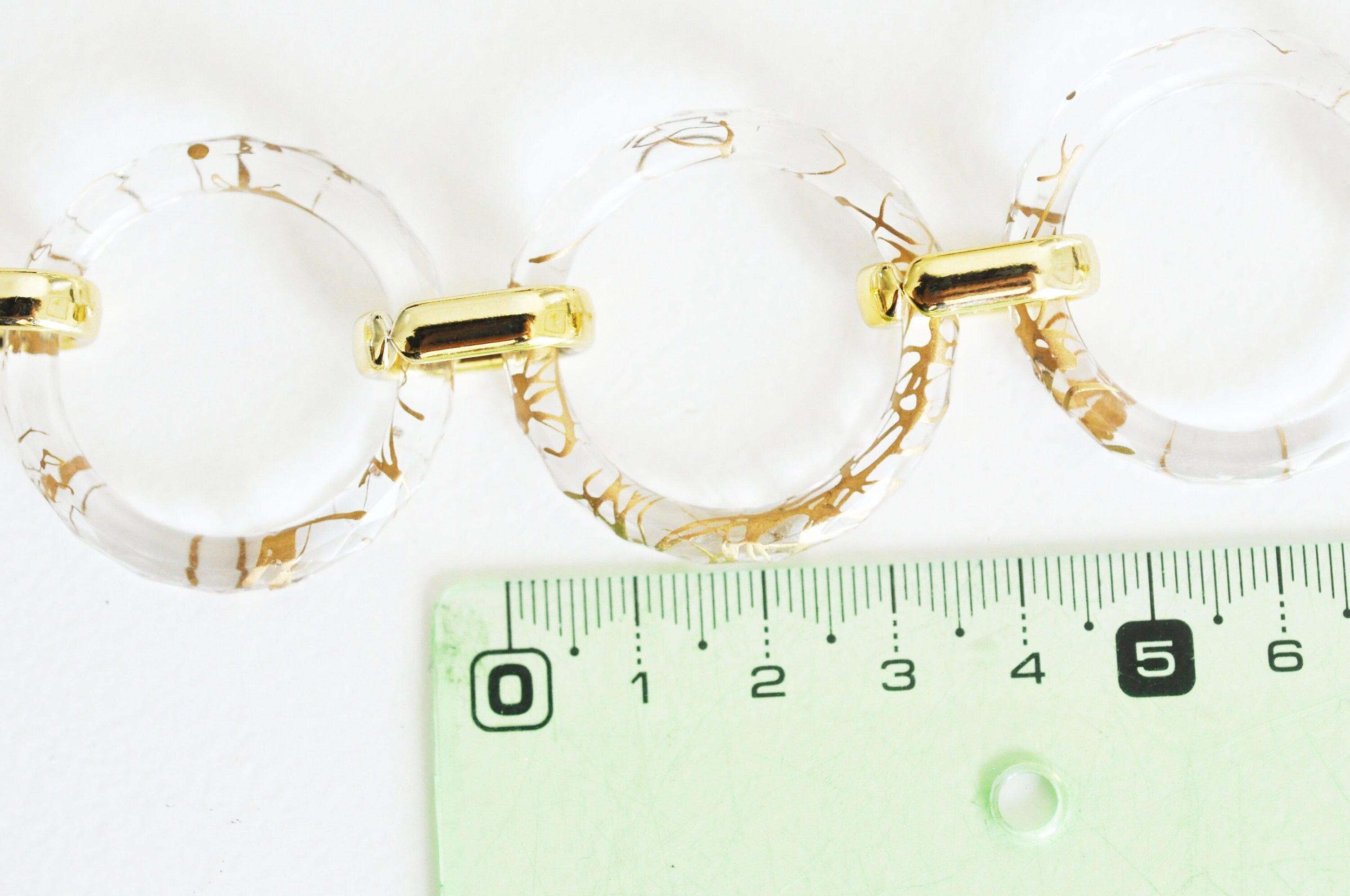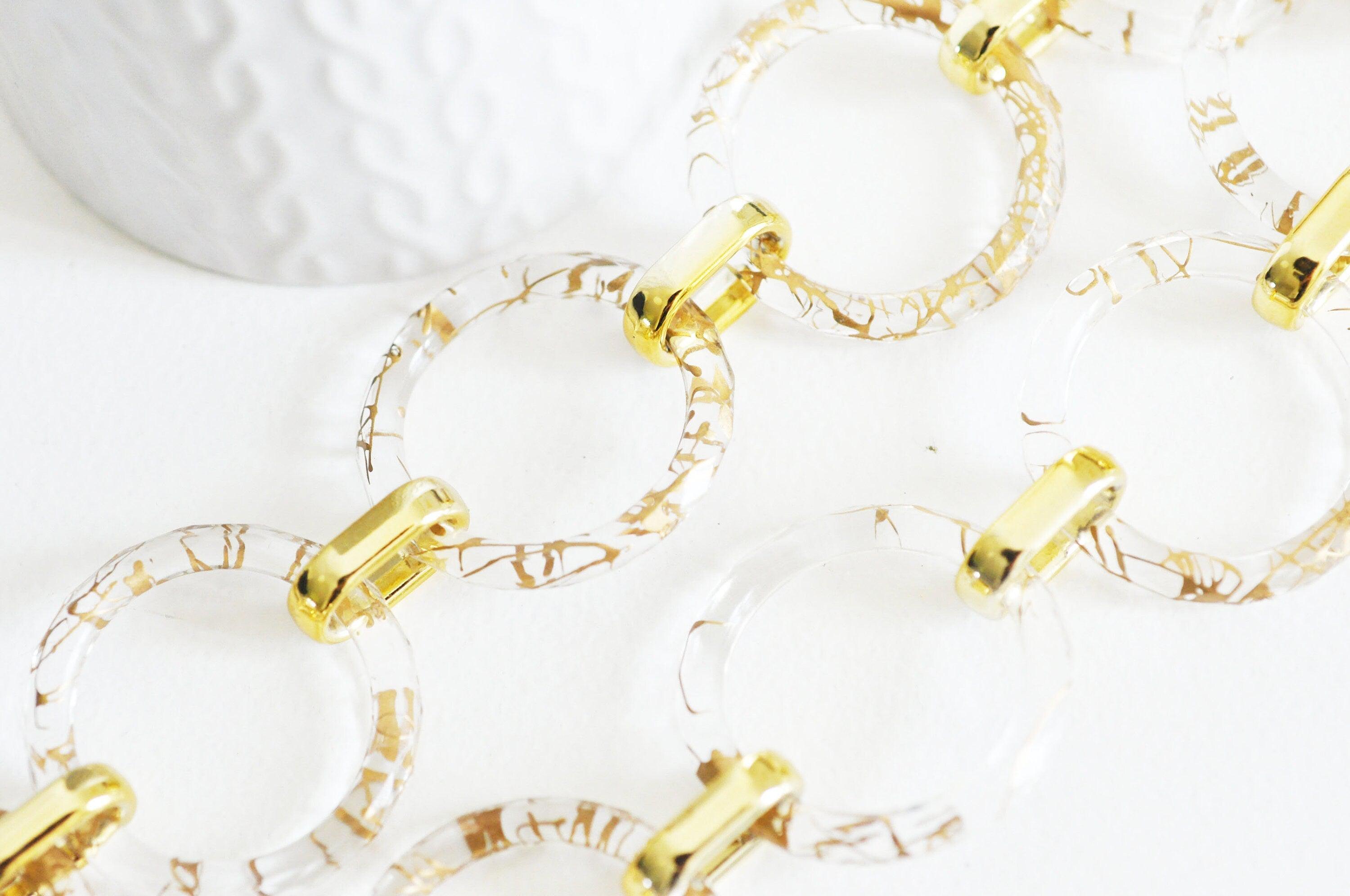 Una gran cadena de plástico acrílico transparente con un patrón dorado y un eslabón de aluminio dorado para crear joyas modernas y originales. Se entregarán en lotes de 1 metro. Un acabado original para combinar con nuestros aros de acero...