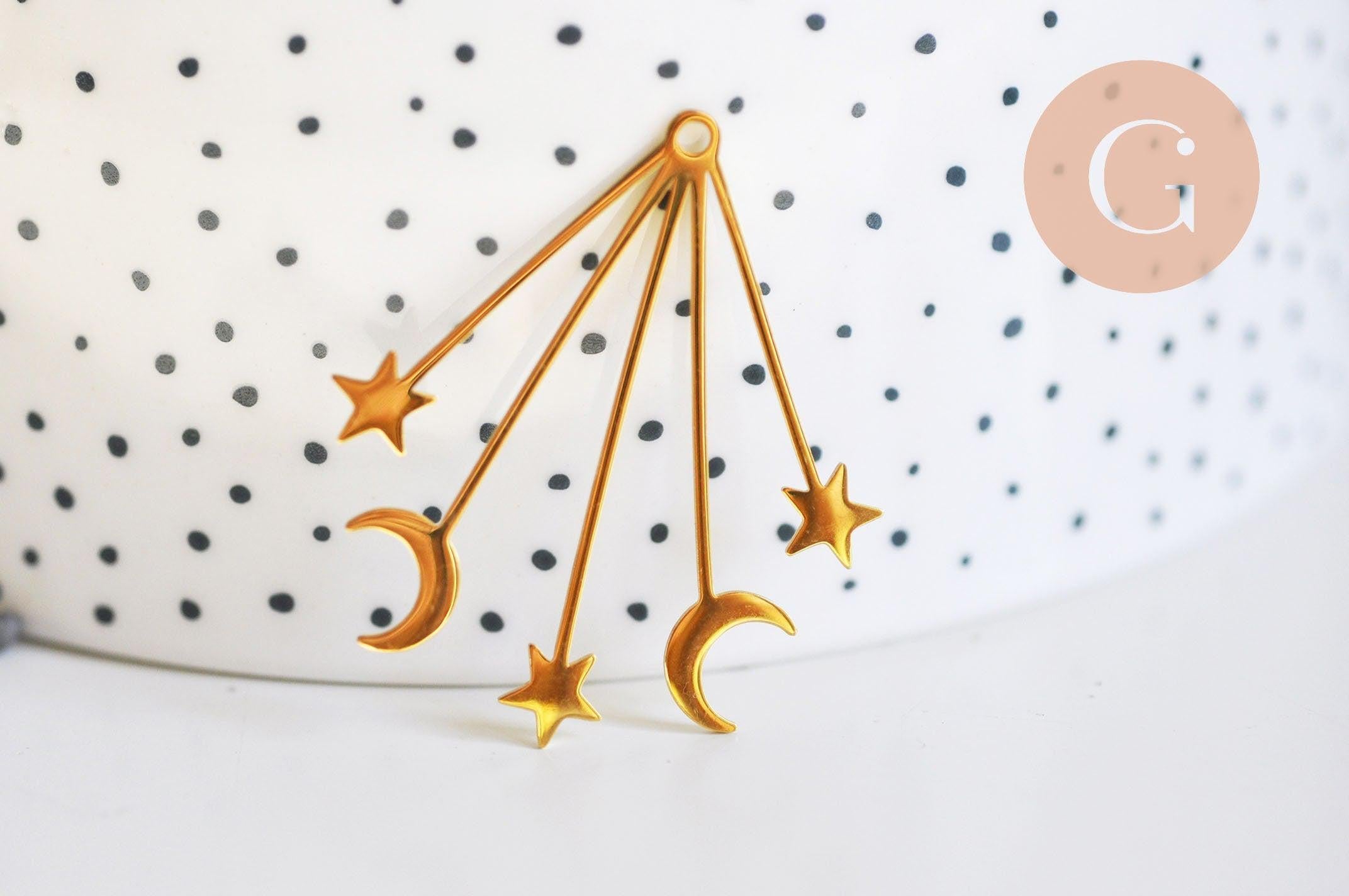Adopta este adorable colgante en forma de lluvia de lunas y estrellas y planetas en acero bañado en oro, que podrás adornar con una piedra o perlas.