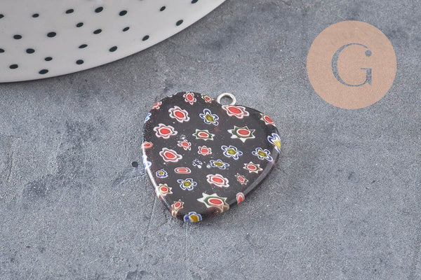 Añade un toque de arte en vidrio a tus creaciones con este impresionante colgante de corazón de cristal millefiori, inspirado en la tradición veneciana . Cada pieza está hecha a mano y presenta un mosaico de coloridos motivos florales, creando una joya única y encantadora.