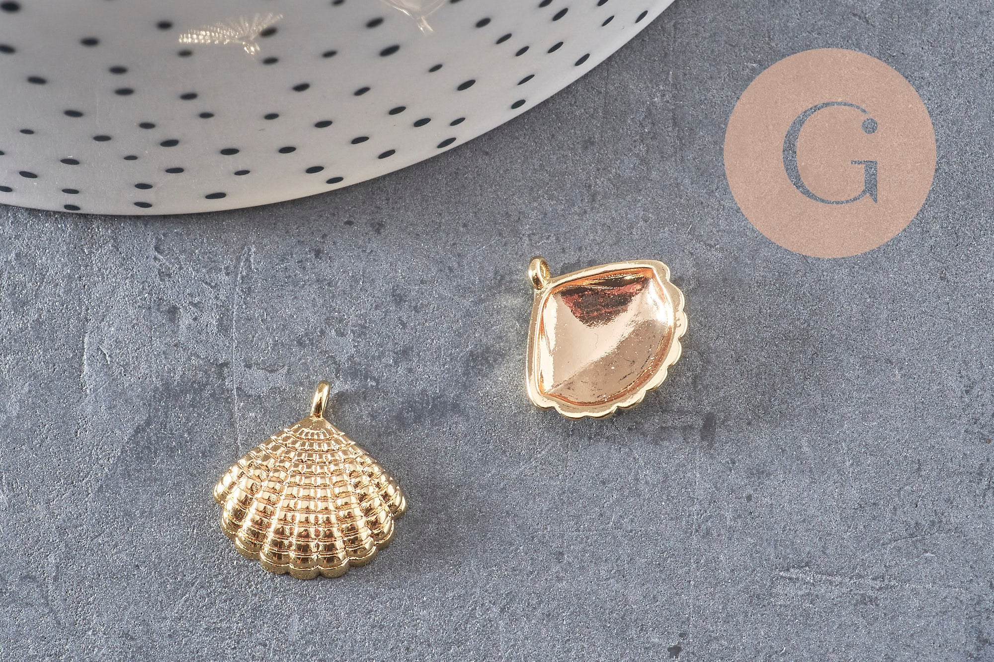 2 colgantes de concha en metal bañado en oro de 14K.