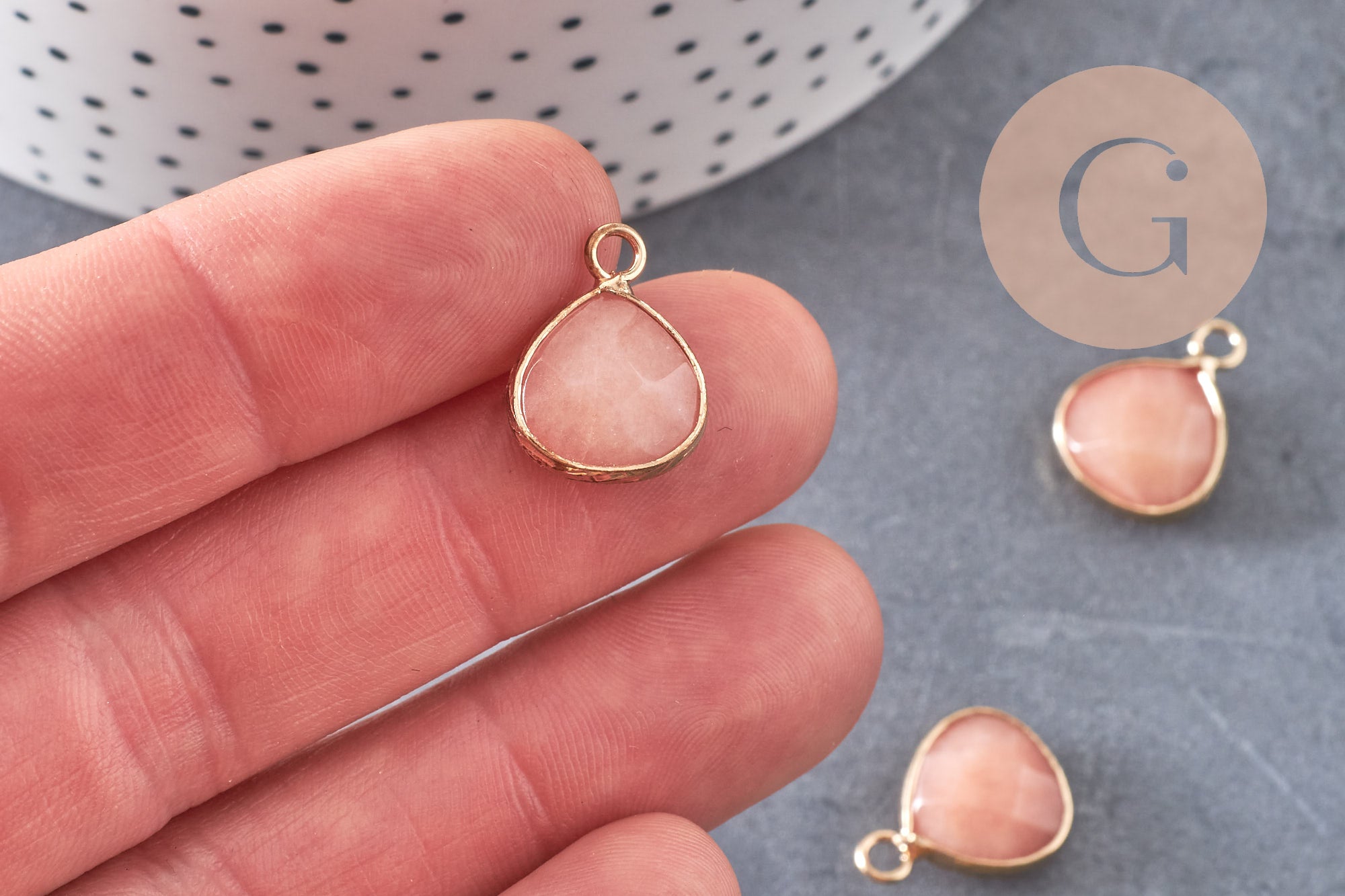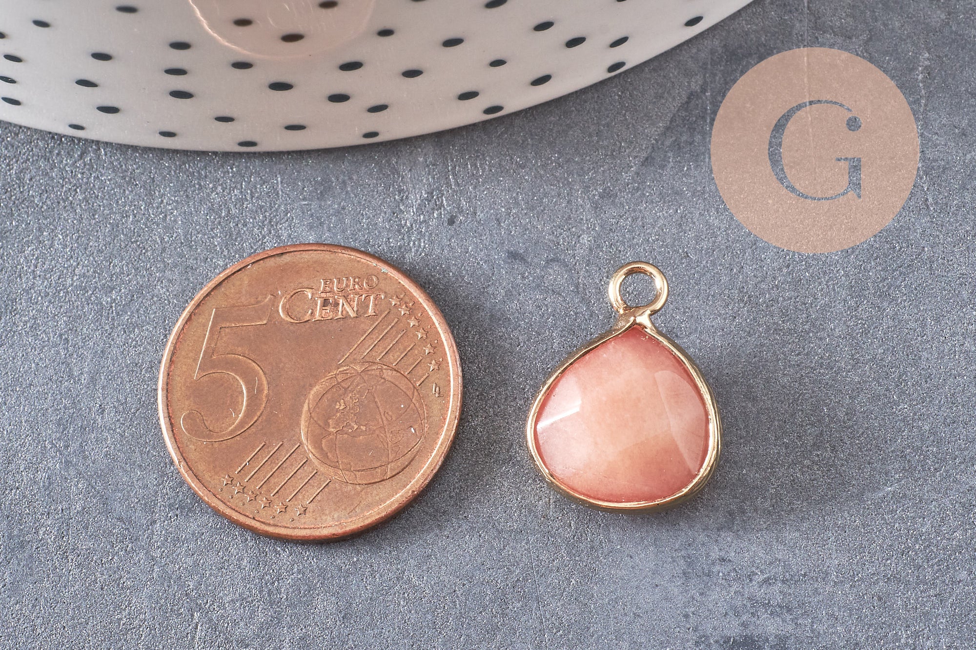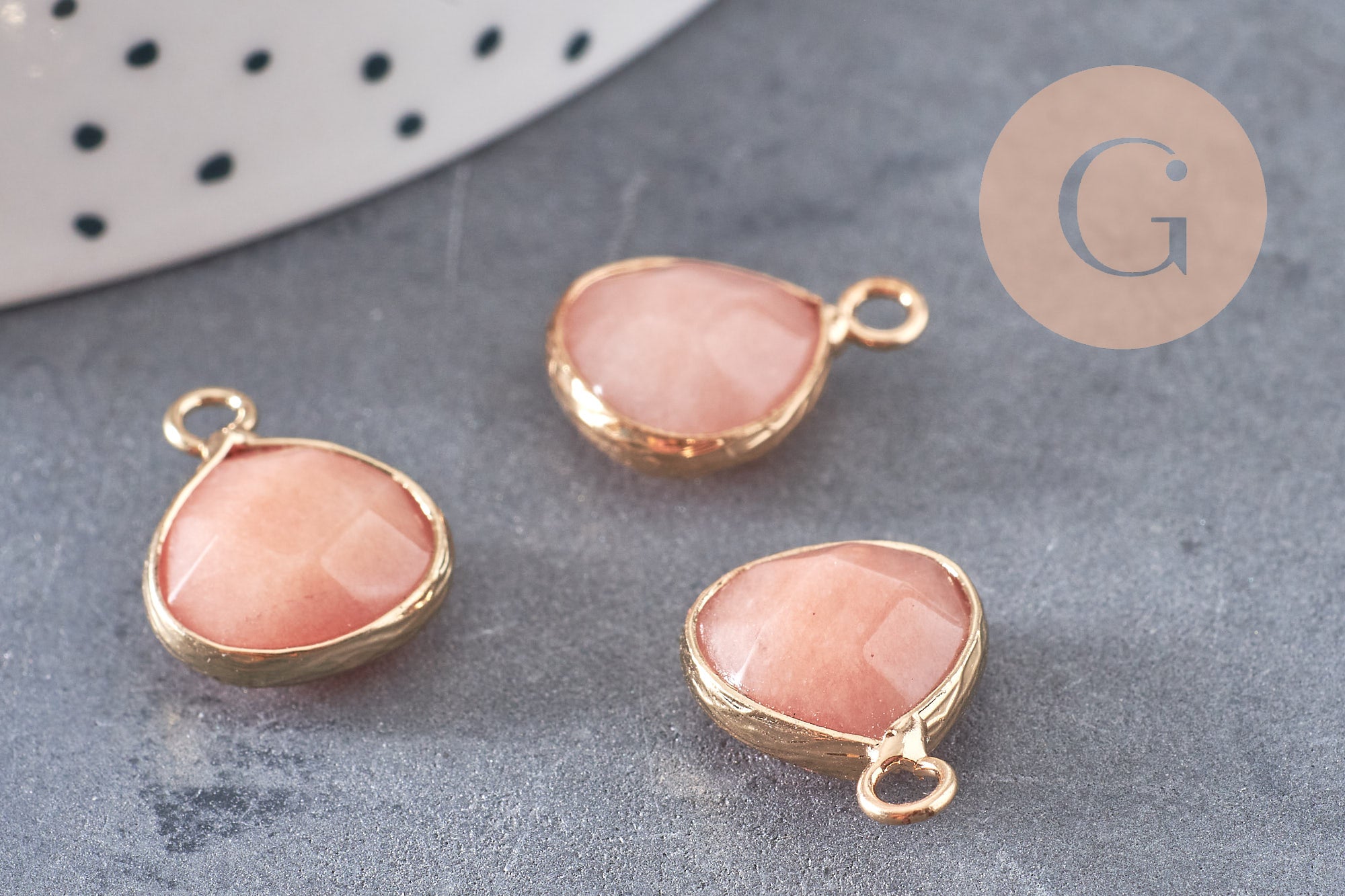 Déjate seducir por este pequeño colgante de jade teñido con su soporte dorado en forma de gota.