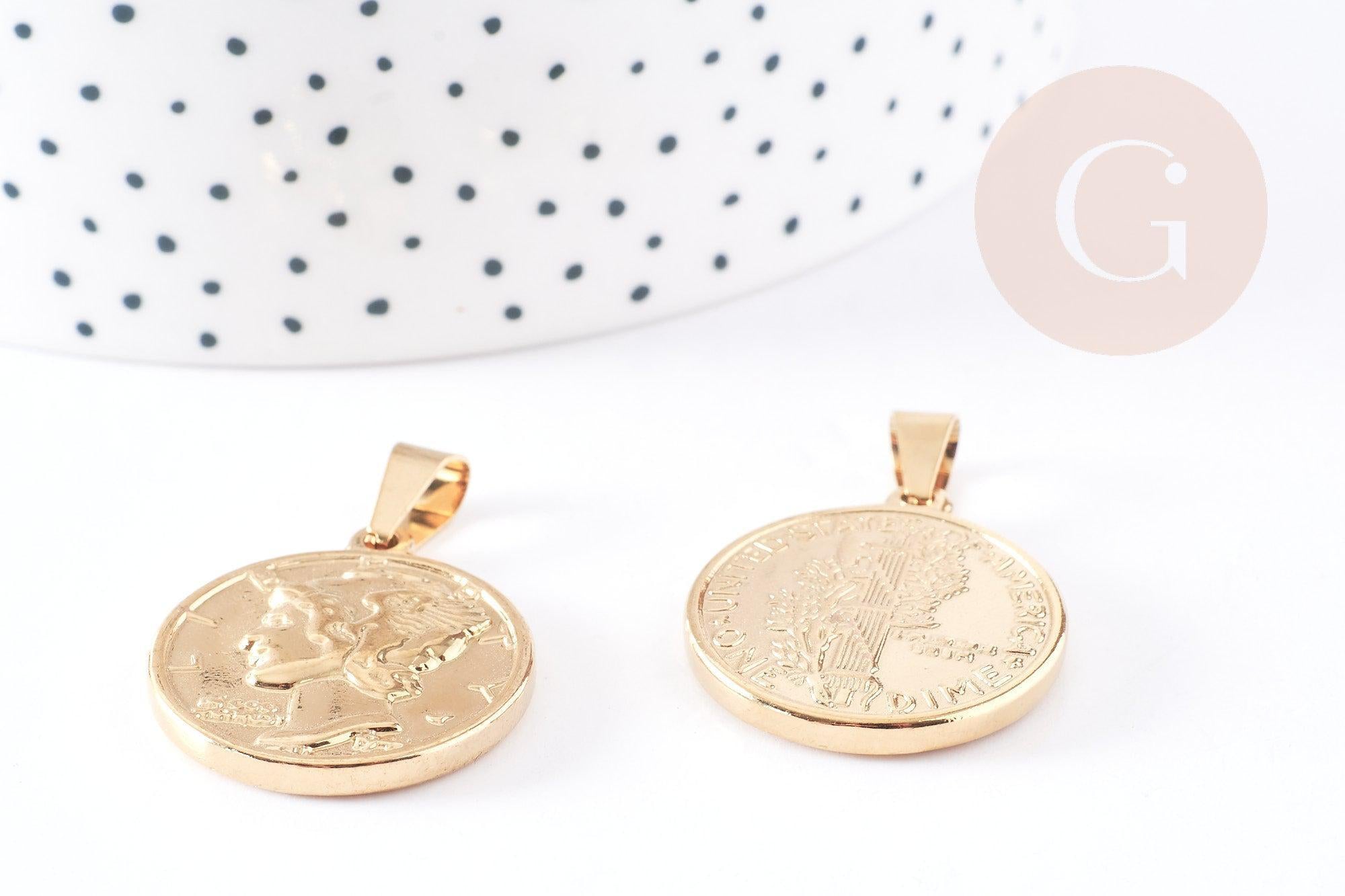 Medalla redonda colgante moneda acero inoxidable 304 oro 29mm, x1 (G1752)
