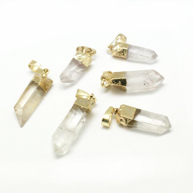 Colgante de punta de cristal transparente dorado, suministros creativos, colgante, colgante de piedra, cristal natural, colgante de cristal, 25-65 mm Colgante de cristal transparente con su soporte dorado. Podrás crear magníficos collares utilizando este colgante tan moderno. La piedra está...