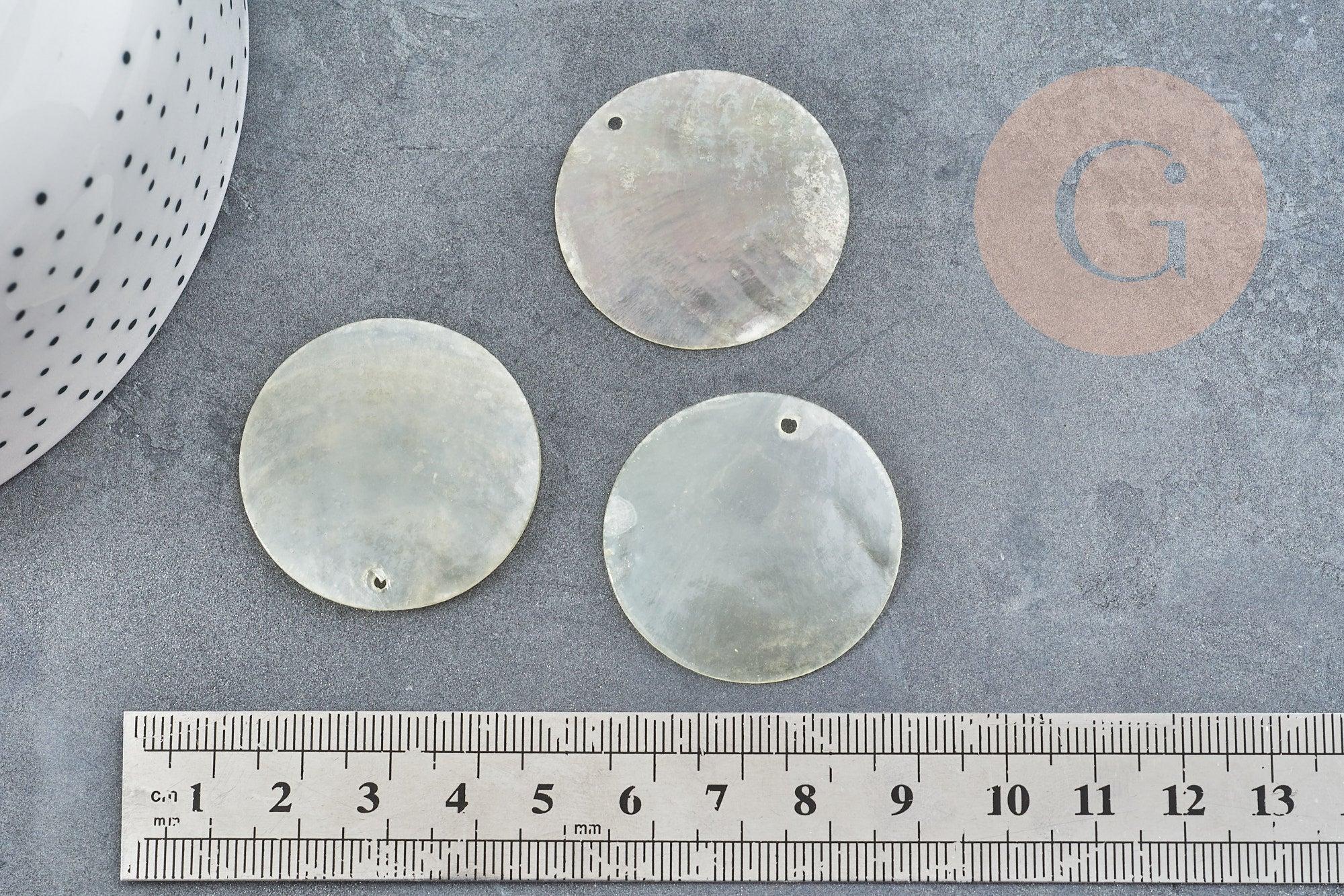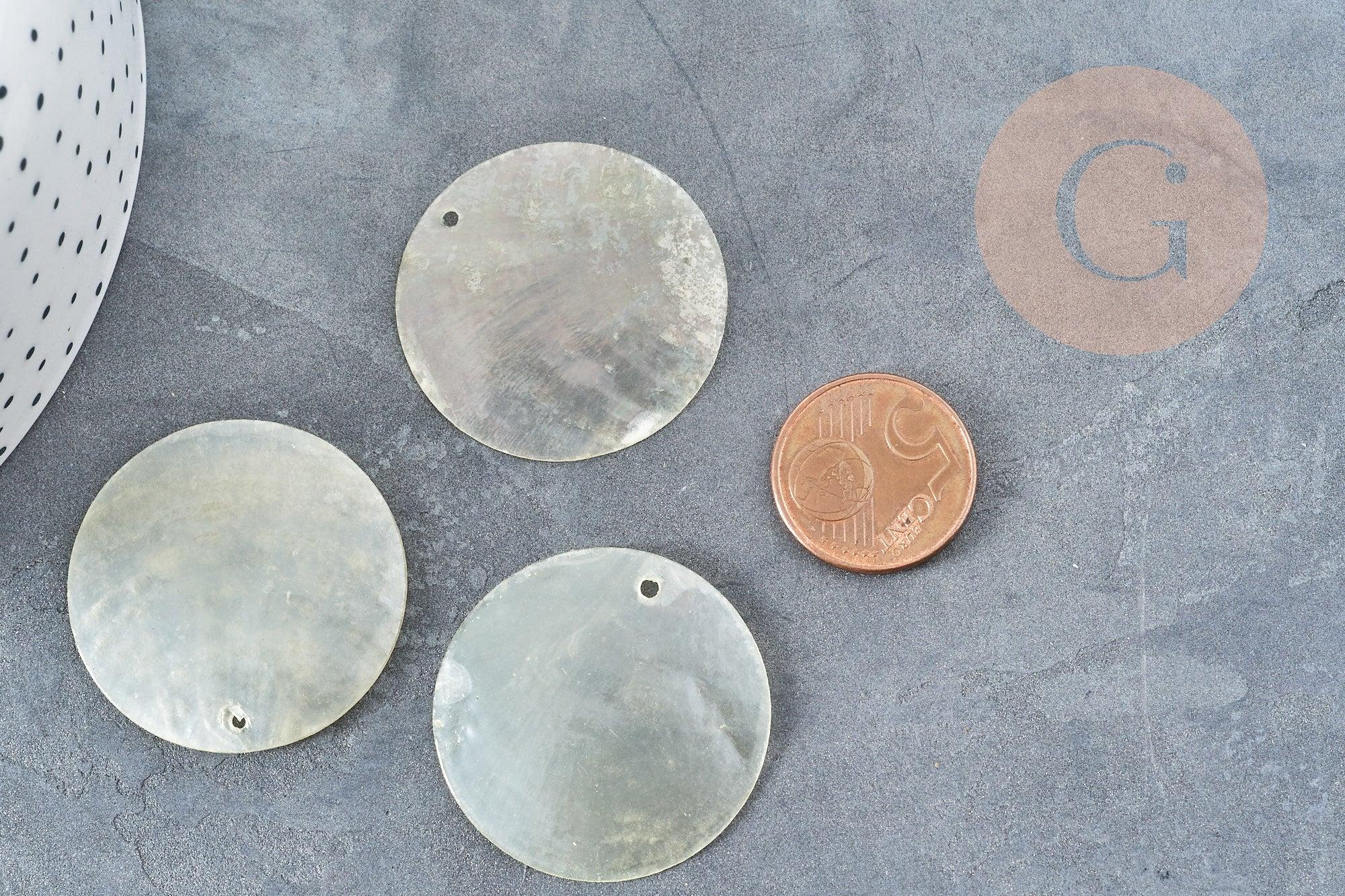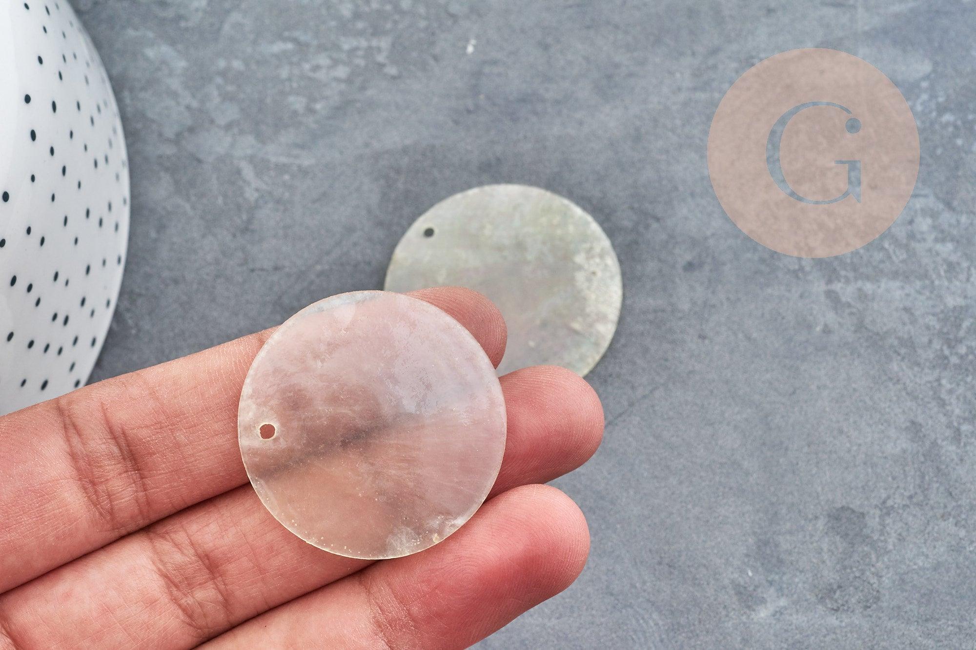 Colgante redondo de nácar natural blanco de 35 mm de diámetro , ideal para completar un collar o unos pendientes. Los perdigones están perforados por ambos lados.