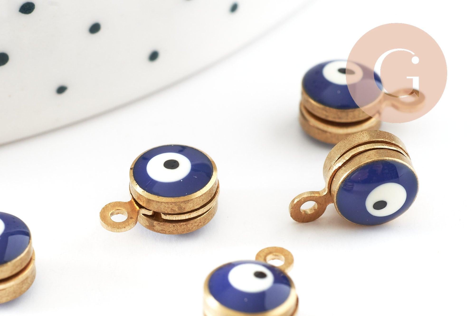 Un juego de 10 colgantes de latón con motivo de ojos en esmalte blanco y azul.