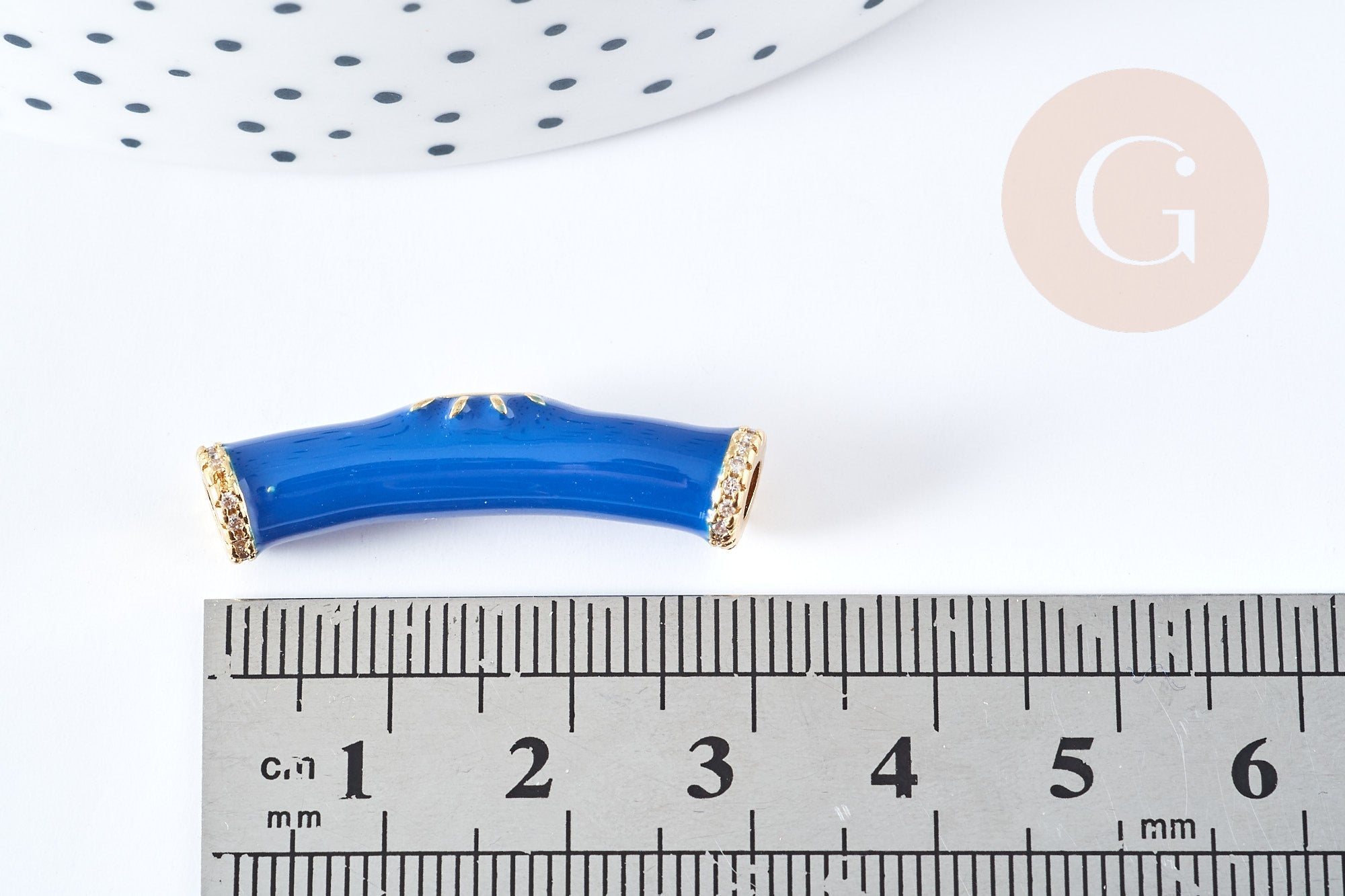 Añade un toque de protección y felicidad a tus creaciones de joyería con este talismán protector de ojo en forma de tubo dorado de latón bañado en oro de 18 quilates esmaltado en azul. Con un tamaño de 32 mm, esta perla tubular dorada es una auténtica obra de arte que causará sensación en todas tus creaciones de joyería.