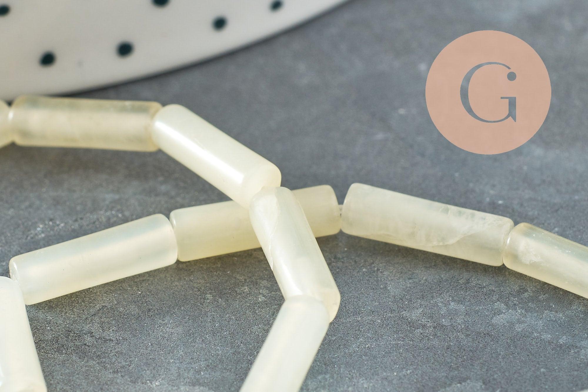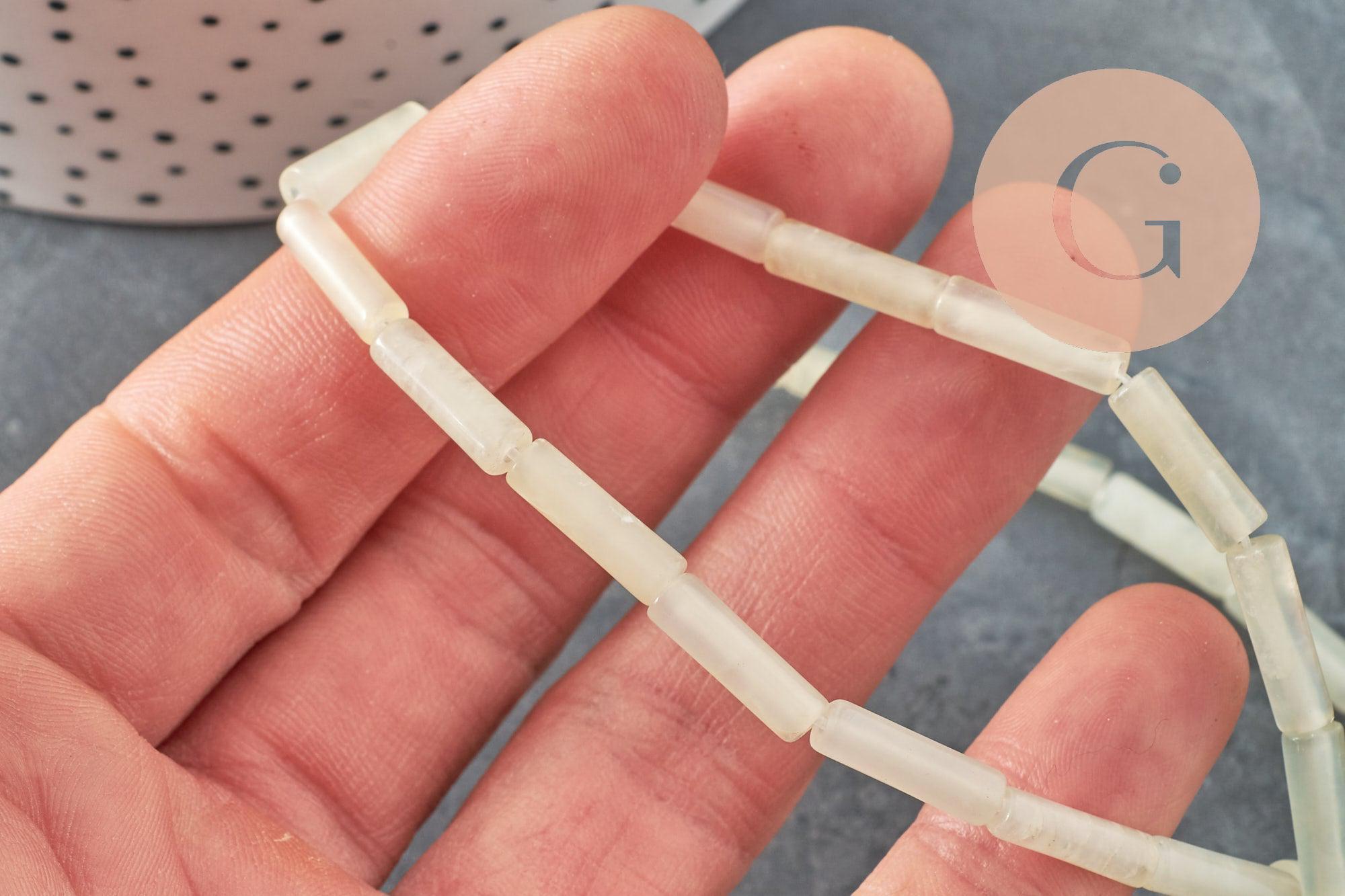 Una tira de aproximadamente 30 cuentas tubulares de jade natural teñidas de un verde muy pálido.