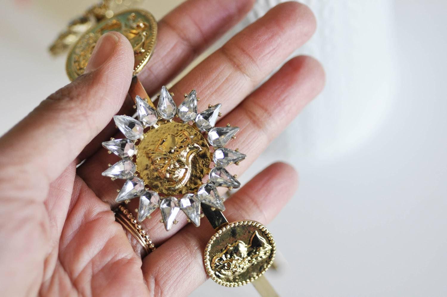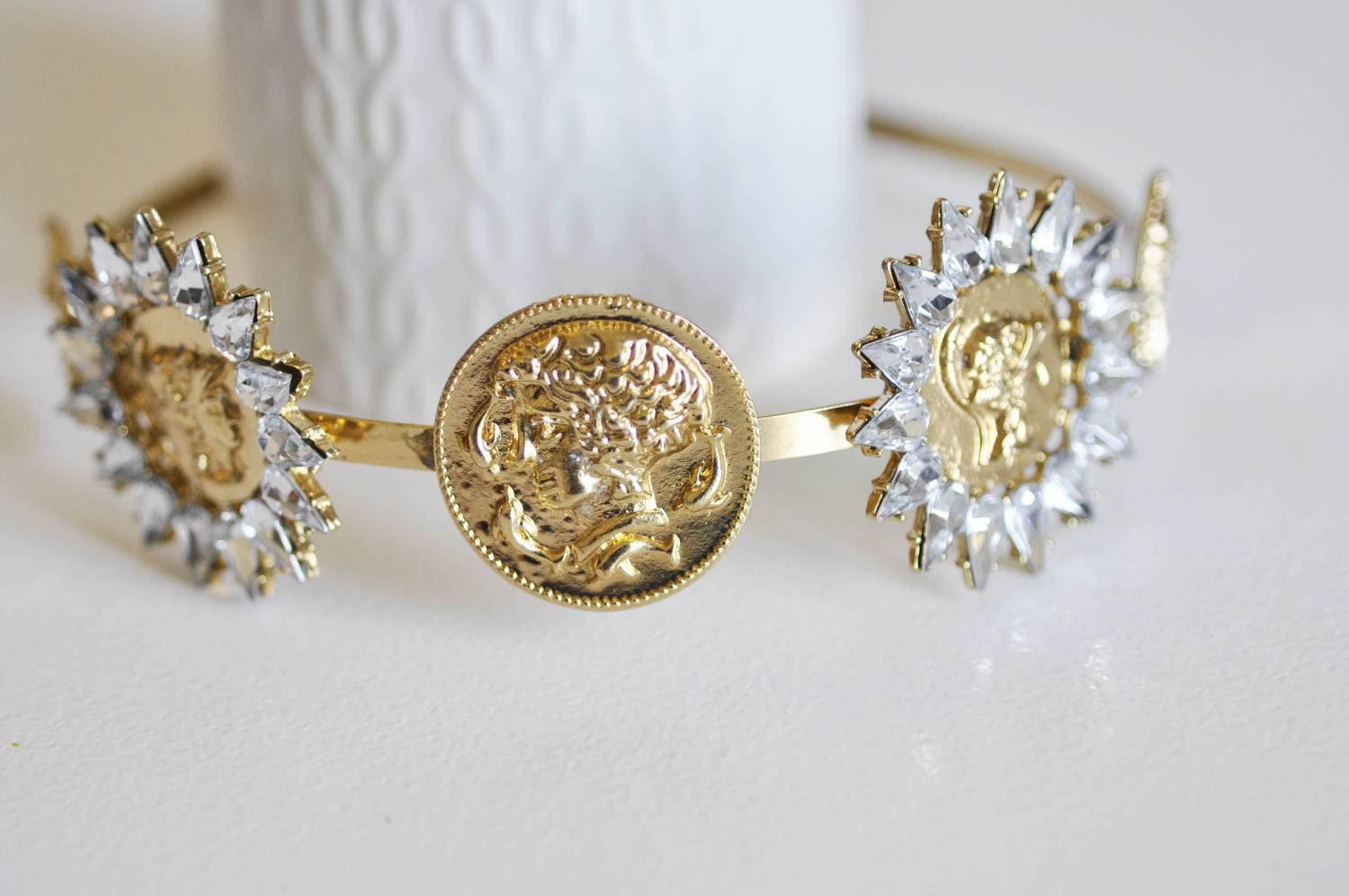 Diadema para el cabello con medalla de pedrería dorada, accesorios para el cabello, pasadores para el cabello, accesorio de boda, decoración para el cabello, 120 mm Una diadema de metal dorado (hierro), que se puede adoptar inmediatamente para un outfit...