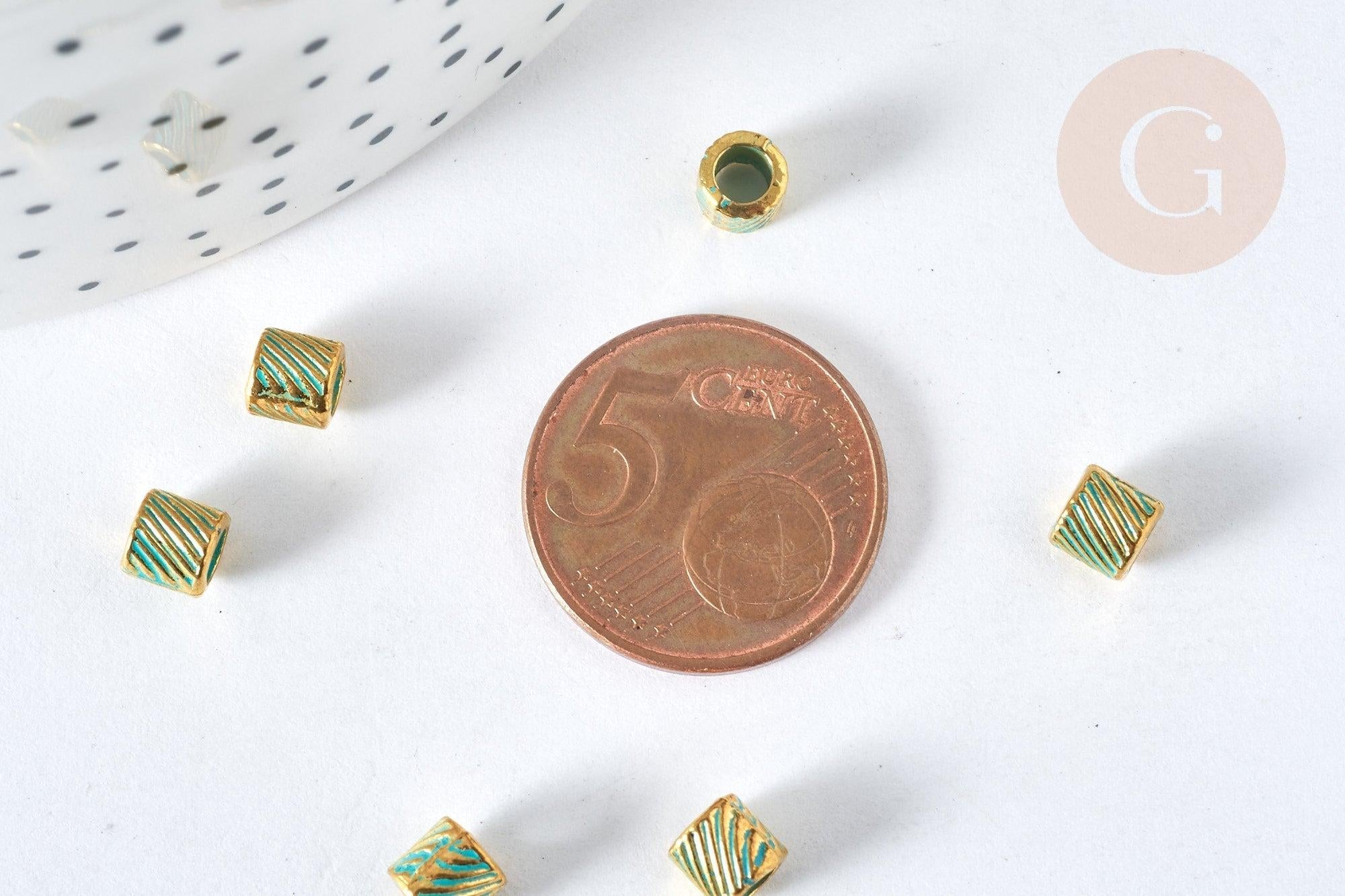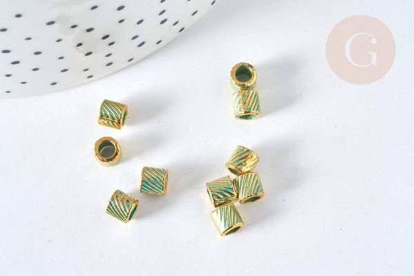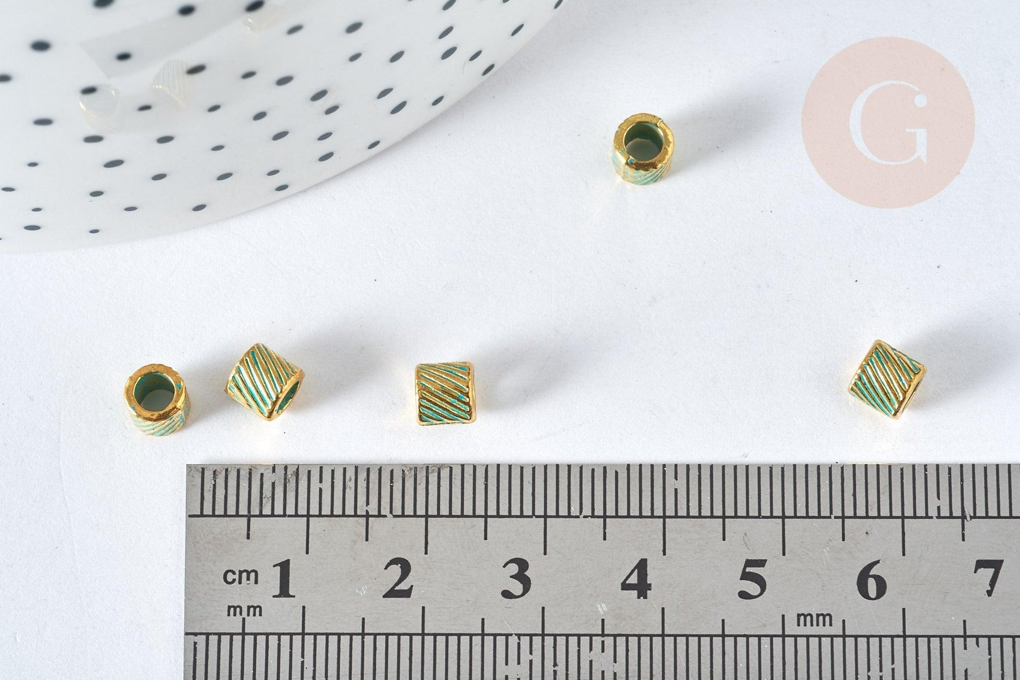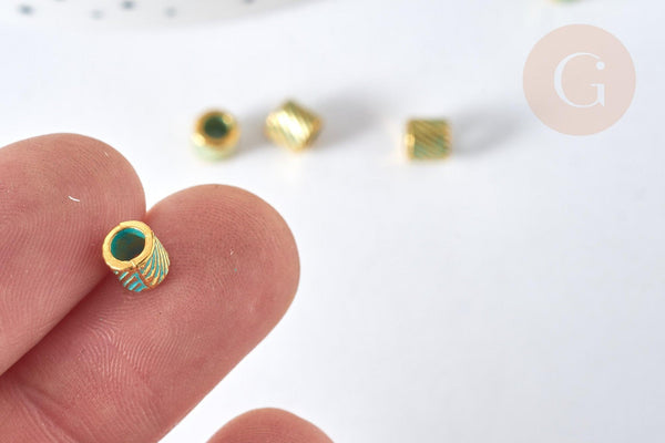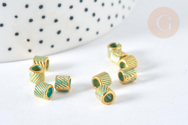 Déjese seducir por esta cuenta tubo a rayas con gran agujero de zamac dorado con acabado de esmalte azul turquesa