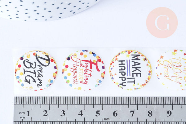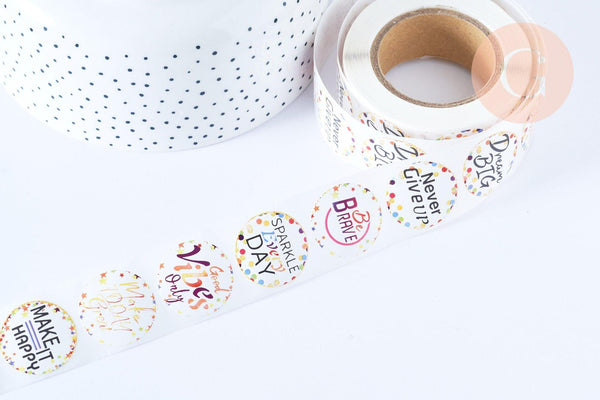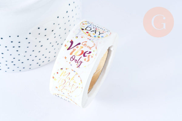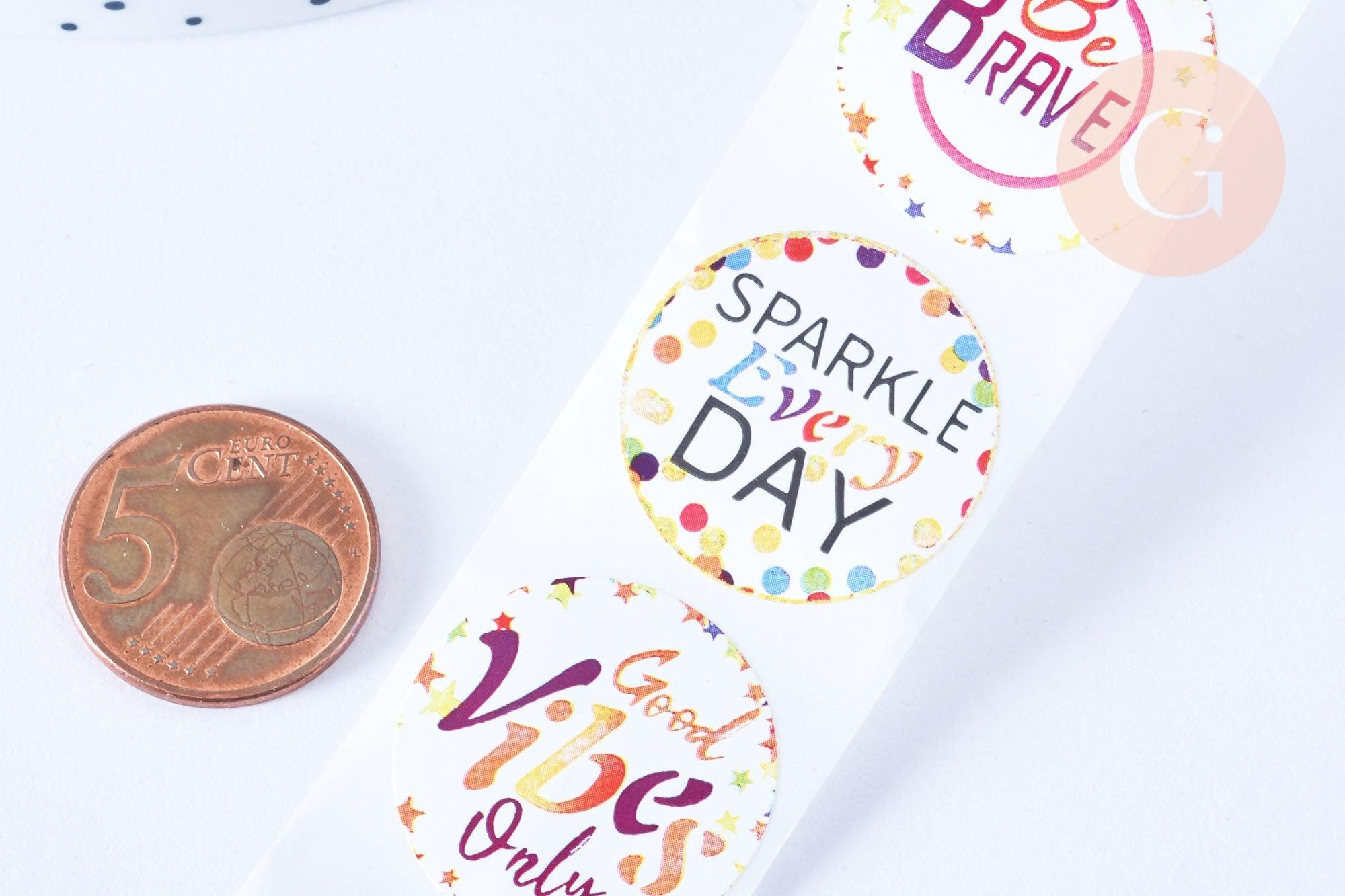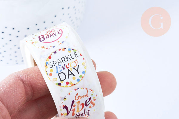 Están marcados con palabras en inglés como "Good vibes only", Sparkle each day", "Be valiente".