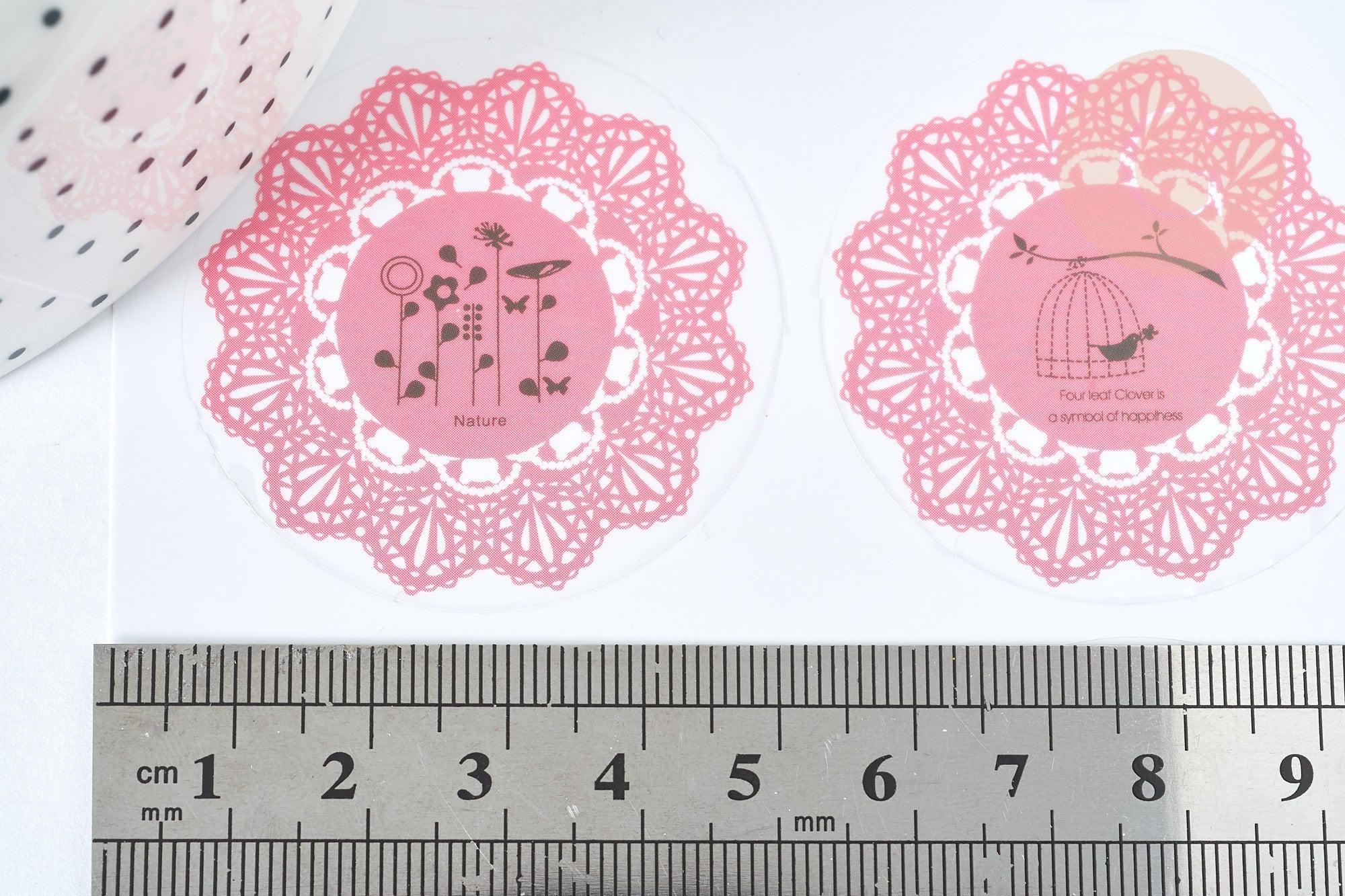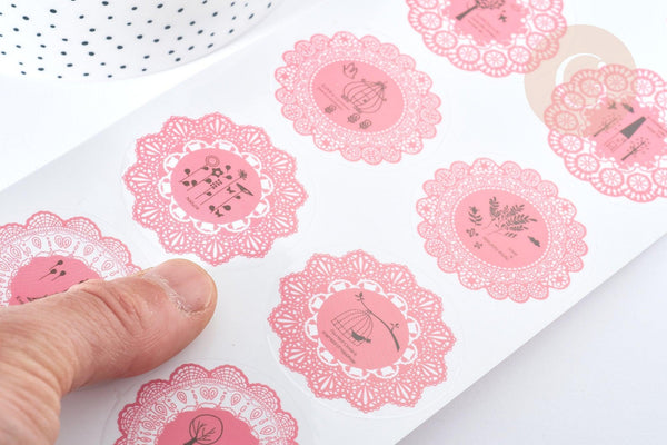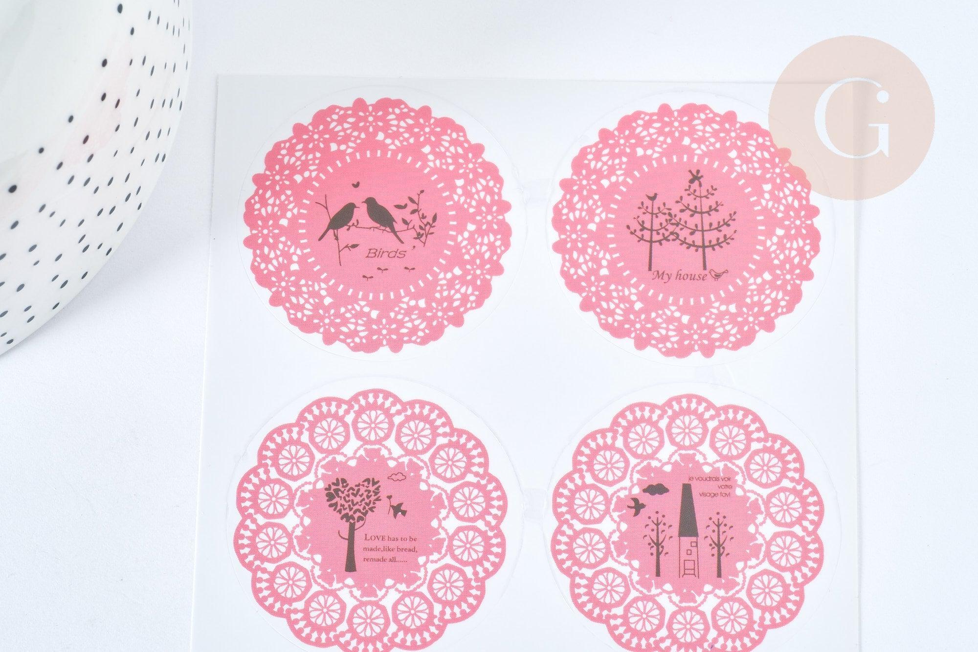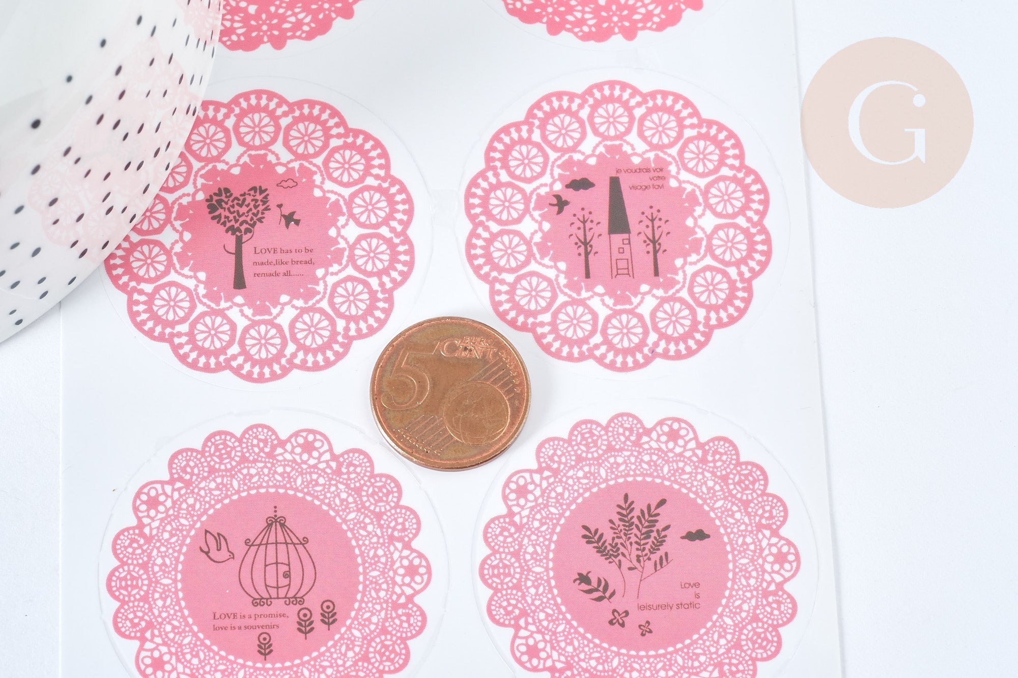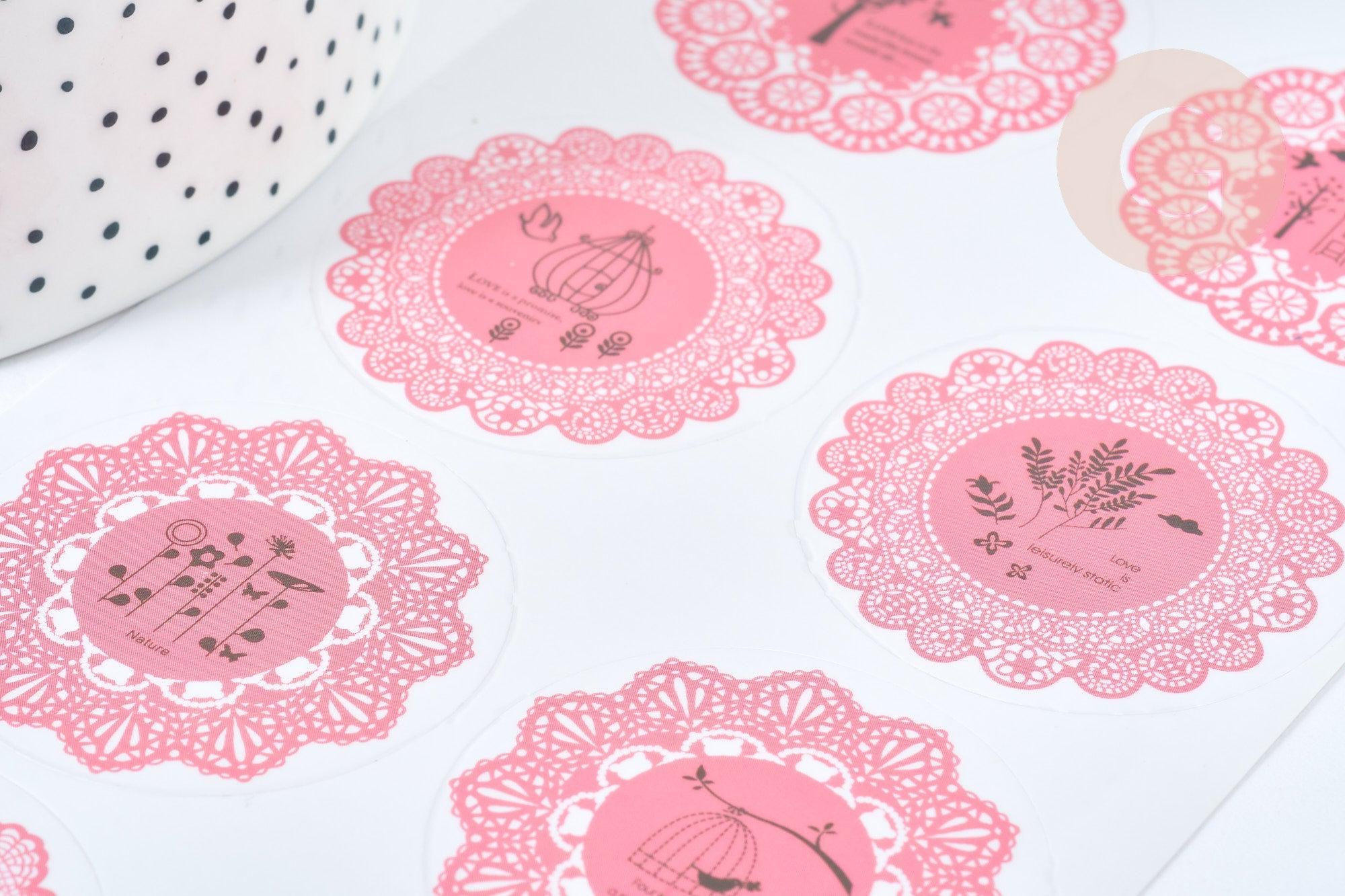Déjate seducir por estas pegatinas redondas de color rosa con forma de macarrón de encaje, como agradecimiento, decoración de fiestas o pequeños regalos de boda.