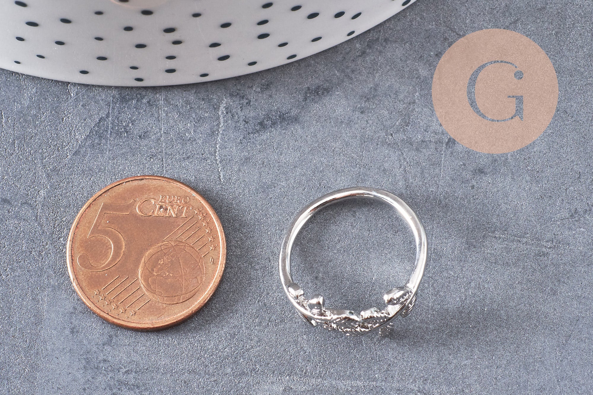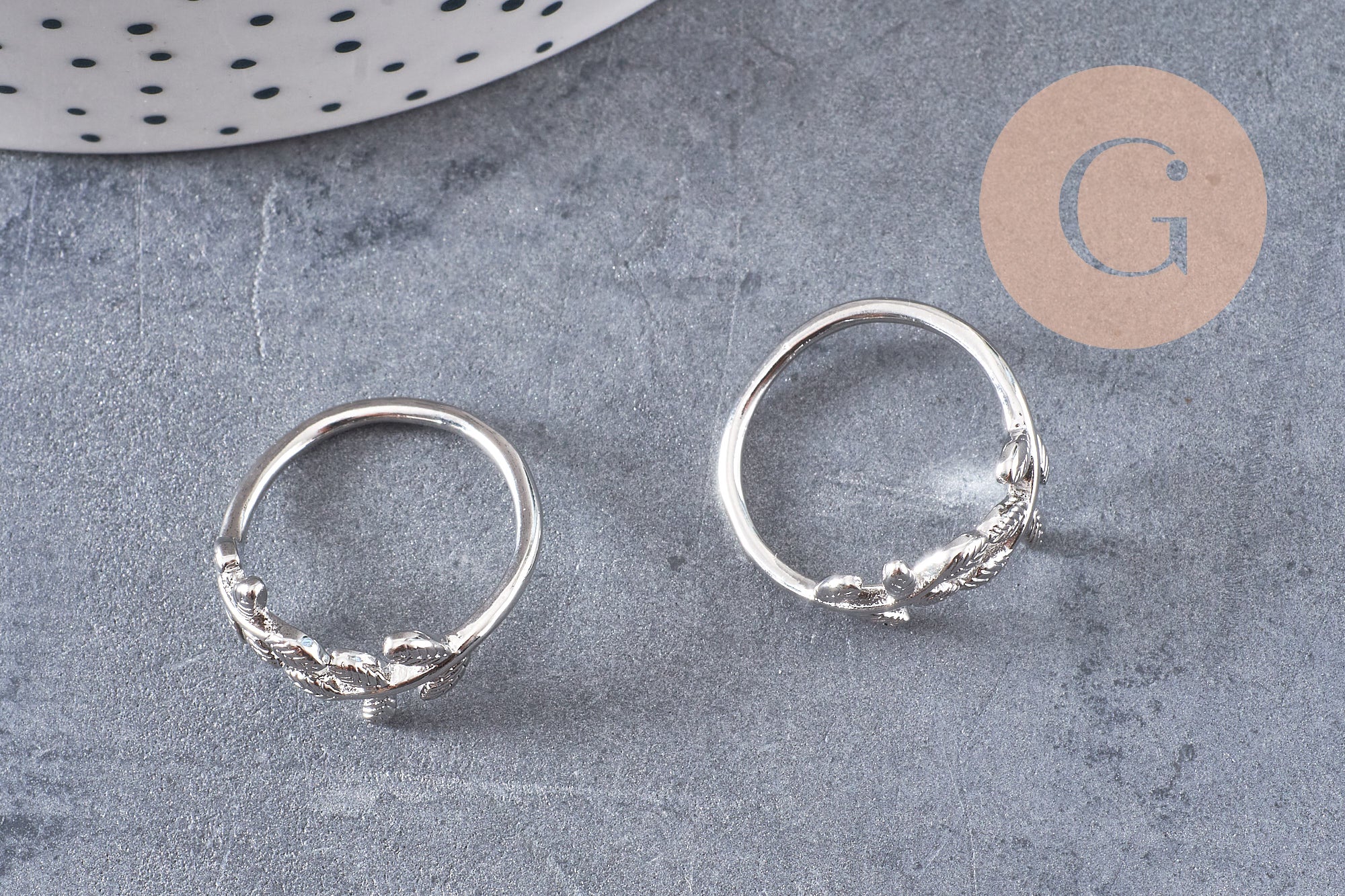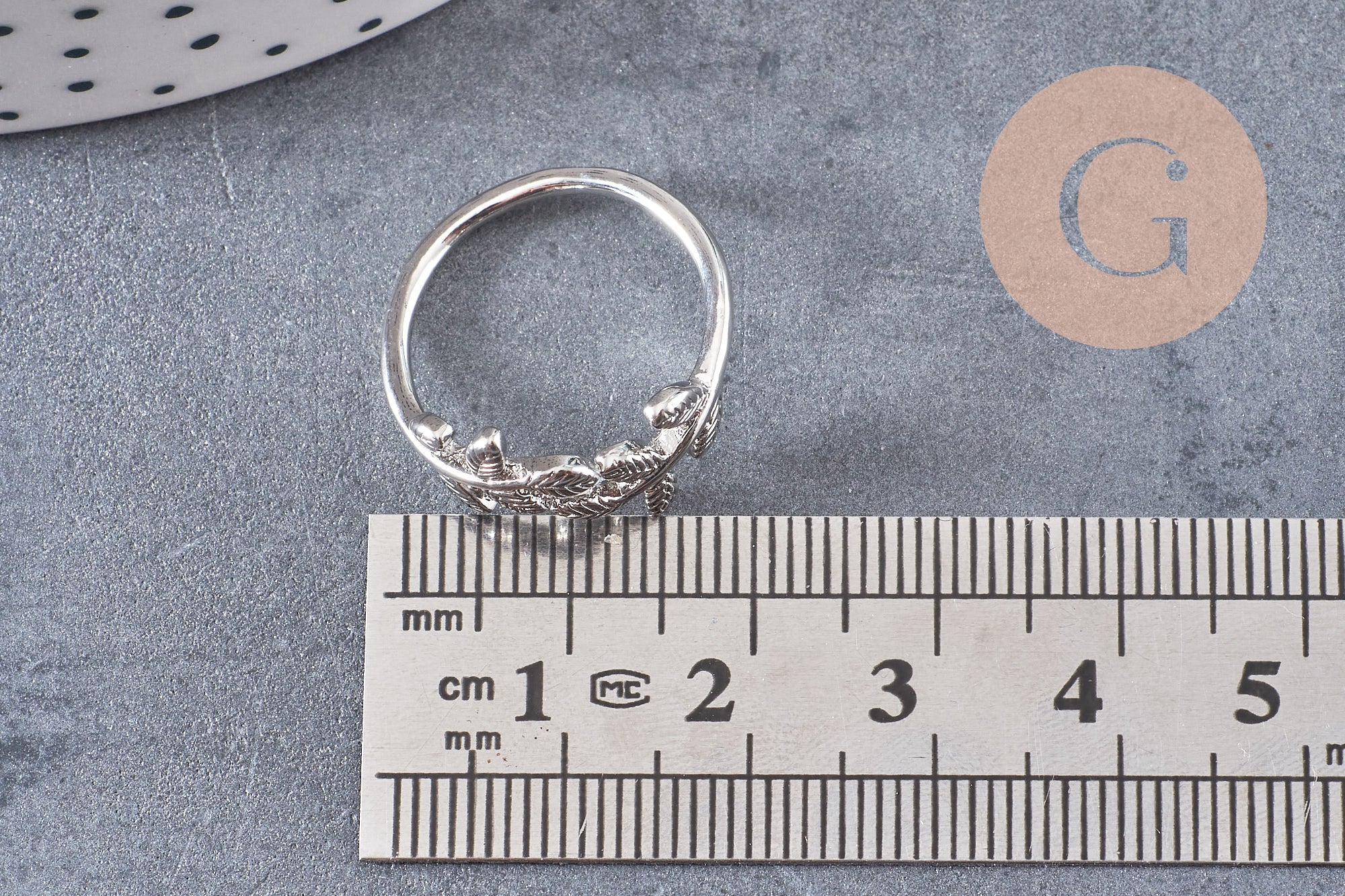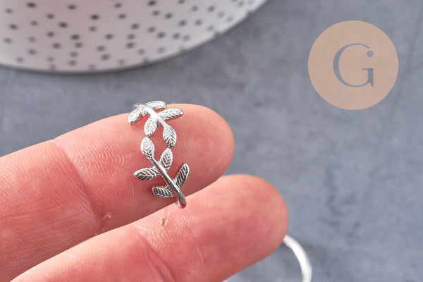 Un hermoso porta anillo ajustable de metal plateado que representa una rama de hojas.