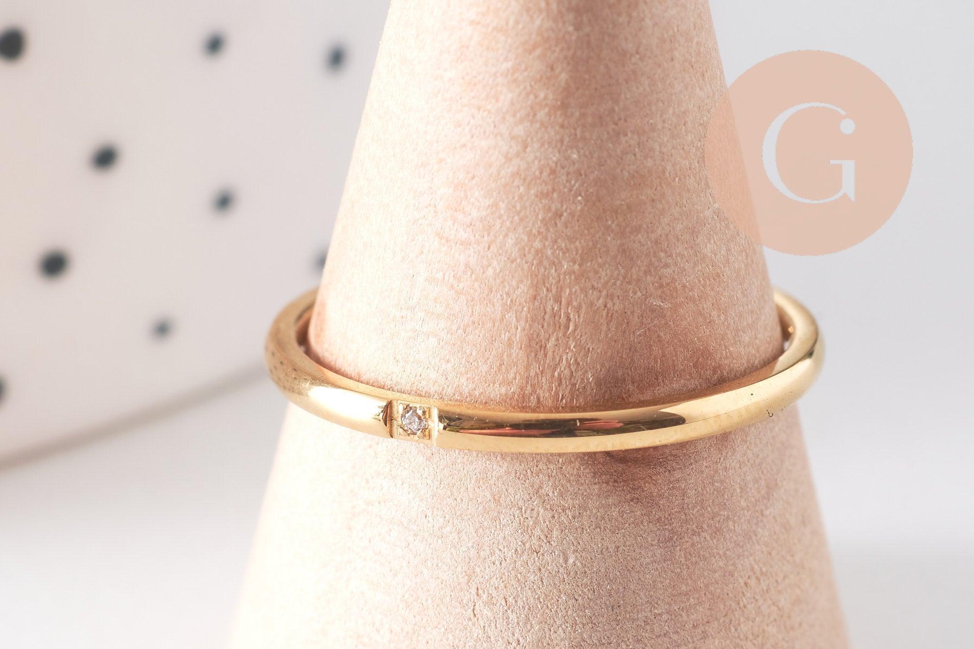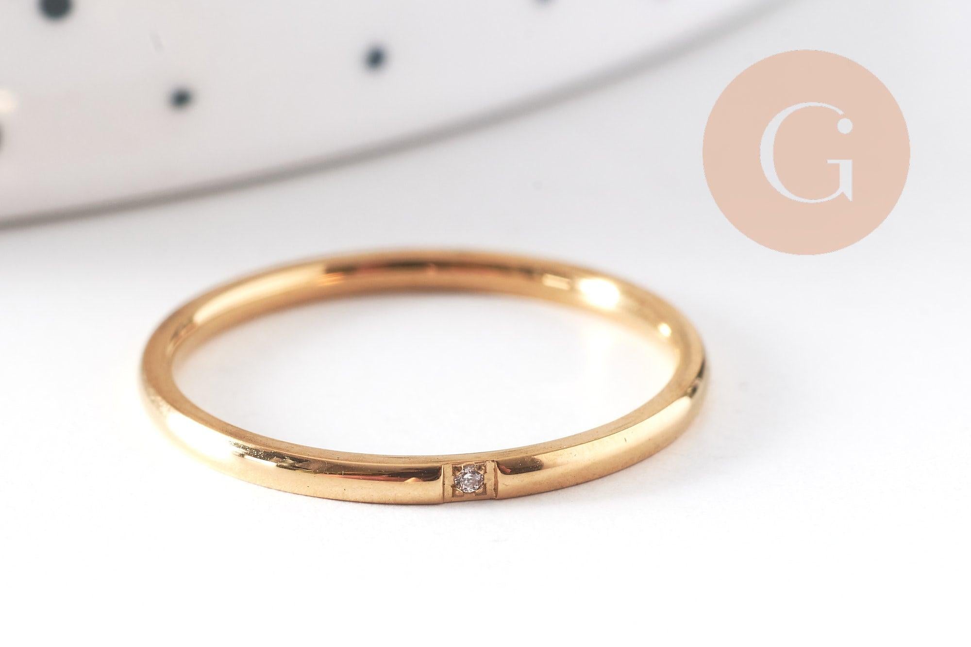 Déjate seducir por este anillo de bodas de acero inoxidable bañado en oro , realzado por una circonita blanca . Su diseño fino y refinado lo convierte en una pieza perfecta para lucir solo o en conjunto , para un look elegante e infinitamente personalizable.