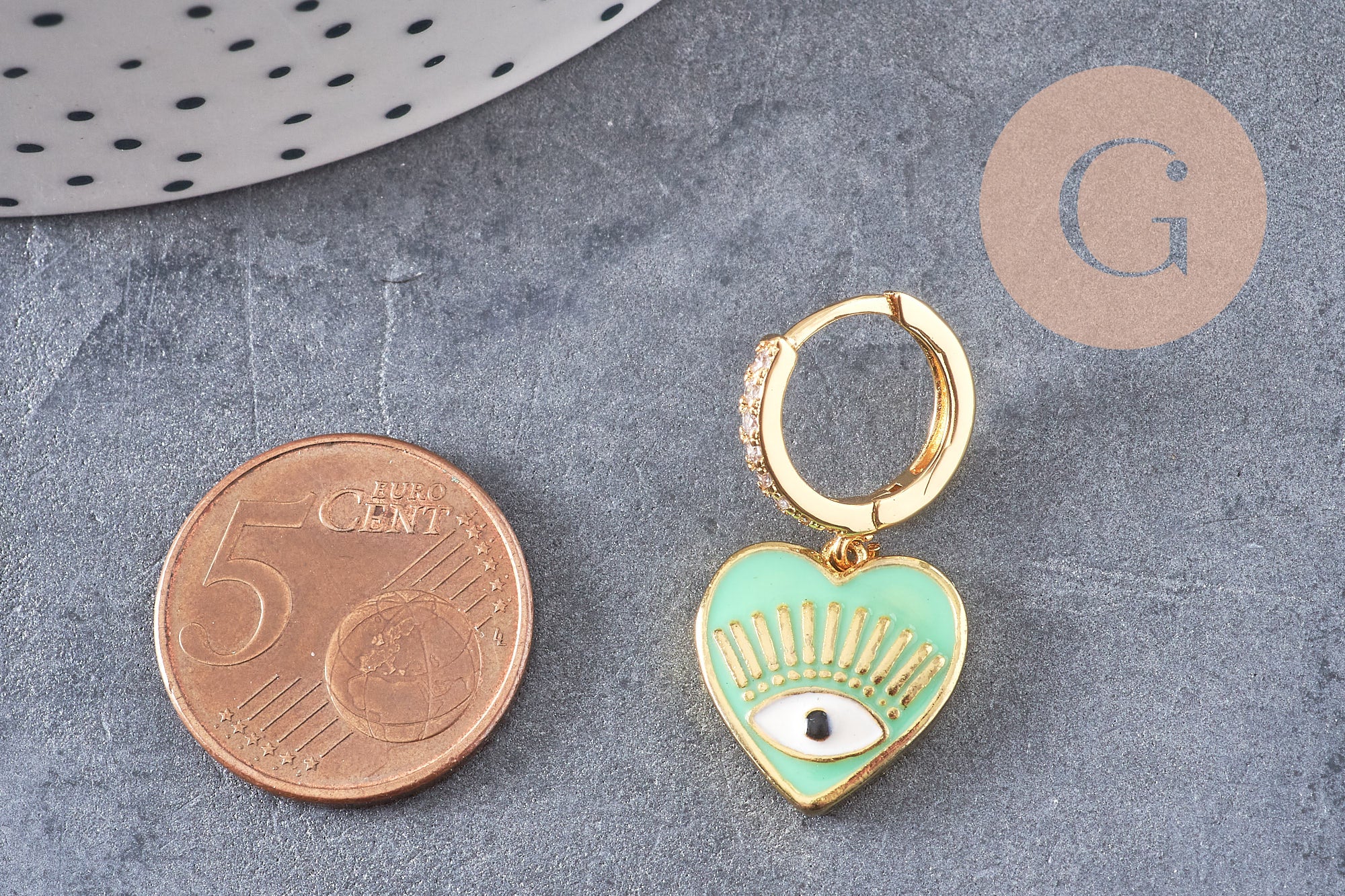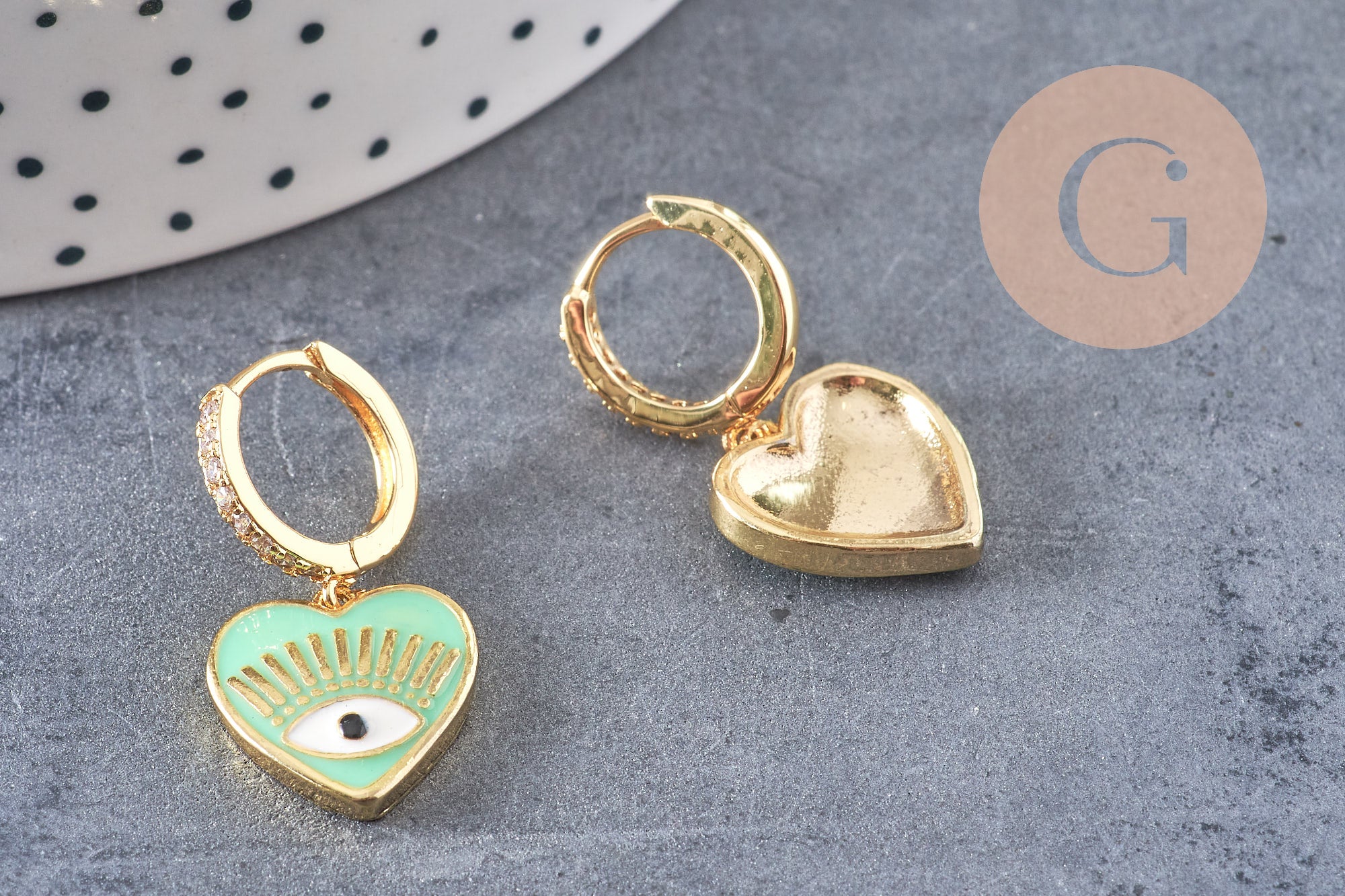 Pendientes corazón ojo protector en latón bañado en oro con esmalte, corazón con ojo malvado, par, G3775