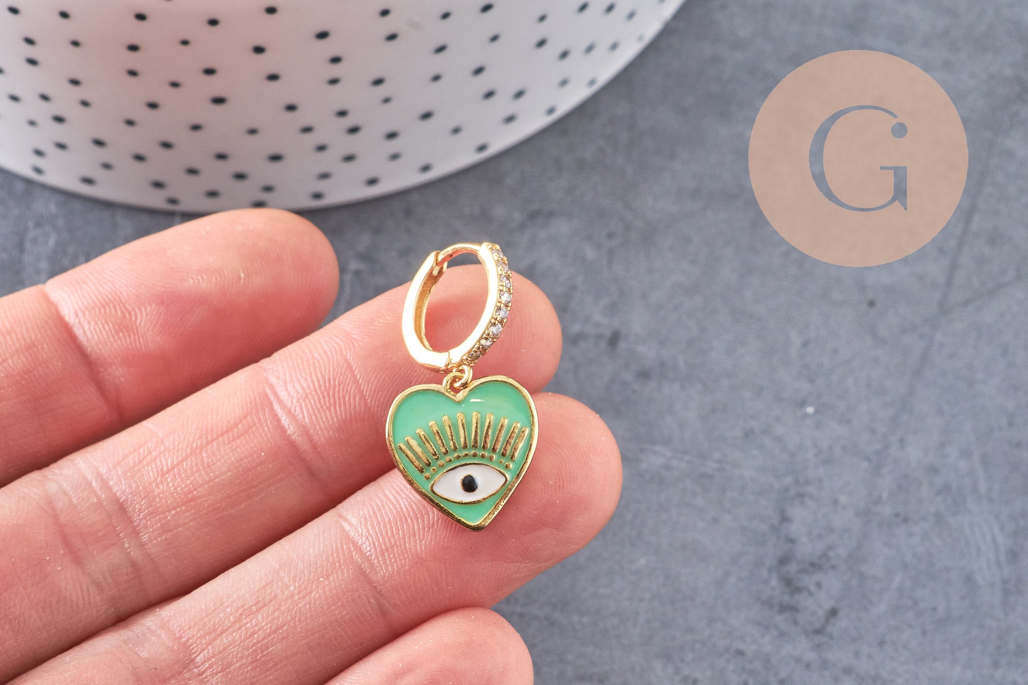 Déjate seducir por estos pendientes de corazón decorados con un ojo protector y esmalte de colores.