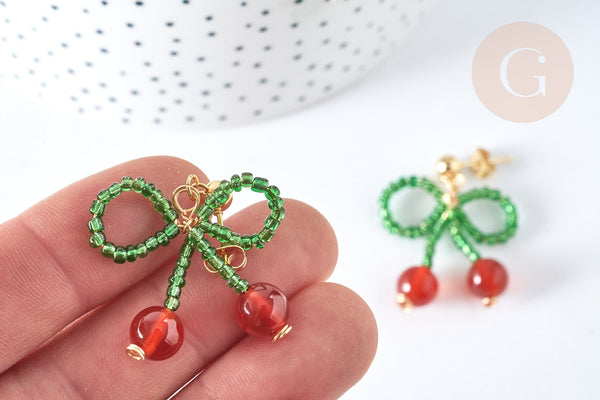 Boucles puces cerise agate rouge perles rocaille acier 304 doré 33mm, la paire (G7477)