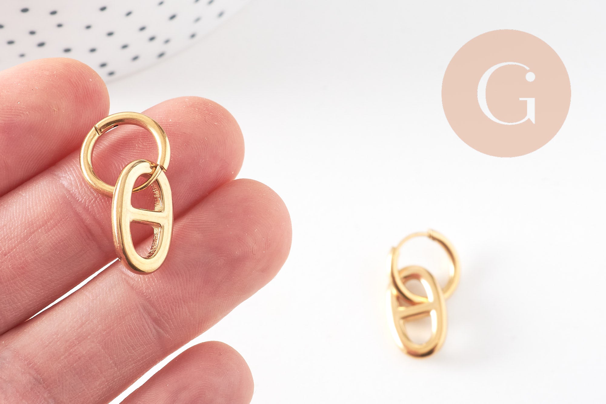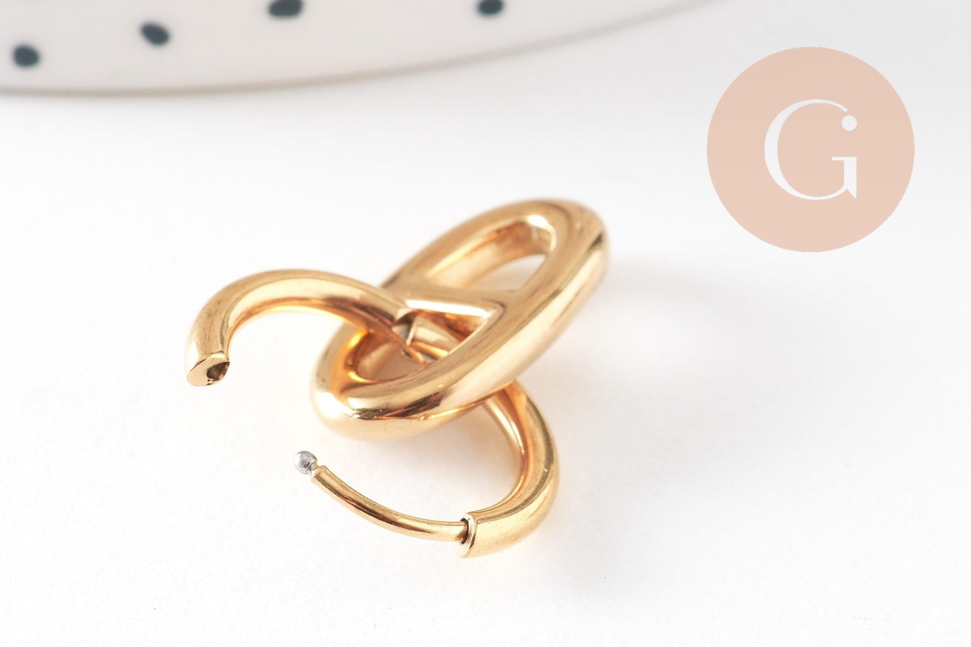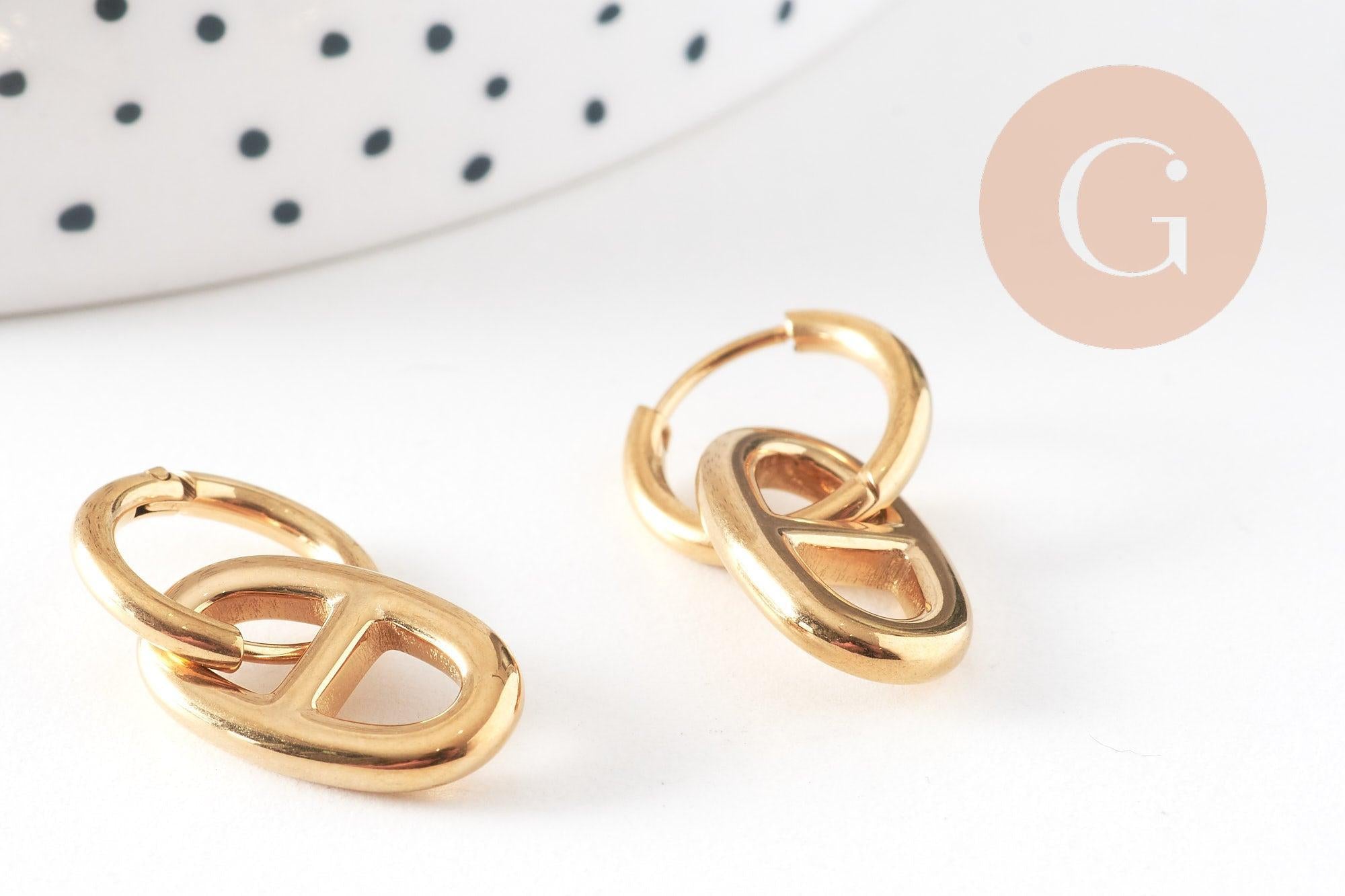 Añade un toque moderno y elegante a tus creaciones DIY con este par de aros intercambiables de acero inoxidable en tono dorado , adornados con un motivo de eslabón marino . Gracias a su ingenioso diseño, podrás colgar fácilmente en ellos dijes, cuentas o colgantes para crear joyas personalizadas según tus deseos.
