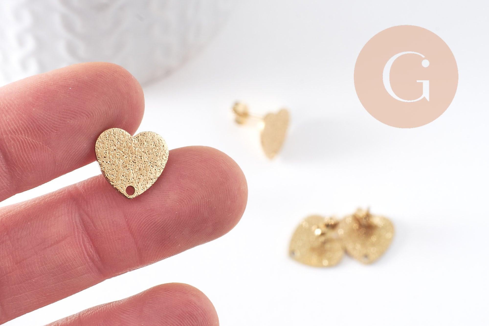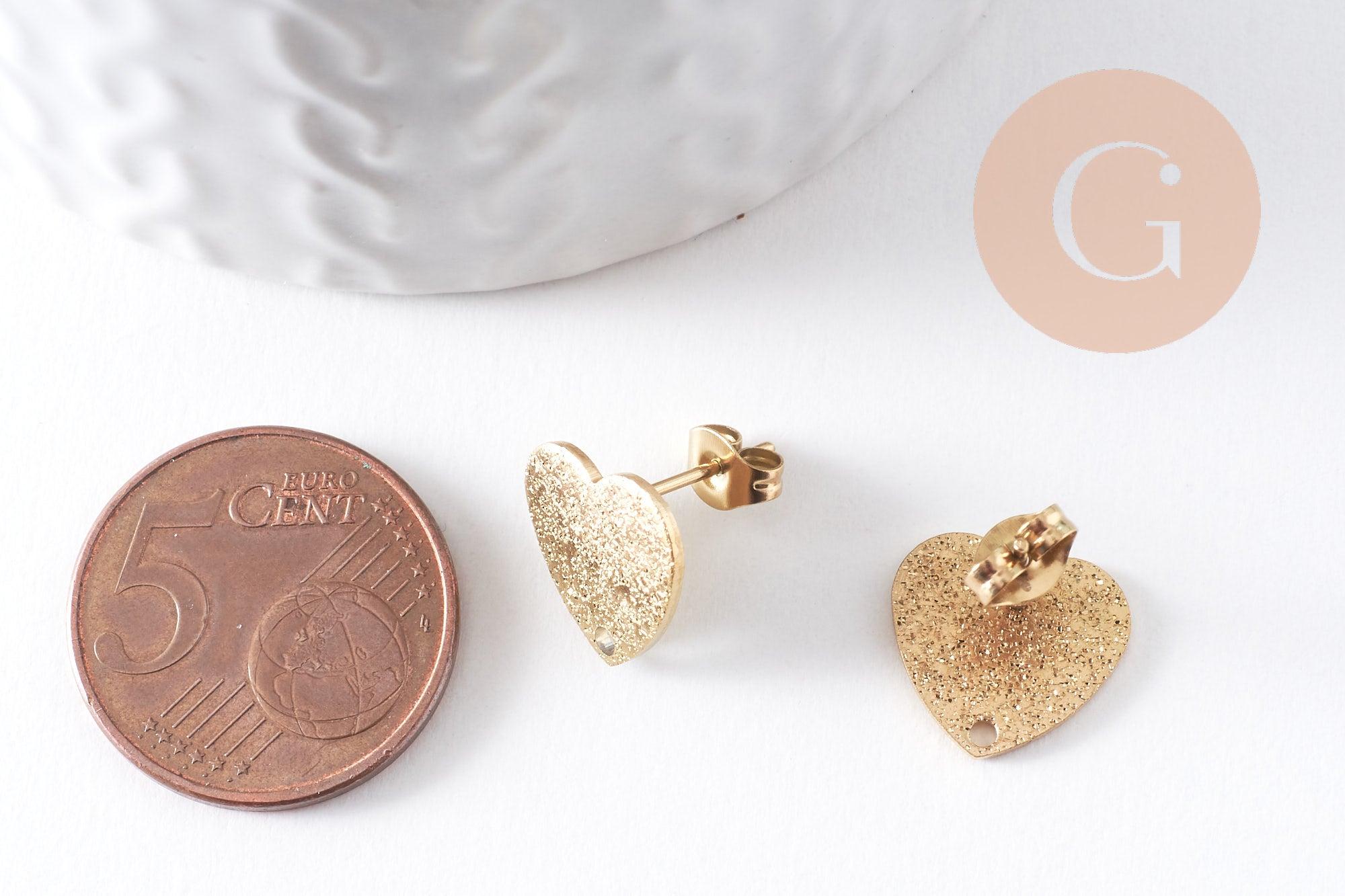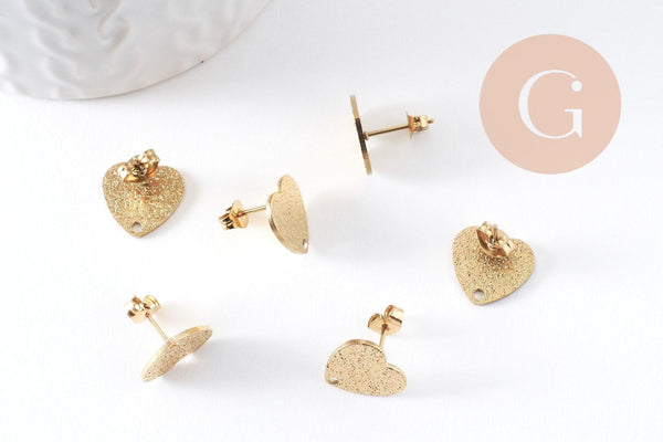 Clous-puces oreille coeur acier 304 inoxydable dore IP sablé 1 trou 13mm, la paire (G10371)