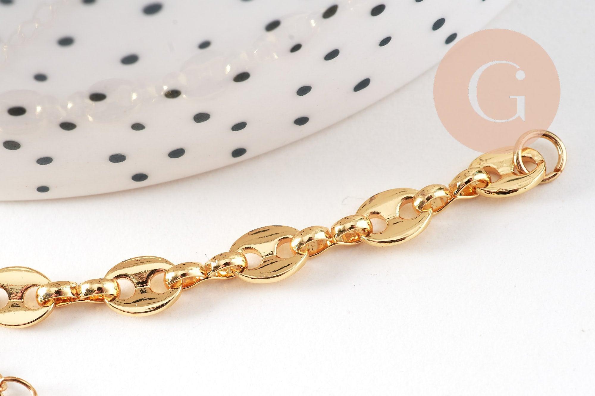 Déjate seducir por esta base de malla con diseño de grano de café en latón chapado en oro de 14k, ¡ imprescindible para personalizarla según tus deseos creativos! Equipada con un cierre de mosquetón de acero inoxidable 304 y una cadena de extensión de 6 cm, se ajusta fácilmente a muñecas de todos los tamaños. Elegante, atemporal y muy actual, es la base ideal para crear bisutería DIY elegante y duradera.