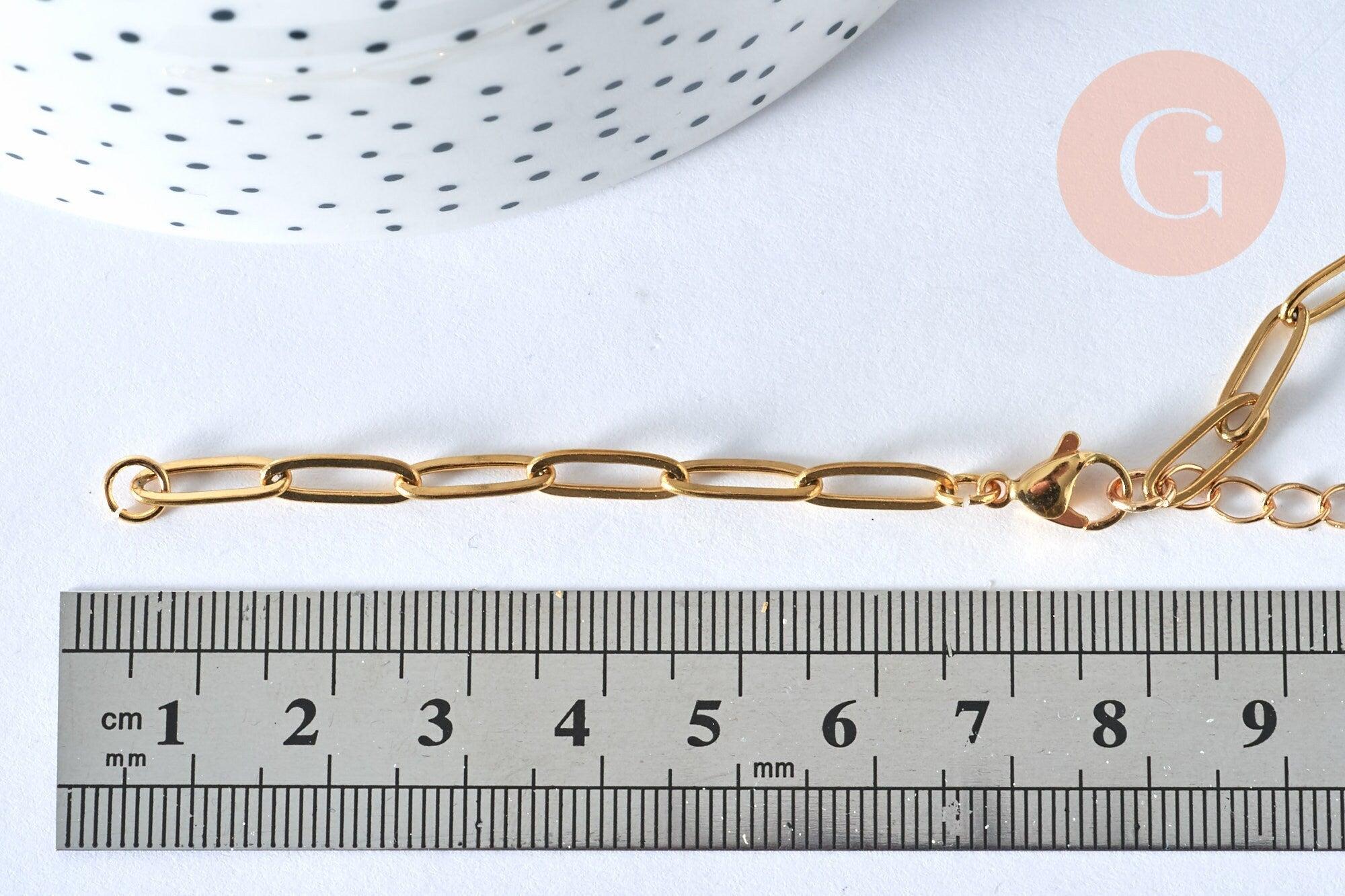 Esta pulsera con base de clip de malla rectangular en acero chapado en oro de 14k es ajustable gracias a su extensión y su cadena personalizable con sus dos anillos al final de la cadena para personalizar mediante un colgante de conector.