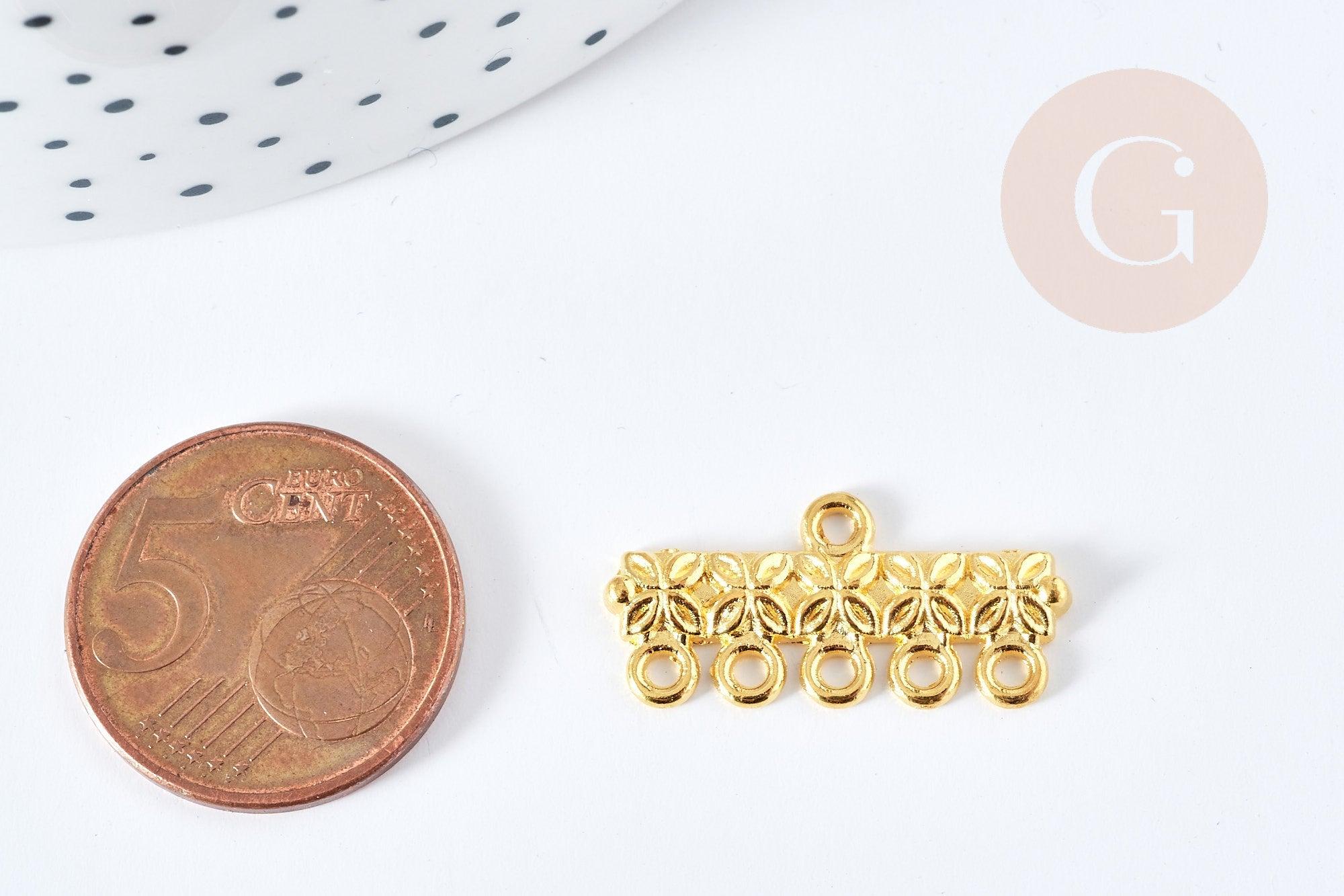 Haga bisutería única con este colgante espaciador de oro, equipado con 5 anillos cerrados para suspender una variedad de componentes.