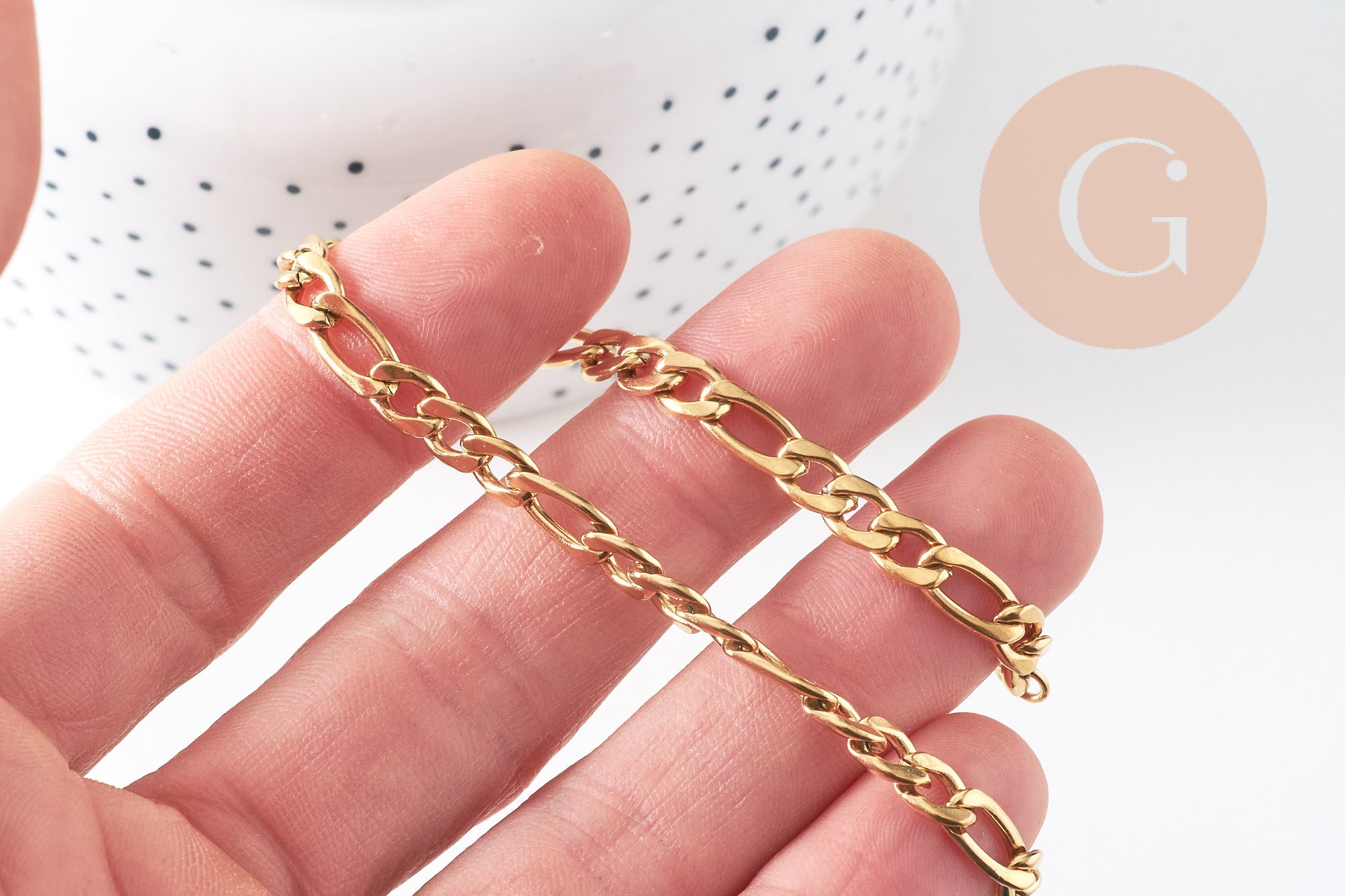 Pulsera grande de malla figaro, acero bañado en oro de 14k, creación de joyas, pulsera de acero inoxidable bañada en oro, sin níquel, 20cm