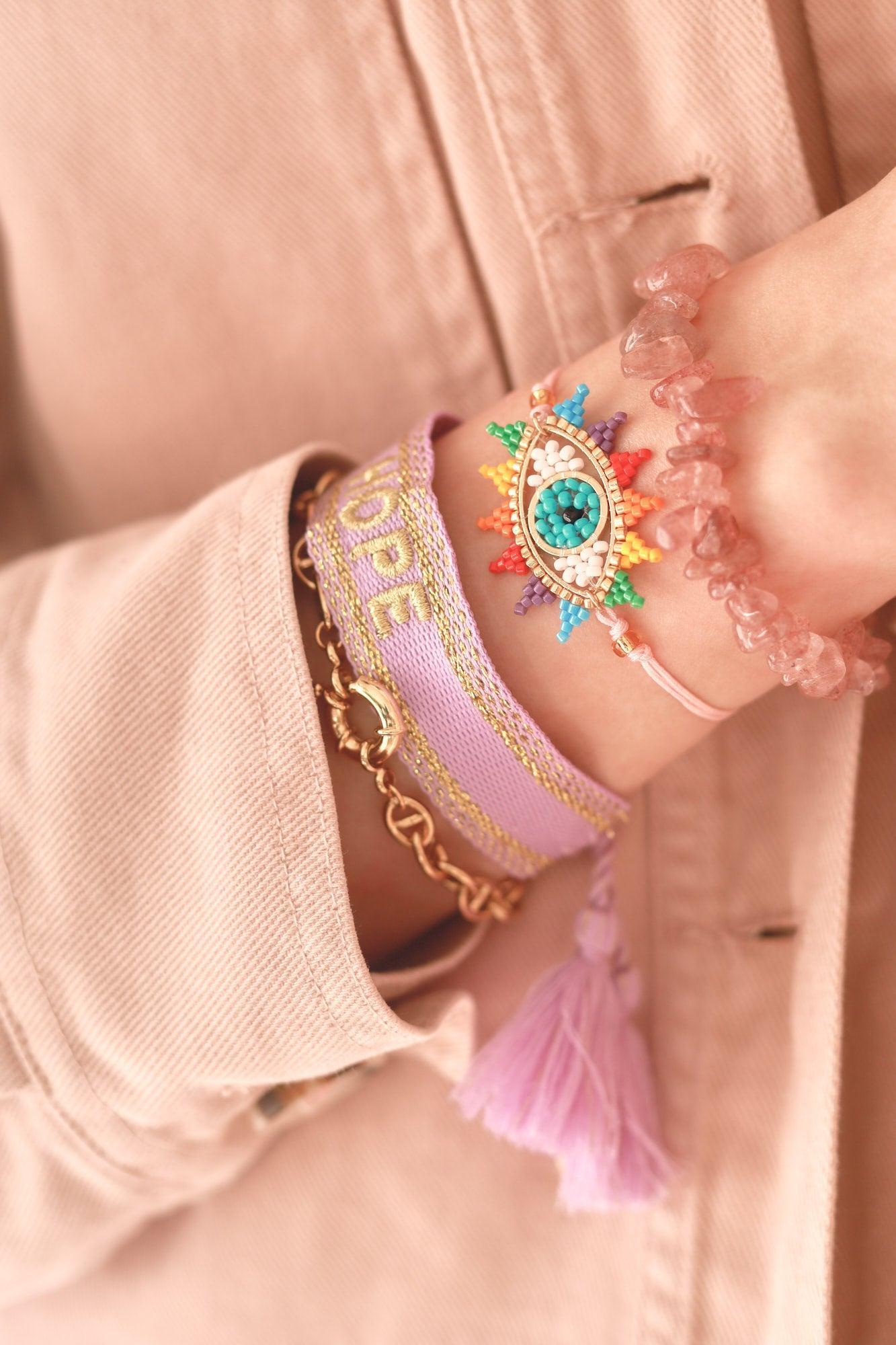 La firma HOPE o J'ADORE está bordada en la parte frontal de la pulsera, lo que le da un toque de encanto. El cierre deslizante con borla permite un ajuste fácil y cómodo para muñecas de todos los tamaños.