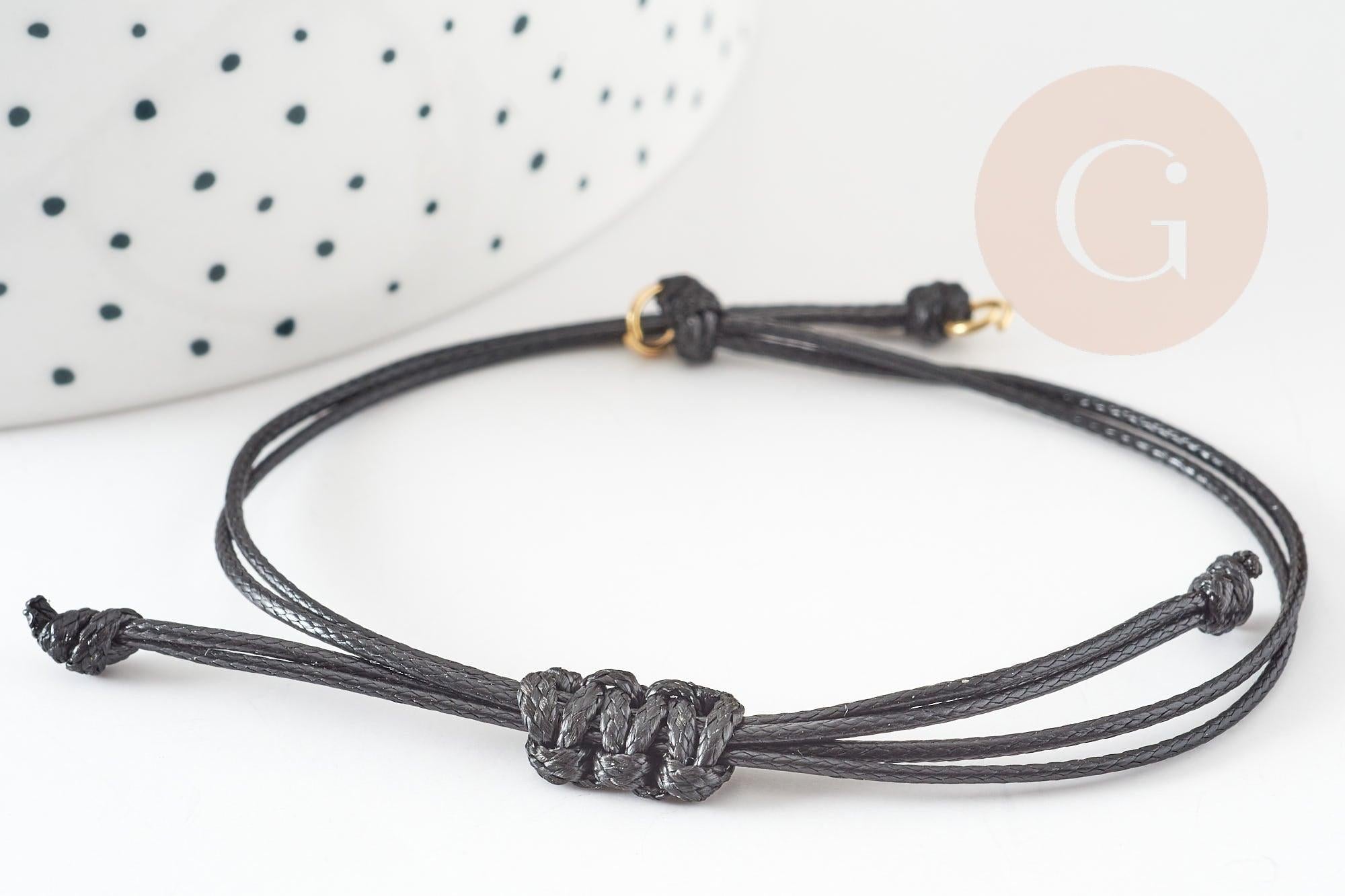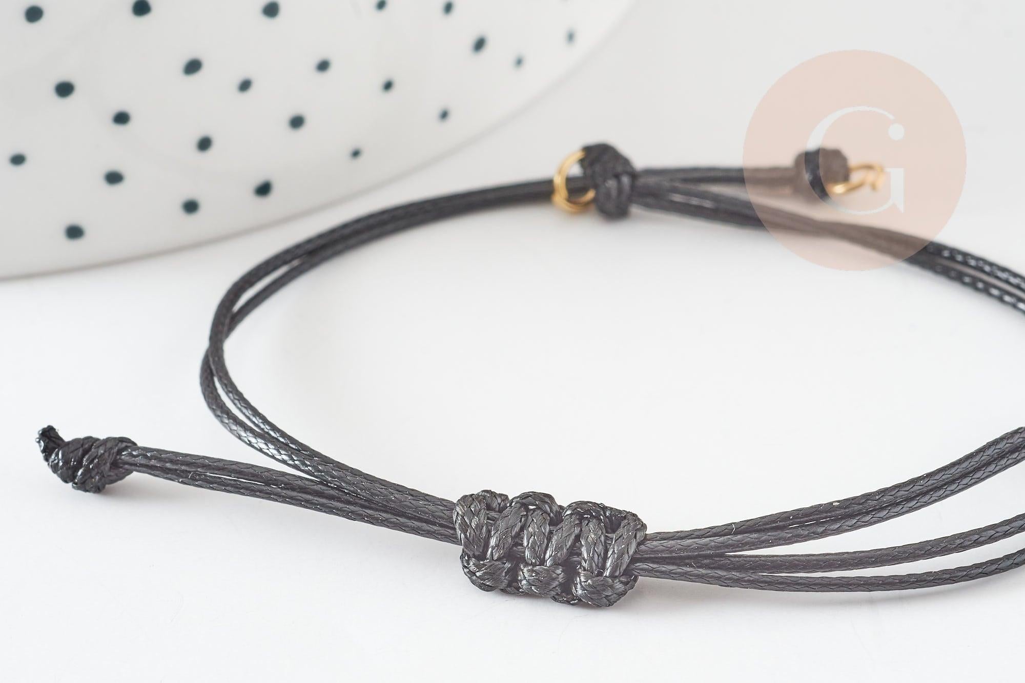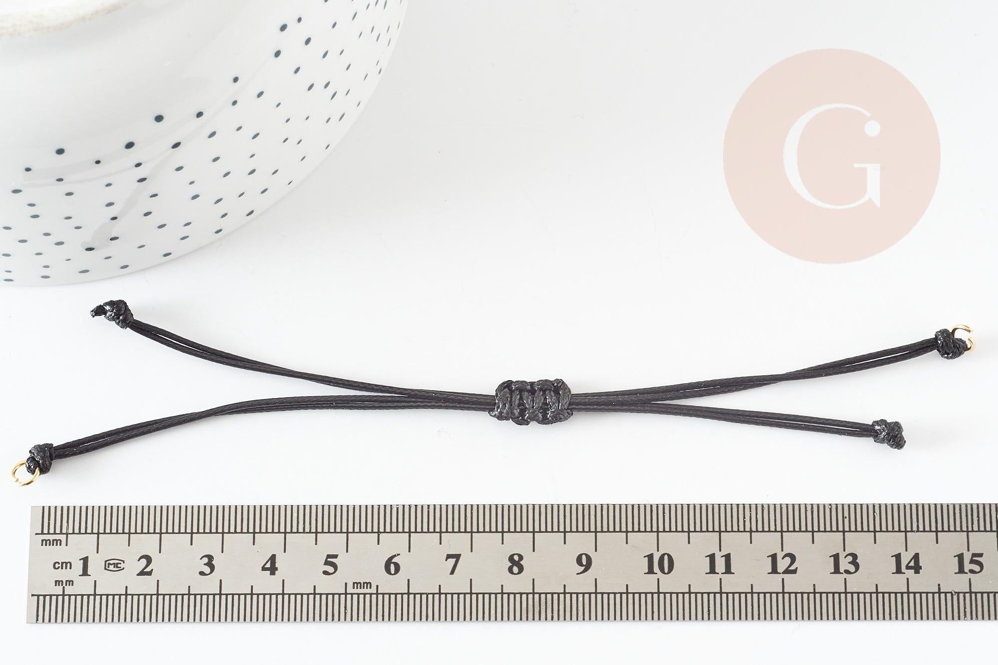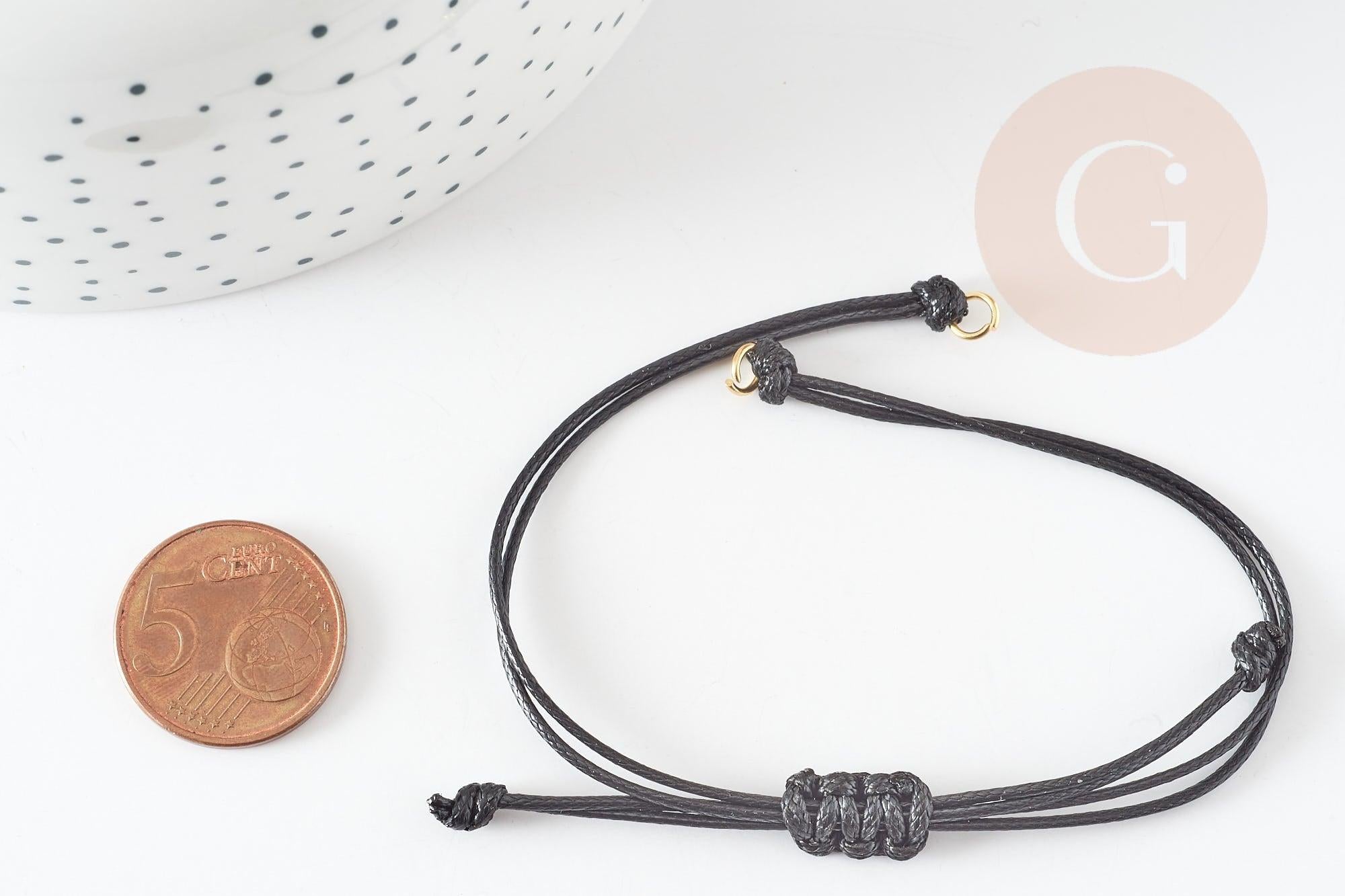 Esta base de pulsera ajustable de cordón encerado en oro negro con sus anillos dorados de acero inoxidable es ajustable gracias a su nudo corredizo.