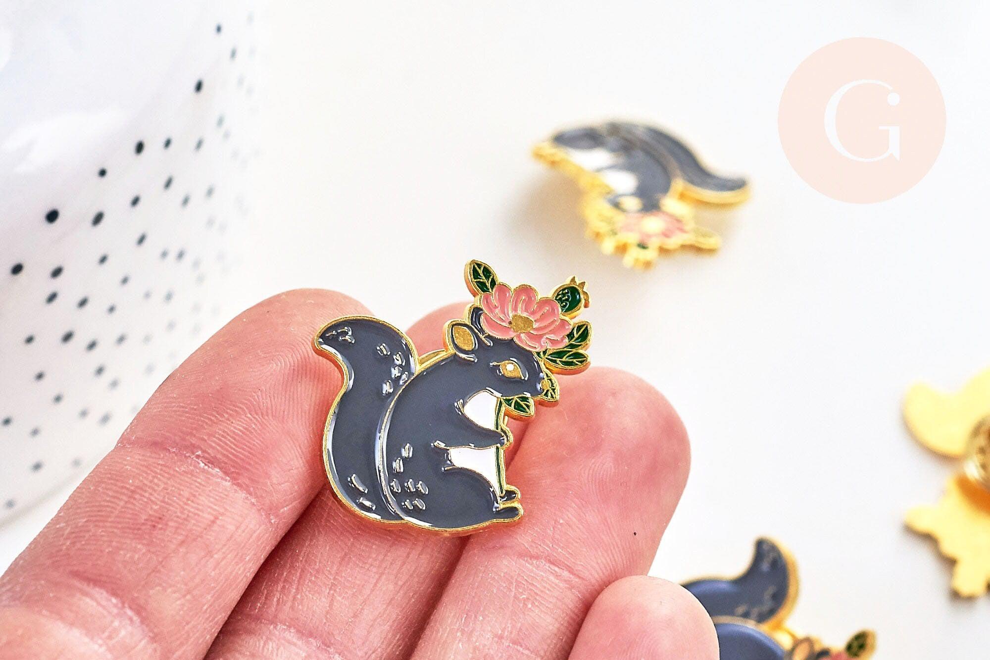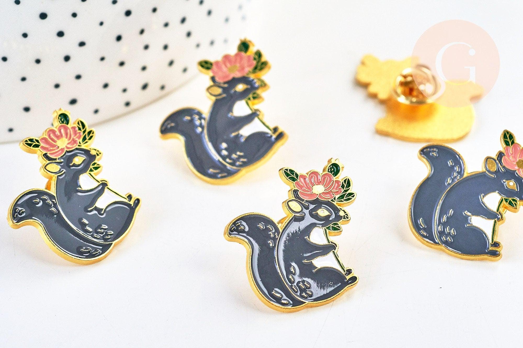 Gingerlily te invita a enamorarte de este encantador broche / pin que representa una ardilla decorada con un motivo floral, en zamac dorado y esmalte de colores.