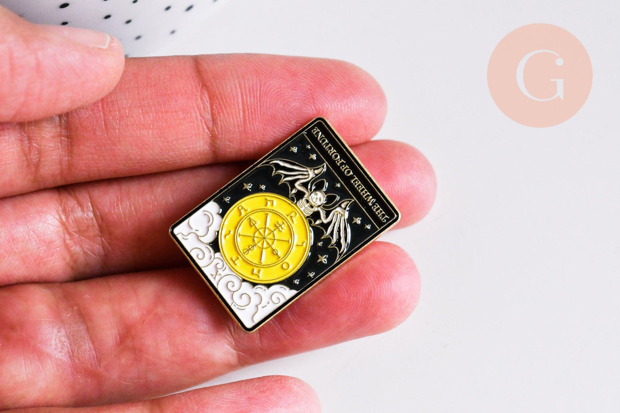 Te ofrecemos este encantador Broche Pin del arcano X de La Rueda de la Fortuna , del tarot de Marsella, motivo místico de amuleto de la suerte, en zamac dorado y esmalte de color.