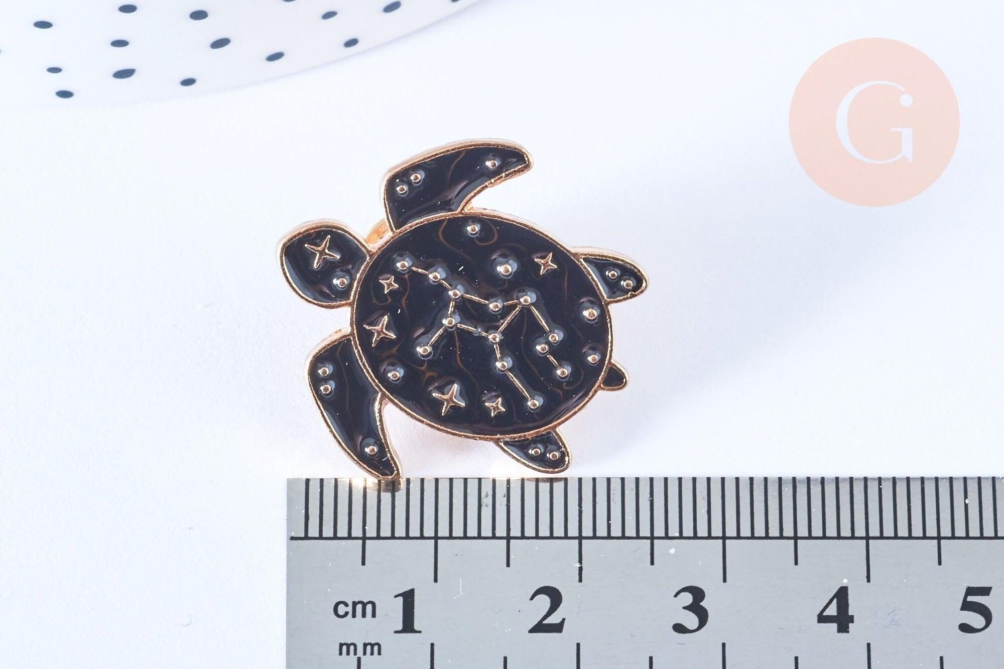 Te ofrecemos este encantador broche / pin representando una adorable tortuga decorada con un motivo místico negro con fondo estrellado, en zamac dorado y esmalte de color.