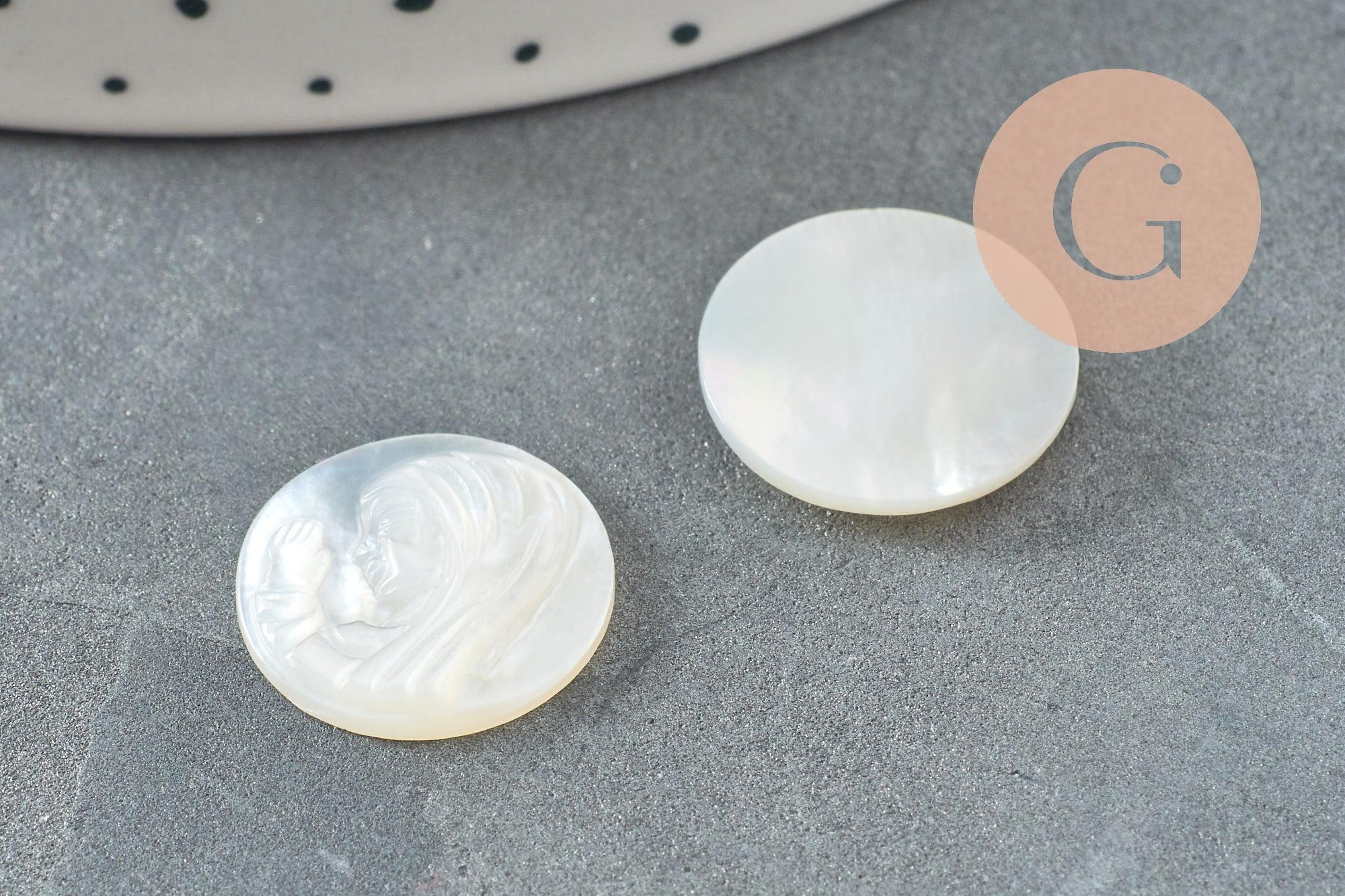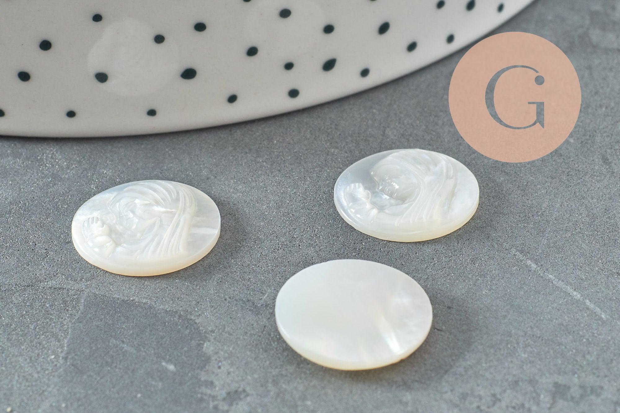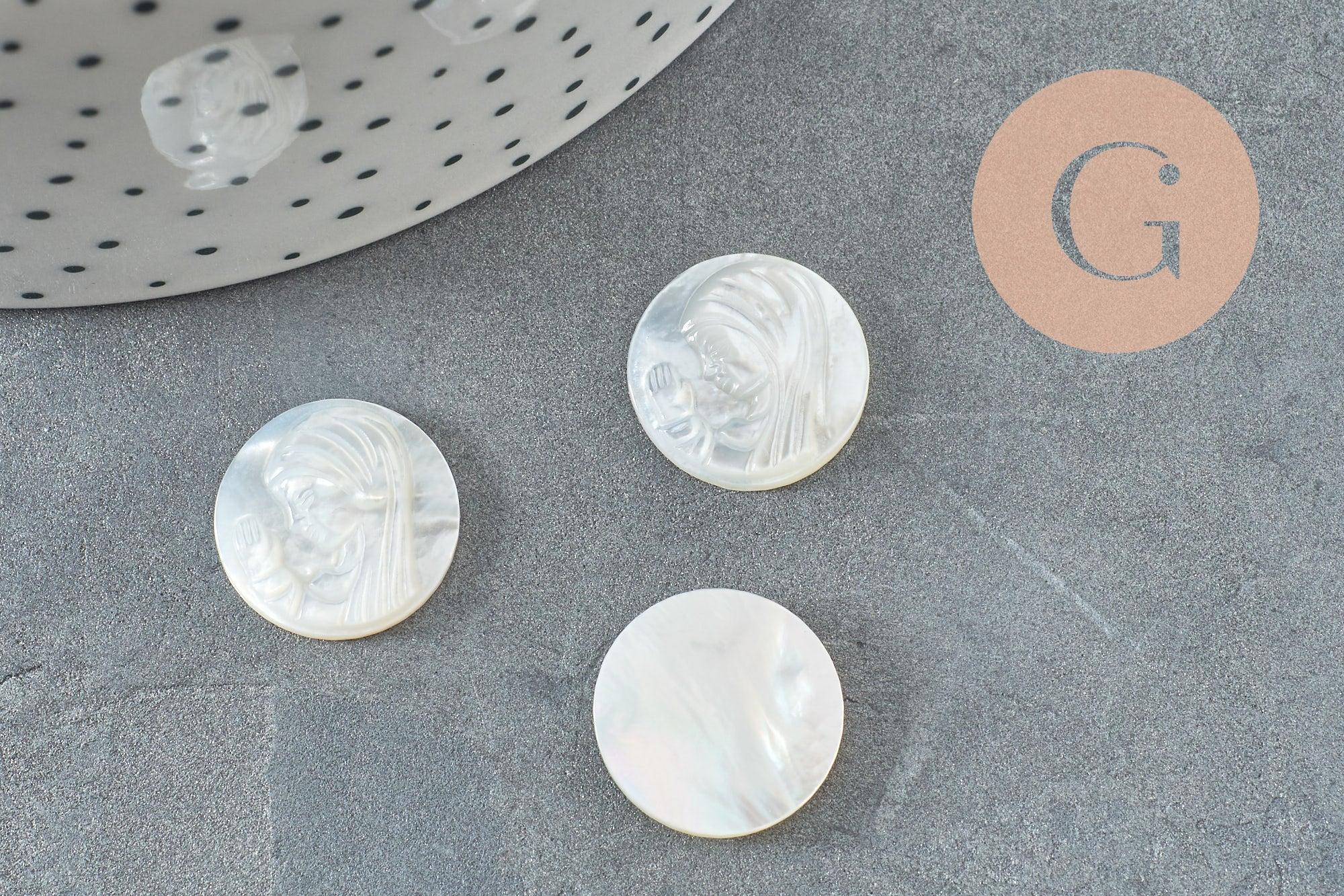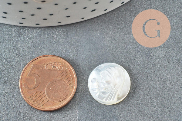 Realza tus creaciones de bisutería DIY con este cabujón redondo en nácar blanco natural grabado representando a la Virgen María , inspirado en la medalla milagrosa .