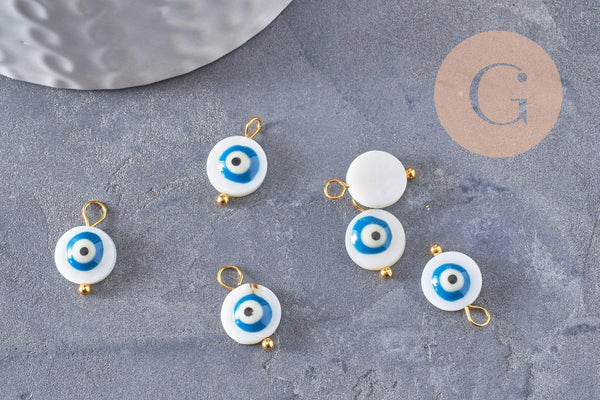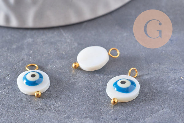 breloque ronde nacre naturelle blanche mauvais oeil zamac doré 14mm, x2 (G9922)