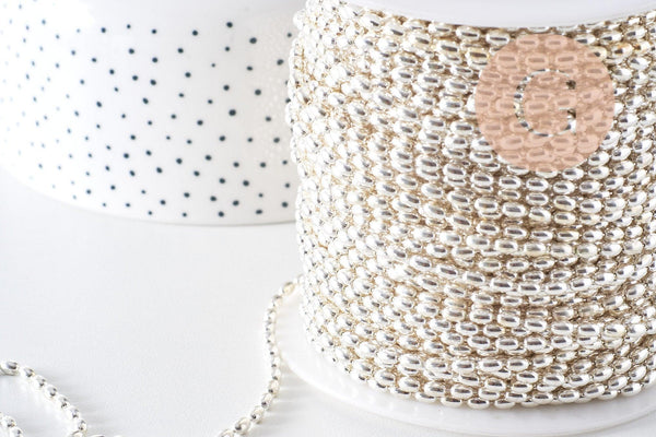 Bola fina ovalada de latón platino , perfecta para todas tus creaciones de joyería DIY. Muy femenina, esta elegante cadena está formada por pequeñas bolas unidas entre sí, ideal para collares finos, pulseras o incluso para colgar colgantes ligeros.