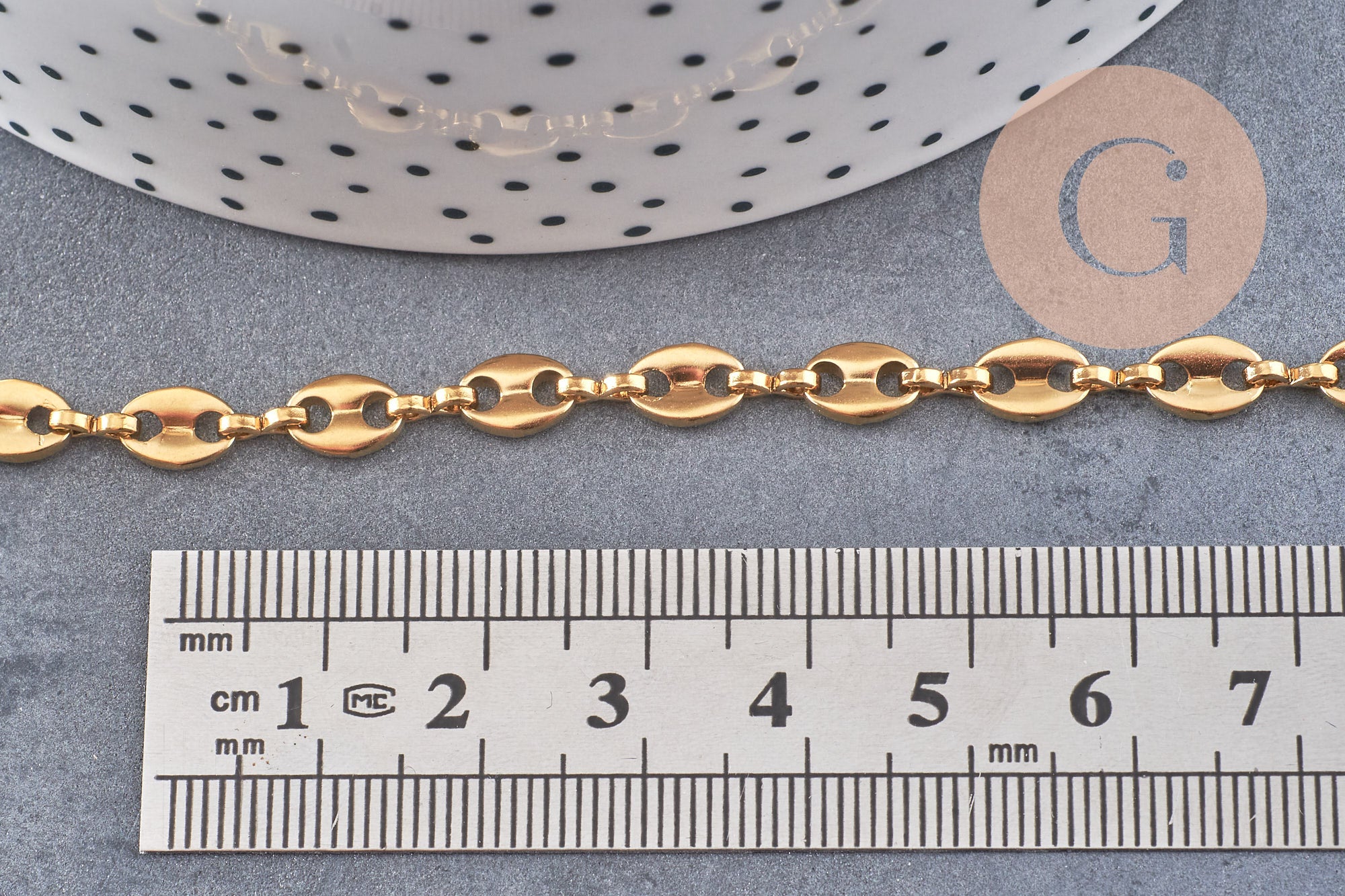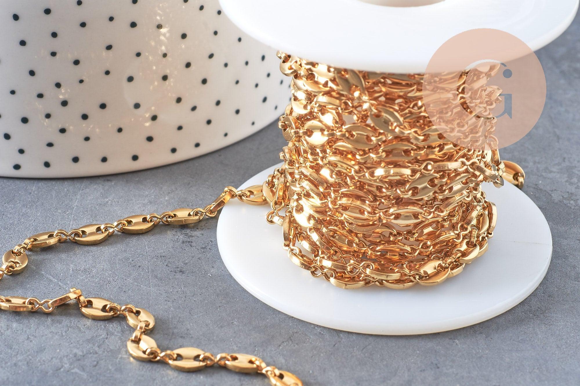 Cadena de acero inoxidable bañada en oro IP 18k, malla grano de café 7x4mm, x1 metro (G5499)