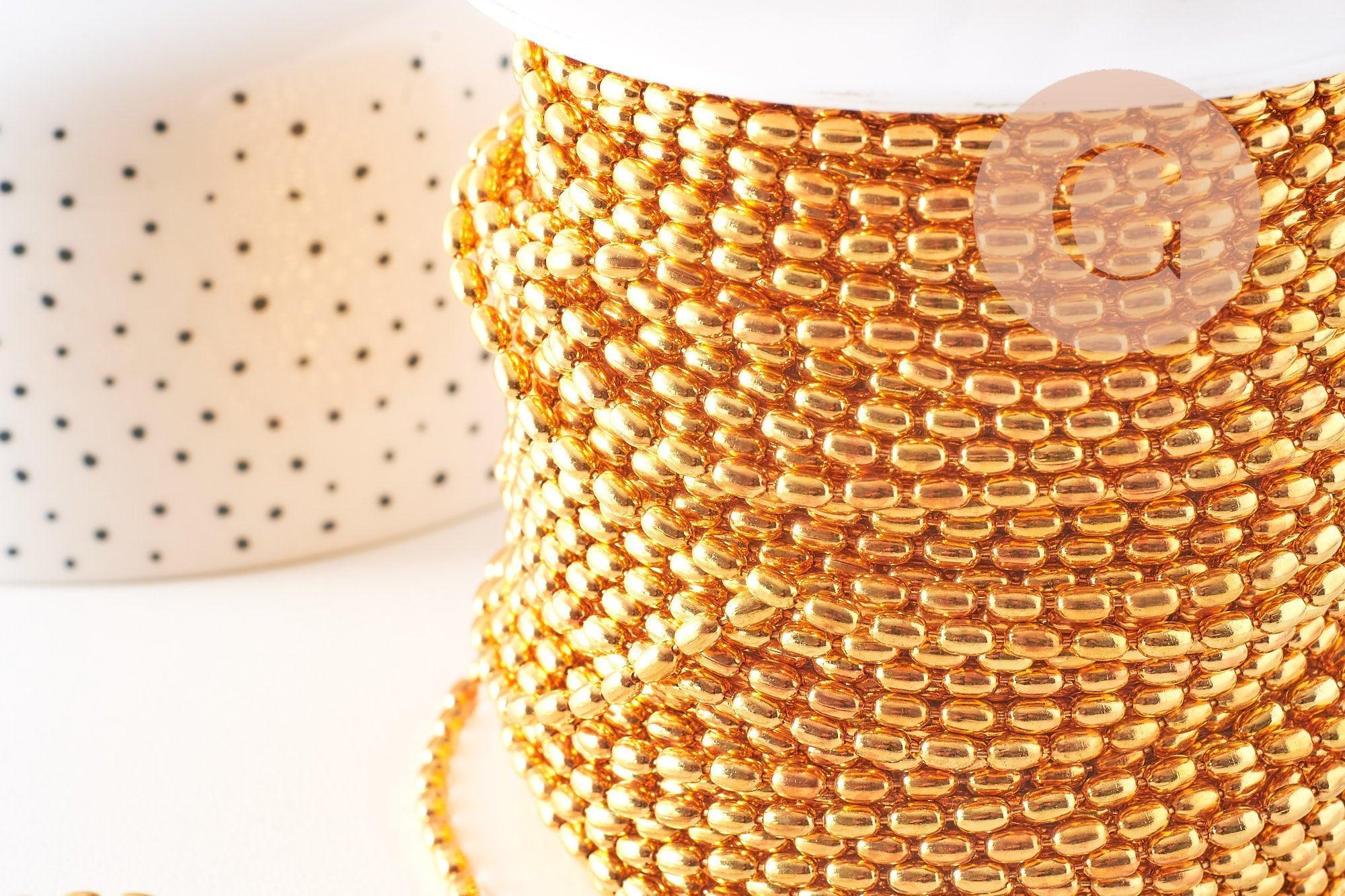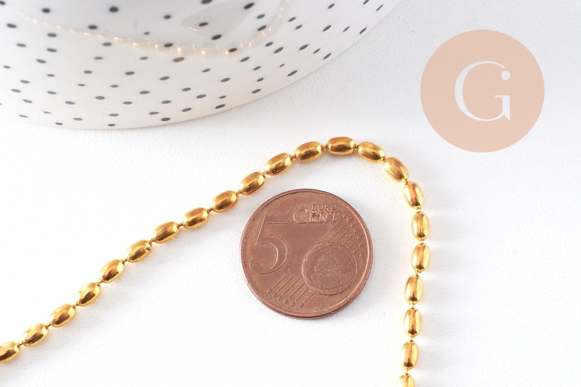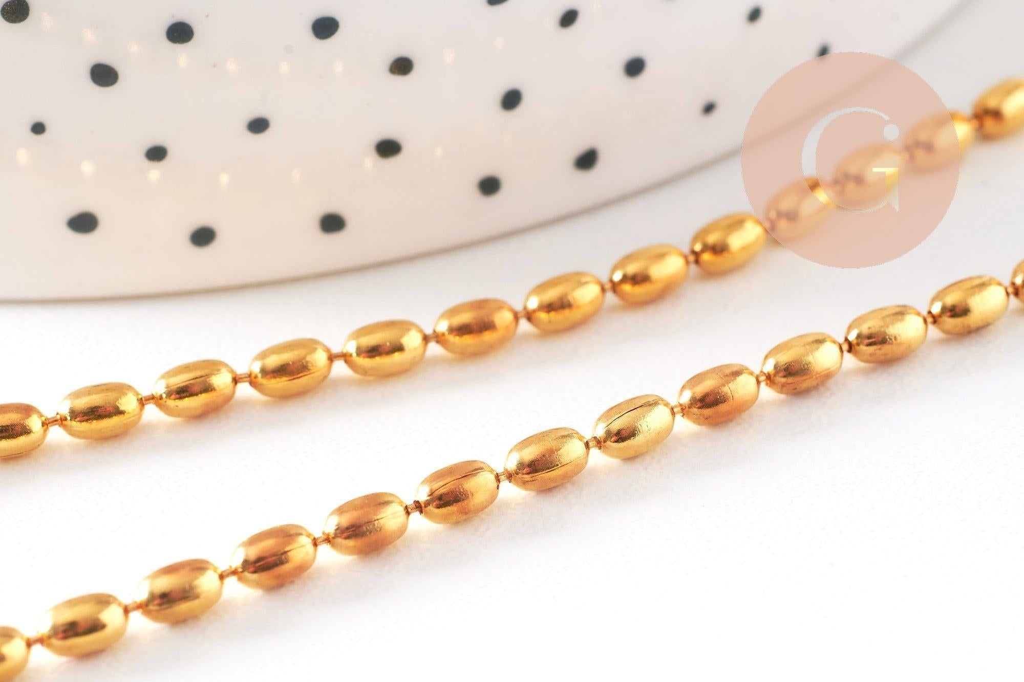 Una fina cadena de bolas ovaladas de latón bañado en oro , perfecta para todas tus creaciones de joyería DIY. Muy femenina, esta elegante cadena está formada por pequeñas bolas unidas entre sí, ideal para realizar delicados collares, refinadas pulseras o joyas en capas.