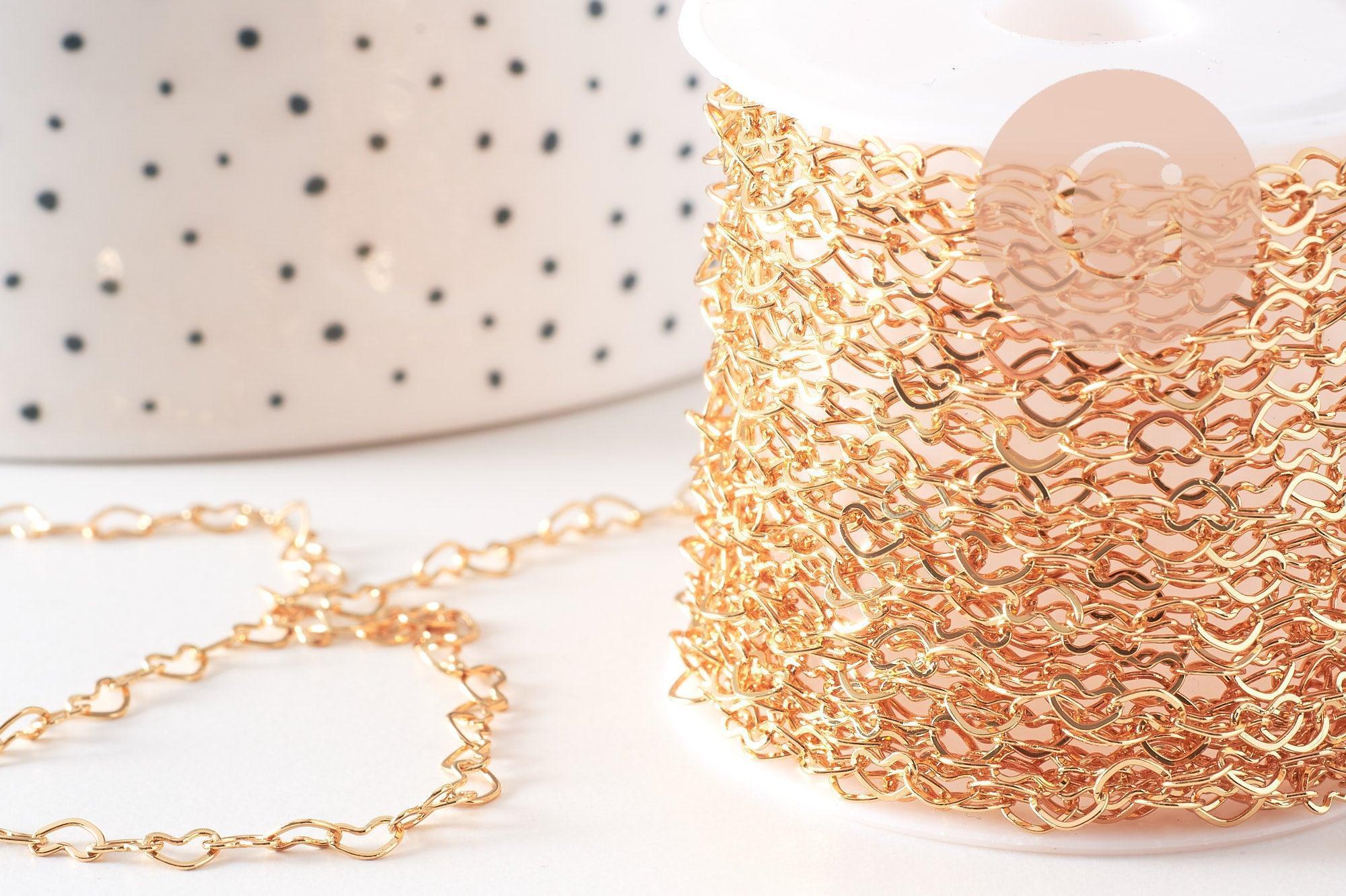 Cadena de corazón de latón bañada en oro , ideal para crear rápidamente tus propias joyas. Esta delicada cadena, con su cierre incluido, te permite crear fácilmente collares modernos. Combínala con cierres marinos grandes y medallas doradas para un estilo aún más marcado.