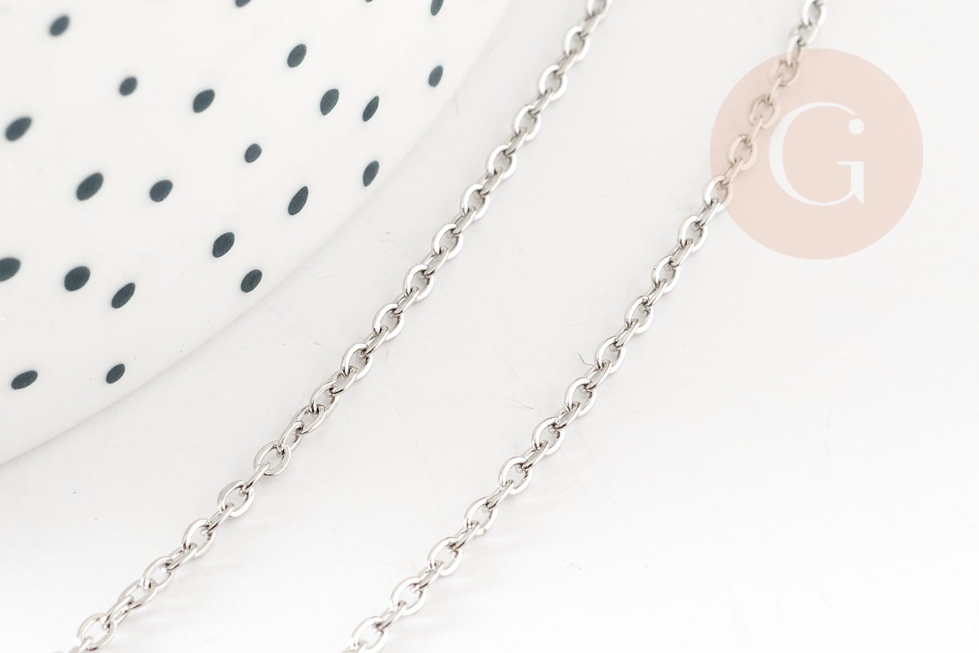 Una cadena de acero inoxidable de color platino completa con cierre. La cadena es fina y el largo es ideal para hacer collares bonitos y sin esfuerzo.