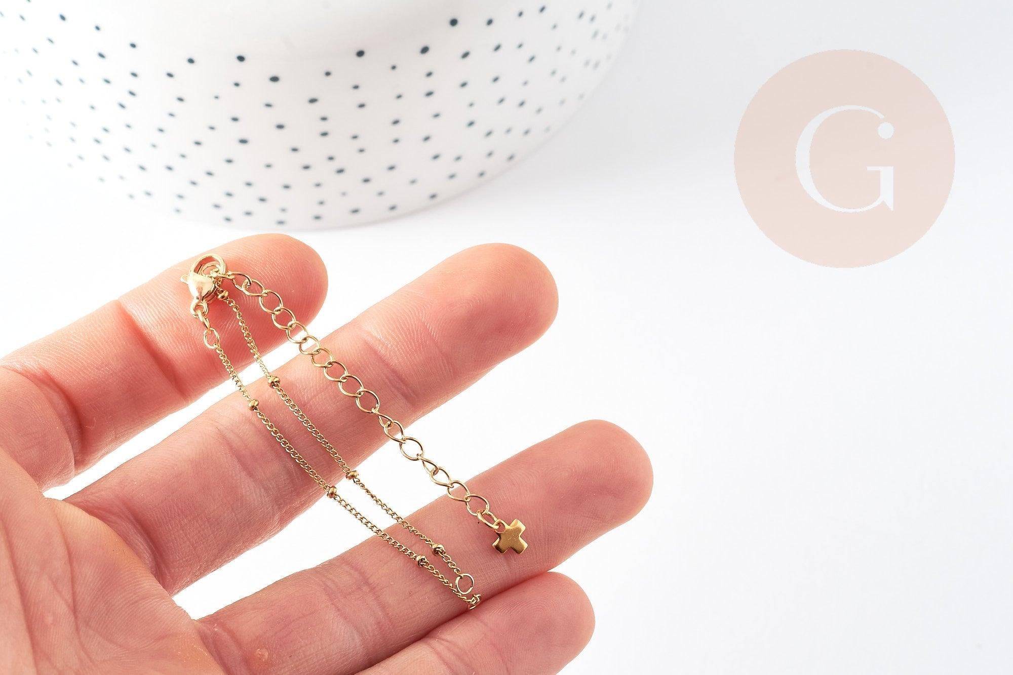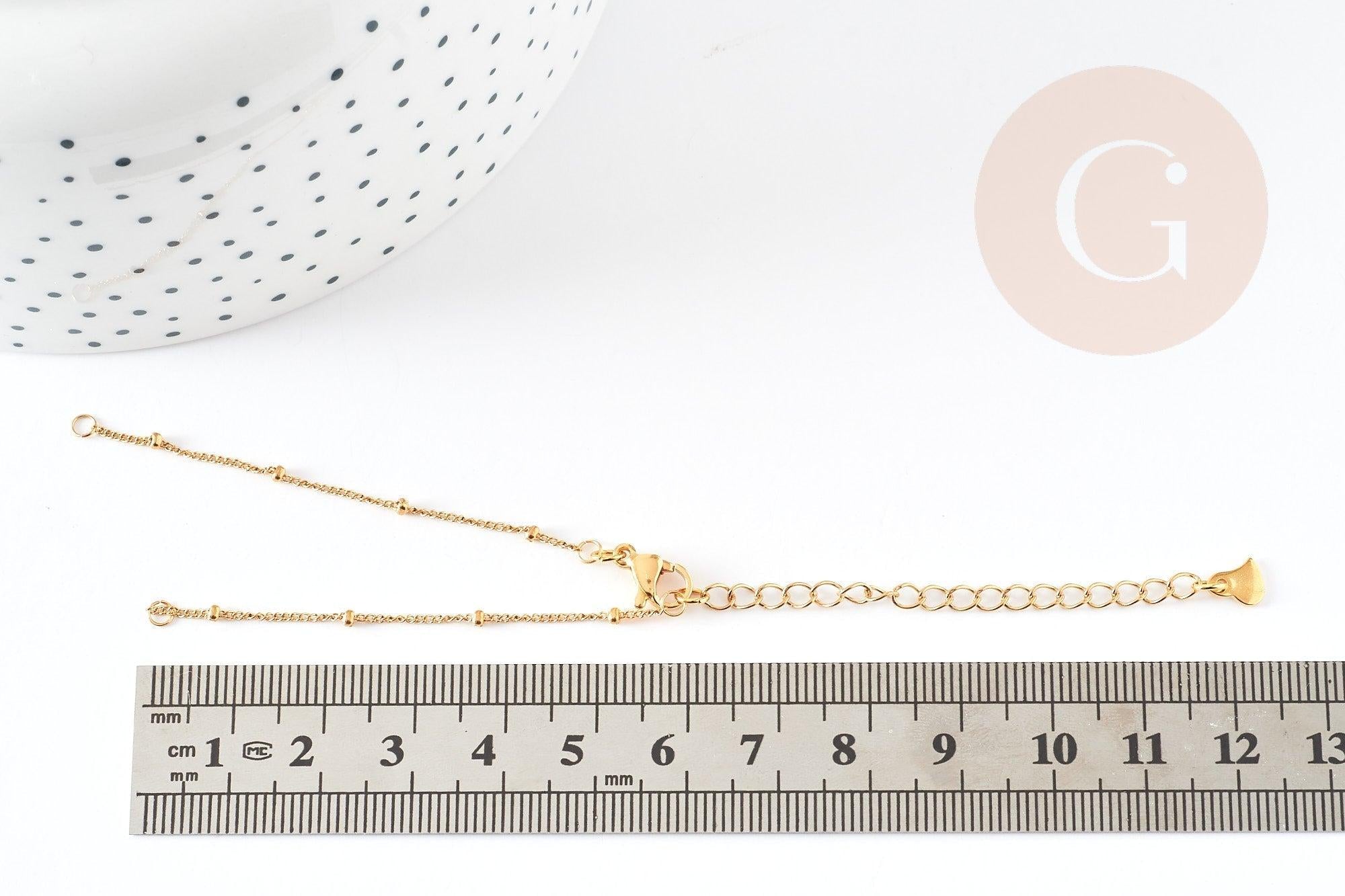 Adopte de inmediato esta base de pulsera de malla satélite en acero bañado en oro de 14k , ajustable gracias a su extensión y su cadena personalizable con sus dos anillos al final de la cadena para personalizar mediante un colgante conector.