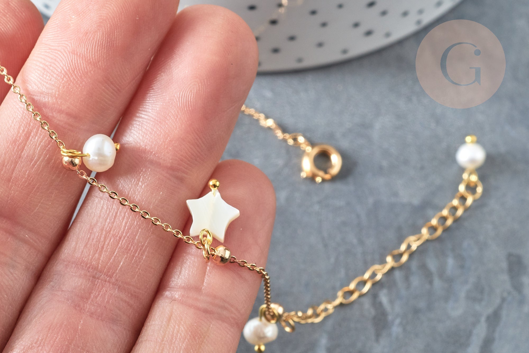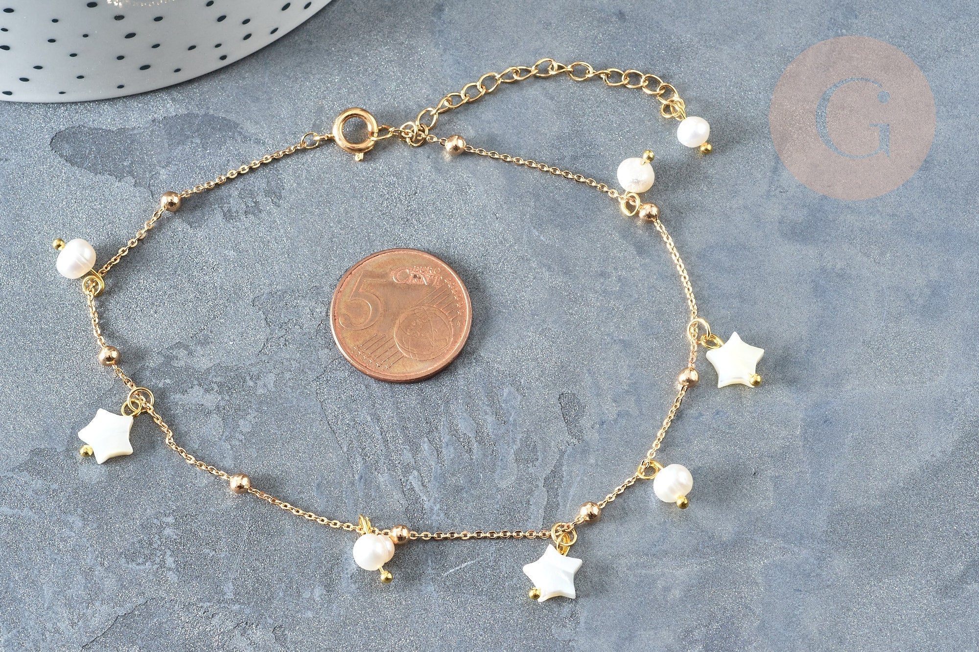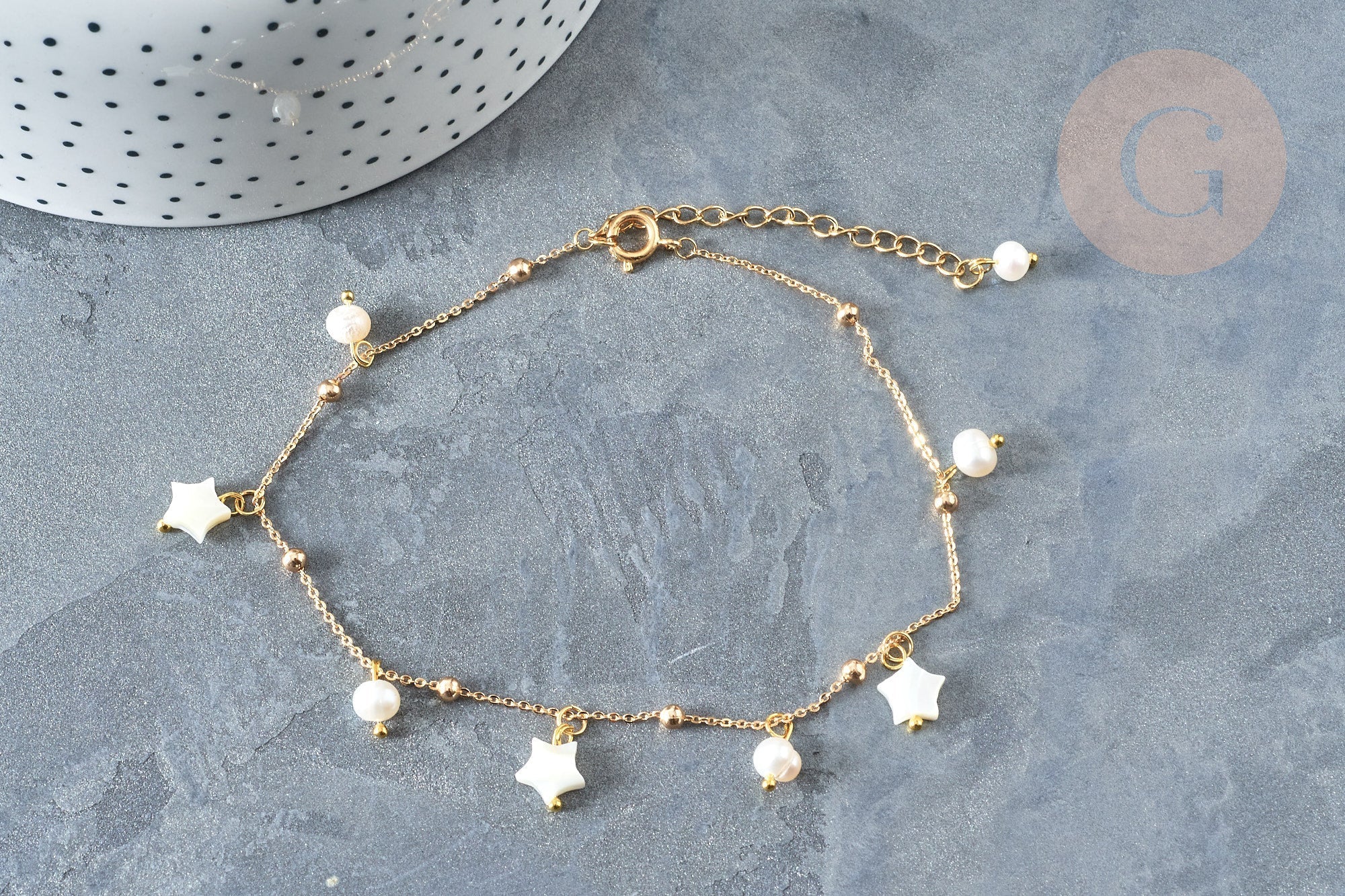 Tobillera de latón bañado en oro con estrella de nácar y perla de agua dulce, 24,8 cm, x1 (G7880)