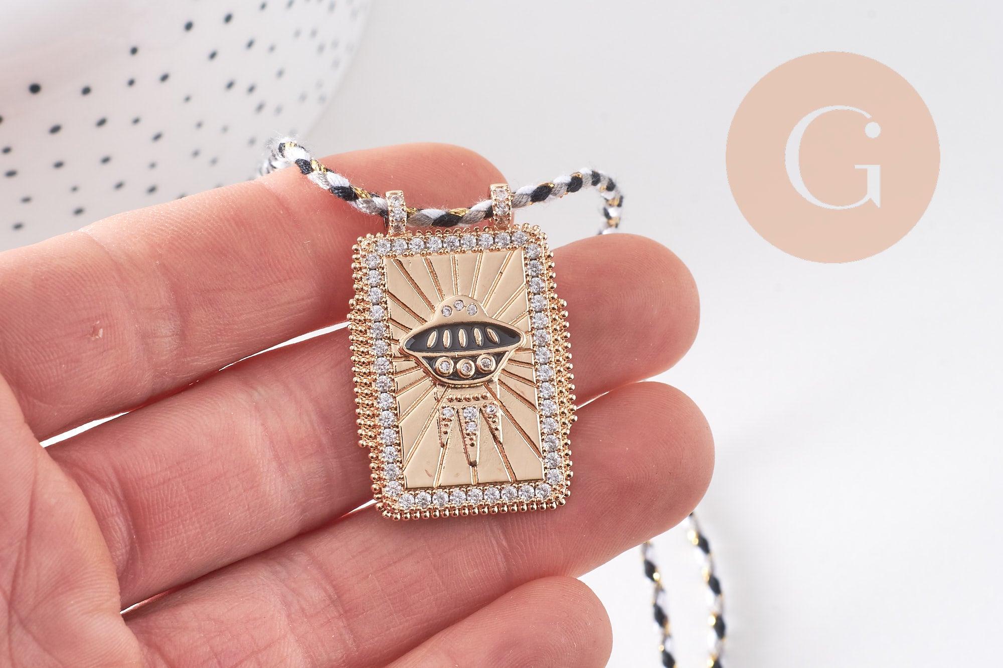 Collar con medalla de esmalte de platillo volante con esmalte negro y circonitas, cordón trenzado de zamac bañado en oro, 45 cm x1 (G10364-6)