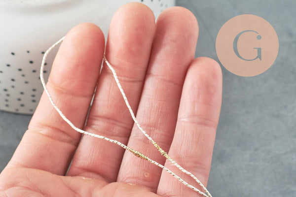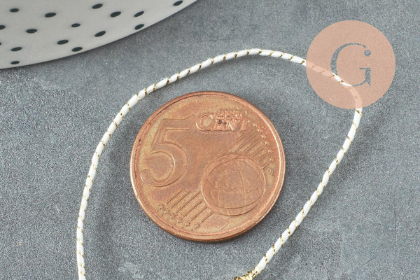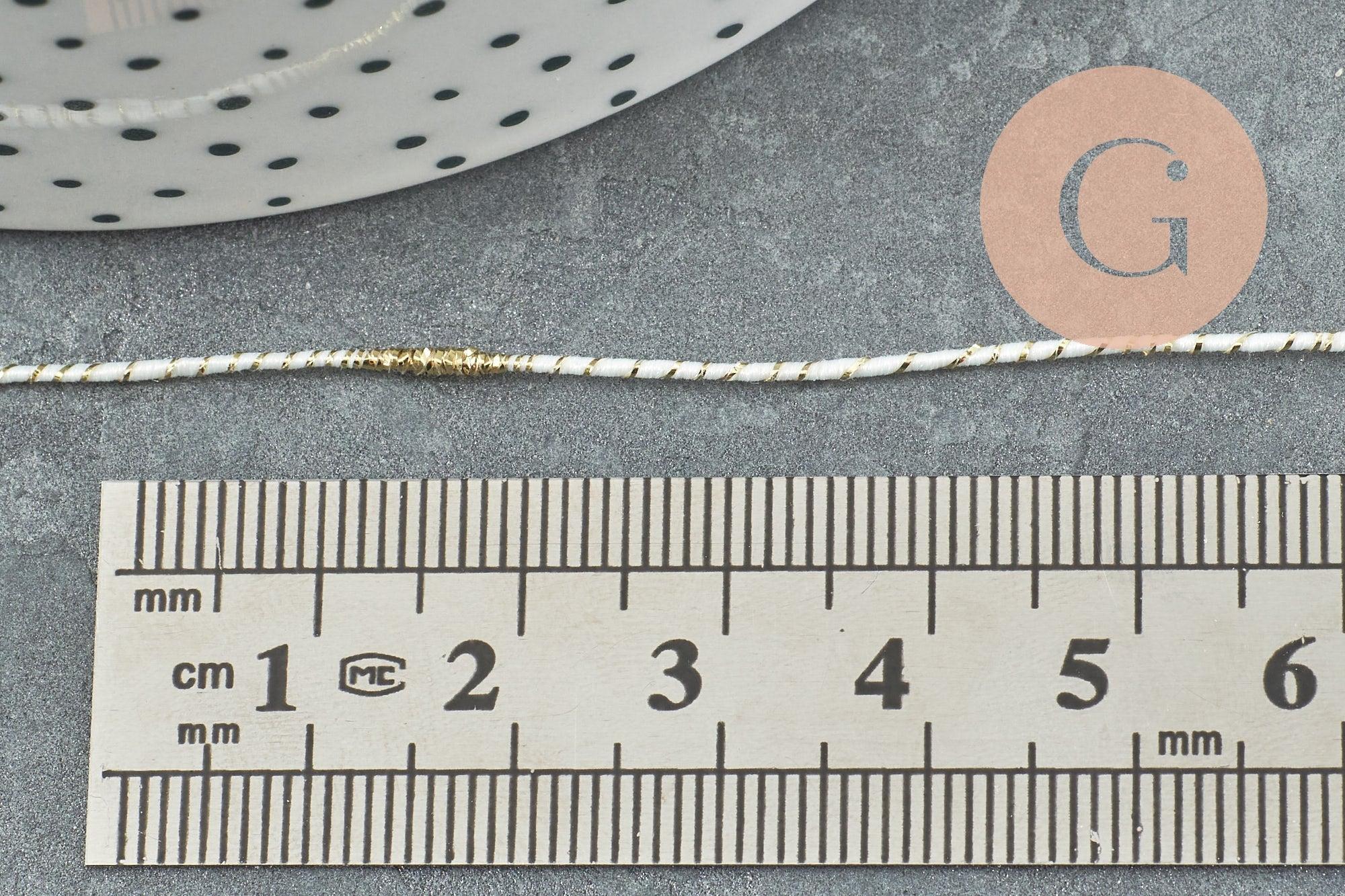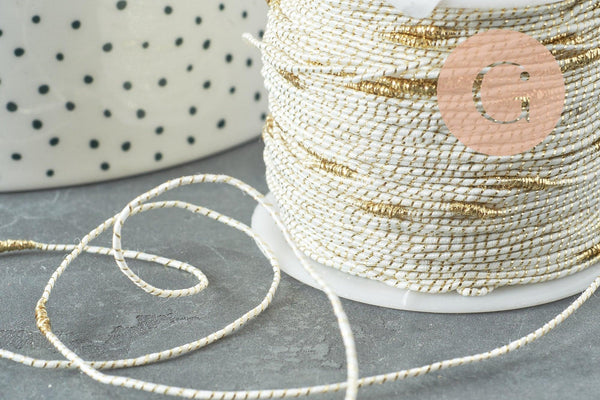 Un hermoso cordón de nailon color blanquecino y dorado , que puedes utilizar para hacer joyas, álbumes de recortes, accesorios y bordados.