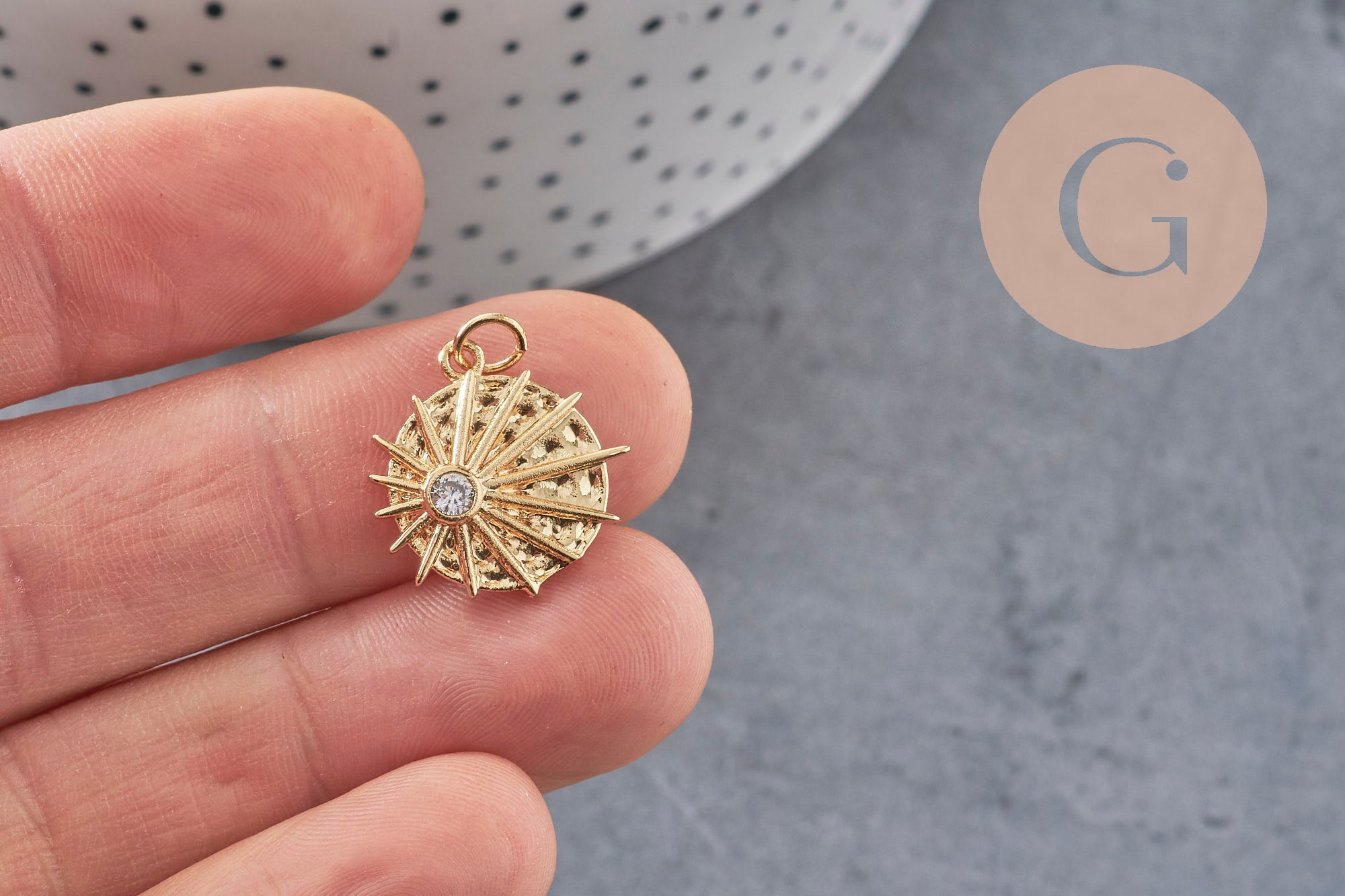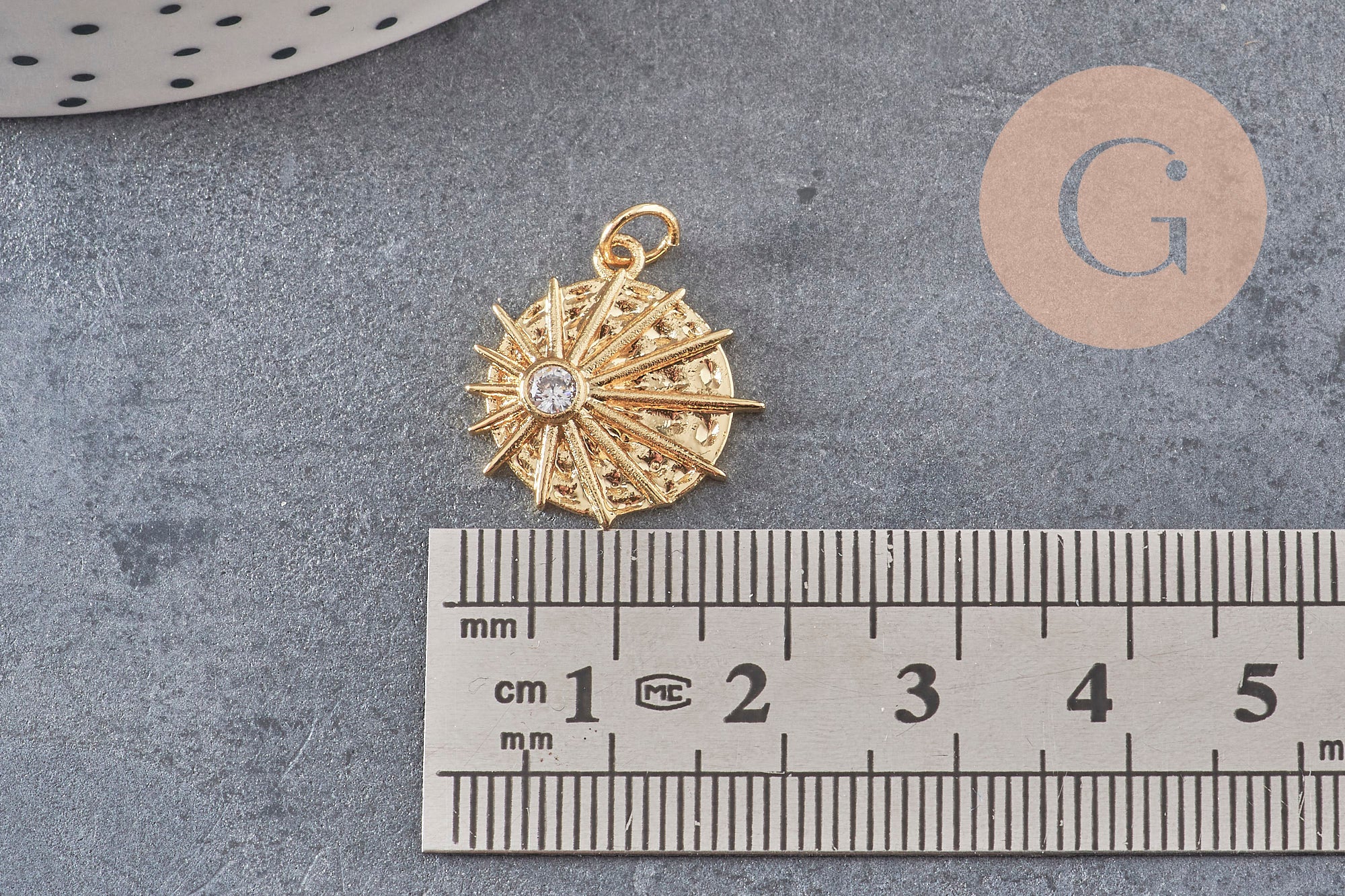 Colgante medalla de sol redonda en circonita de latón dorado, un colgante dorado con cristales para la creación de joyas, 18 mm, x1 G3469