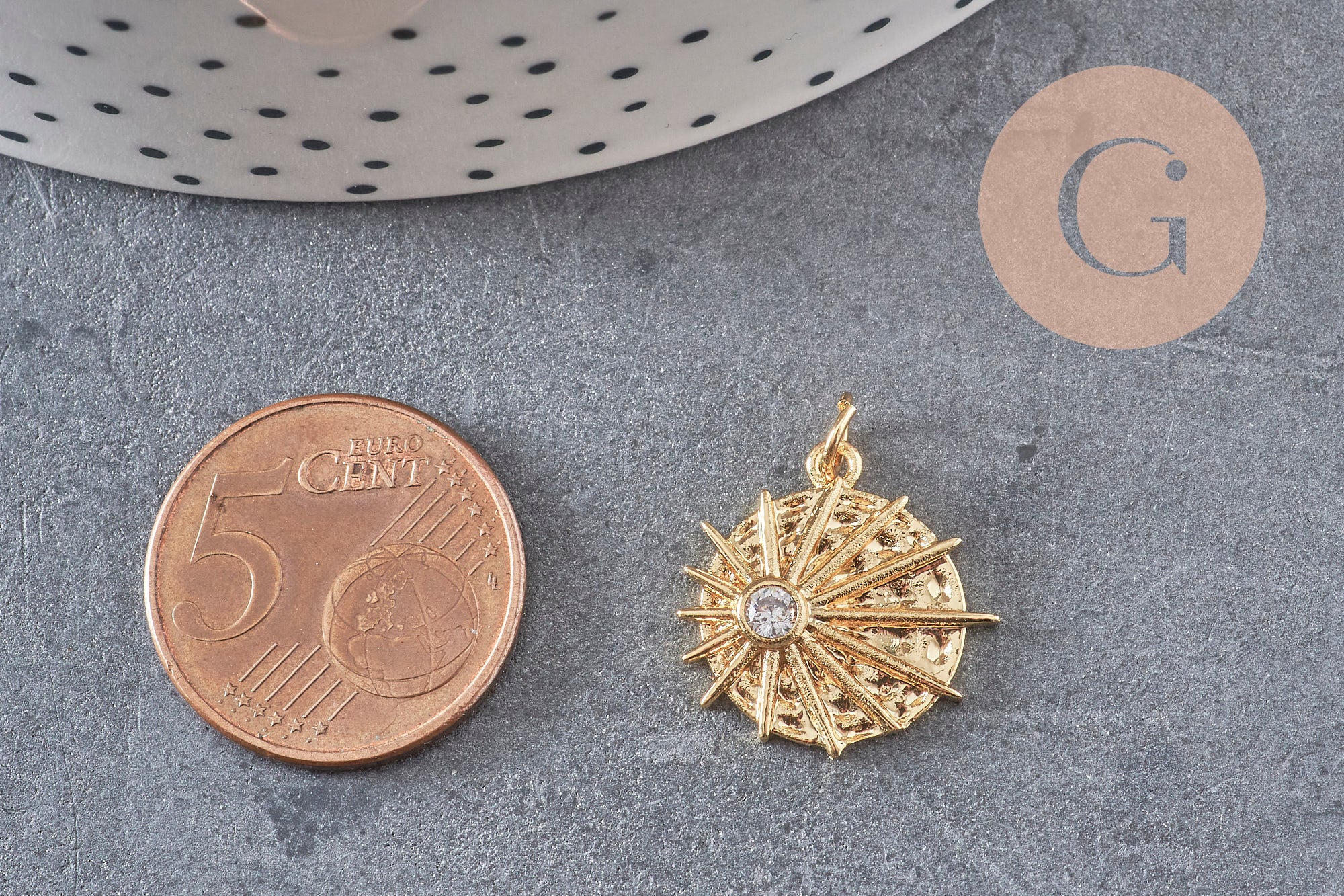 Pendentif médaille ronde soleil laiton doré zircon, un pendentif doré avec cristaux pour création bijoux,18mm, x1 G3469