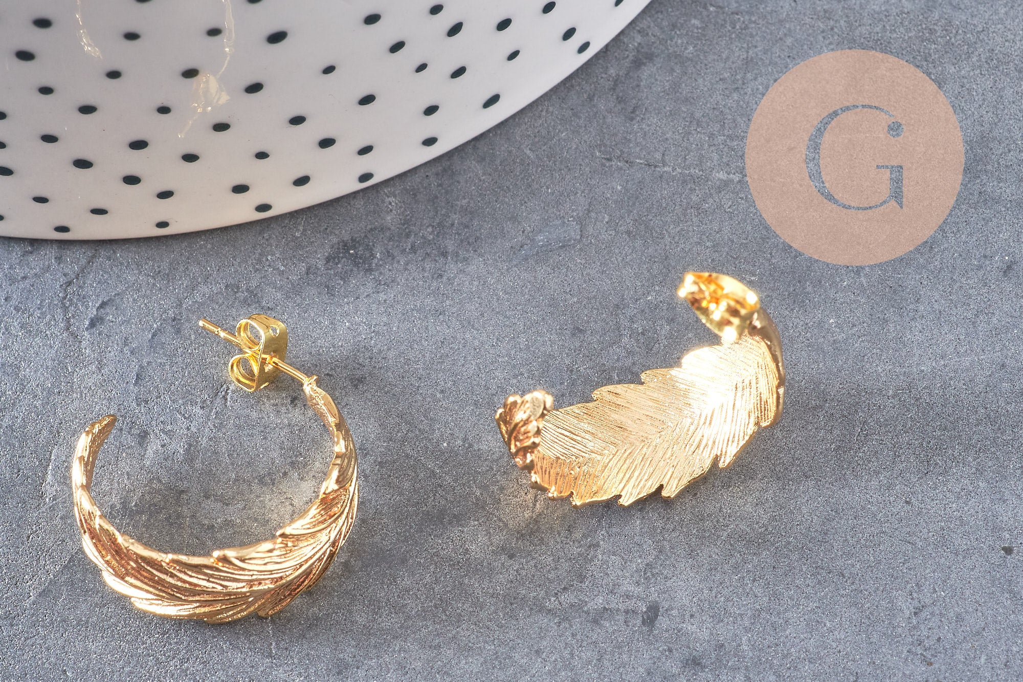 Boucles créoles feuille laiton doré 18k 24mm, la paire (G0916)