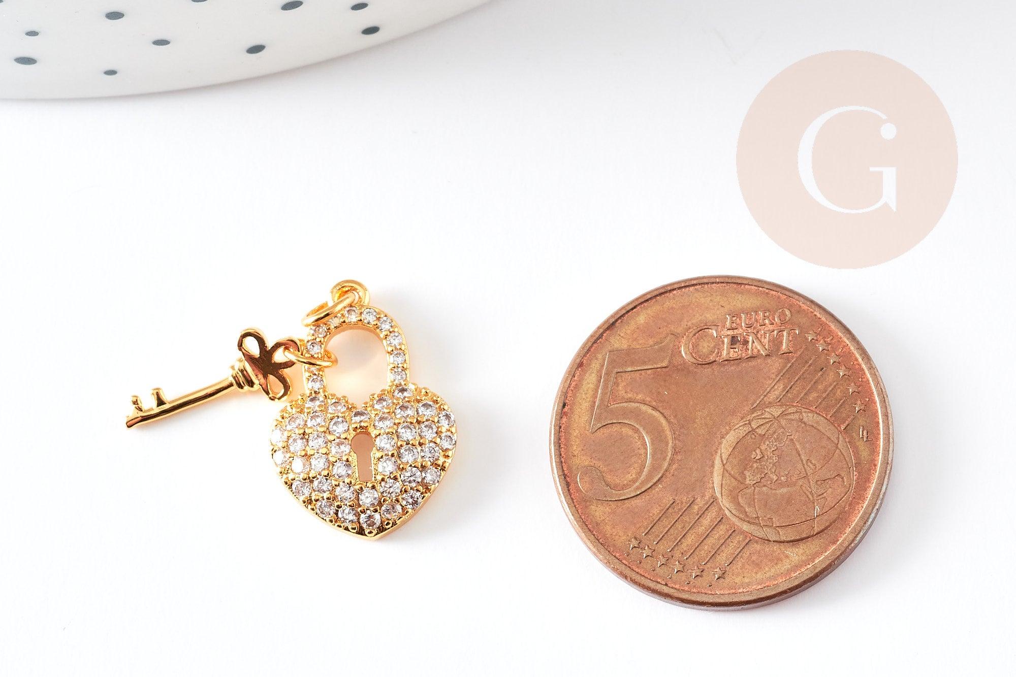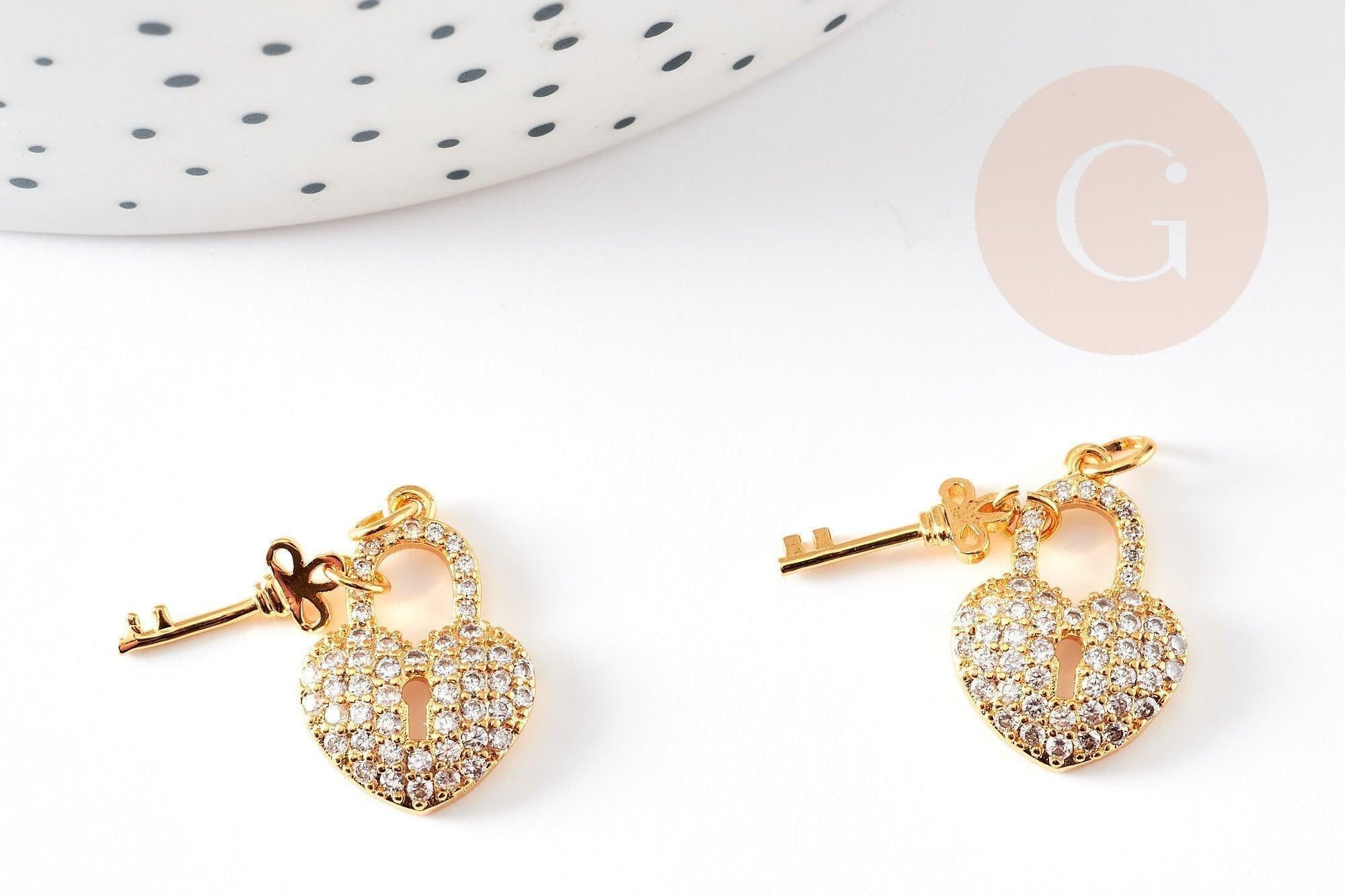 Para crear magníficos collares, pendientes y pulseras, adopte este lindo candado, pequeño colgante de amor con su llave y amuleto de la suerte en latón dorado, decorado con pequeñas circonitas blancas brillantes.