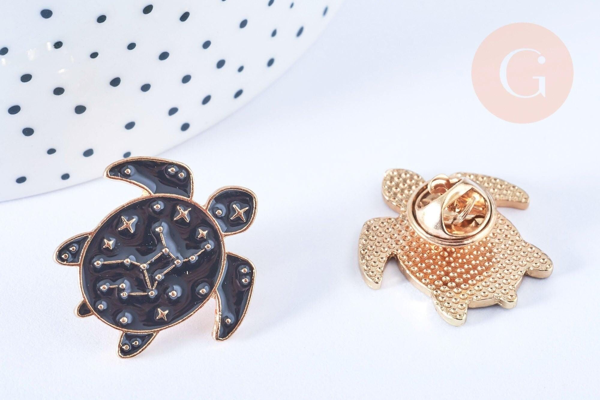 Te ofrecemos este encantador broche / pin representando una adorable tortuga decorada con un motivo místico negro con fondo estrellado, en zamac dorado y esmalte de color.