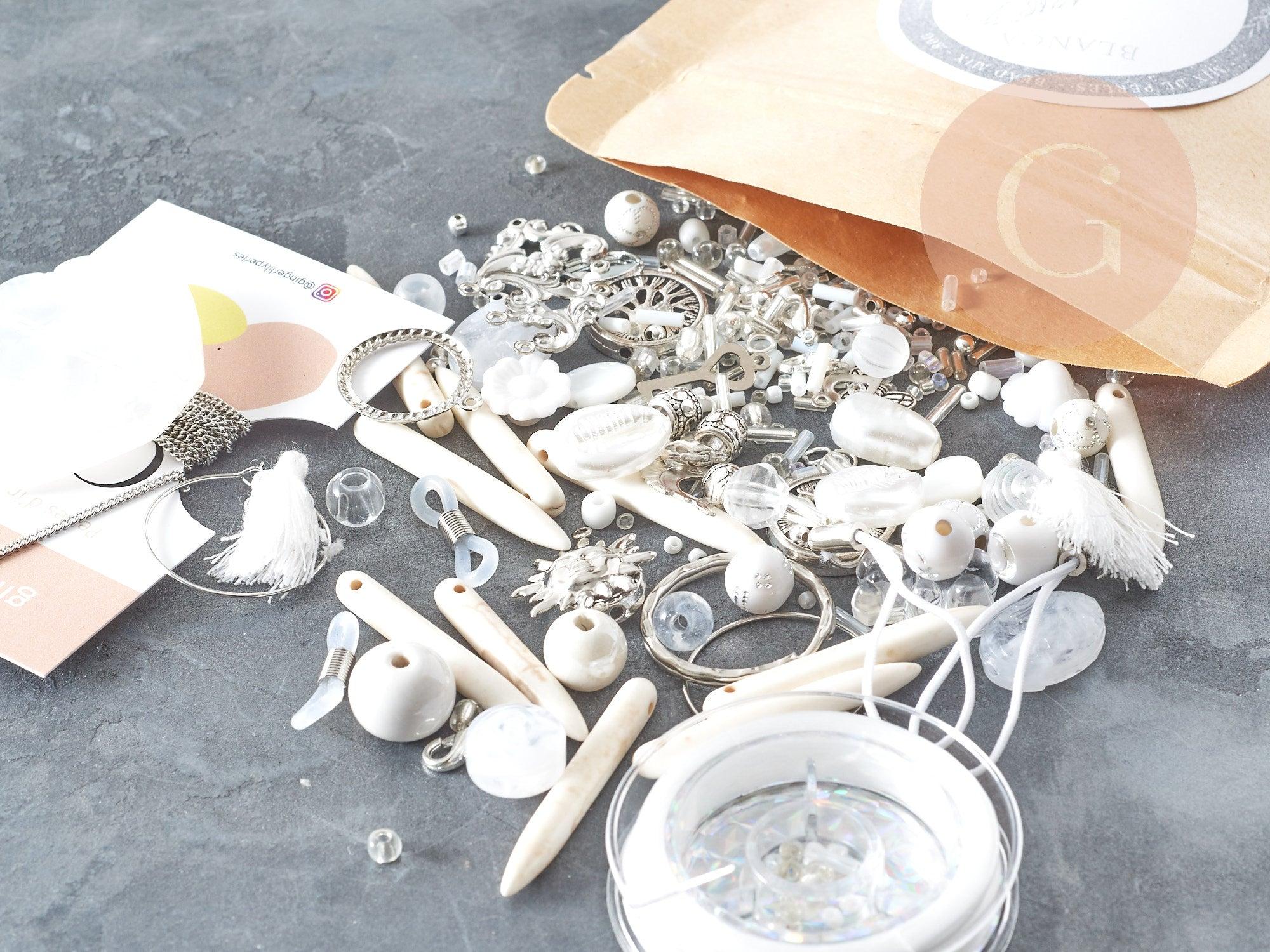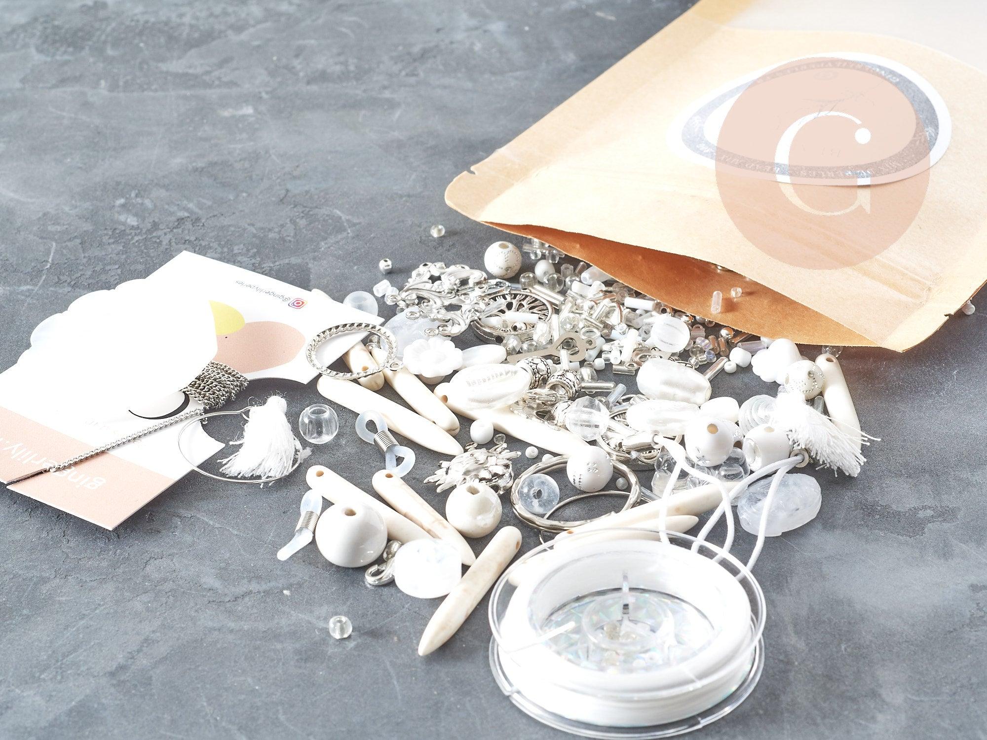 En este sobre descubrirás útiles de bricolaje para realizar magníficas joyas así como diversos accesorios . La bobina de hilo elástico flexible te permitirá crear varias pulseras y collares, para guardar o regalar. También encontrarás elementos para realizar joyas para gafas, joyas para teléfonos e incluso llaveros. Cuentas redondas de plástico, cuentas en forma de letras o mensajes, cuentas de fantasía...