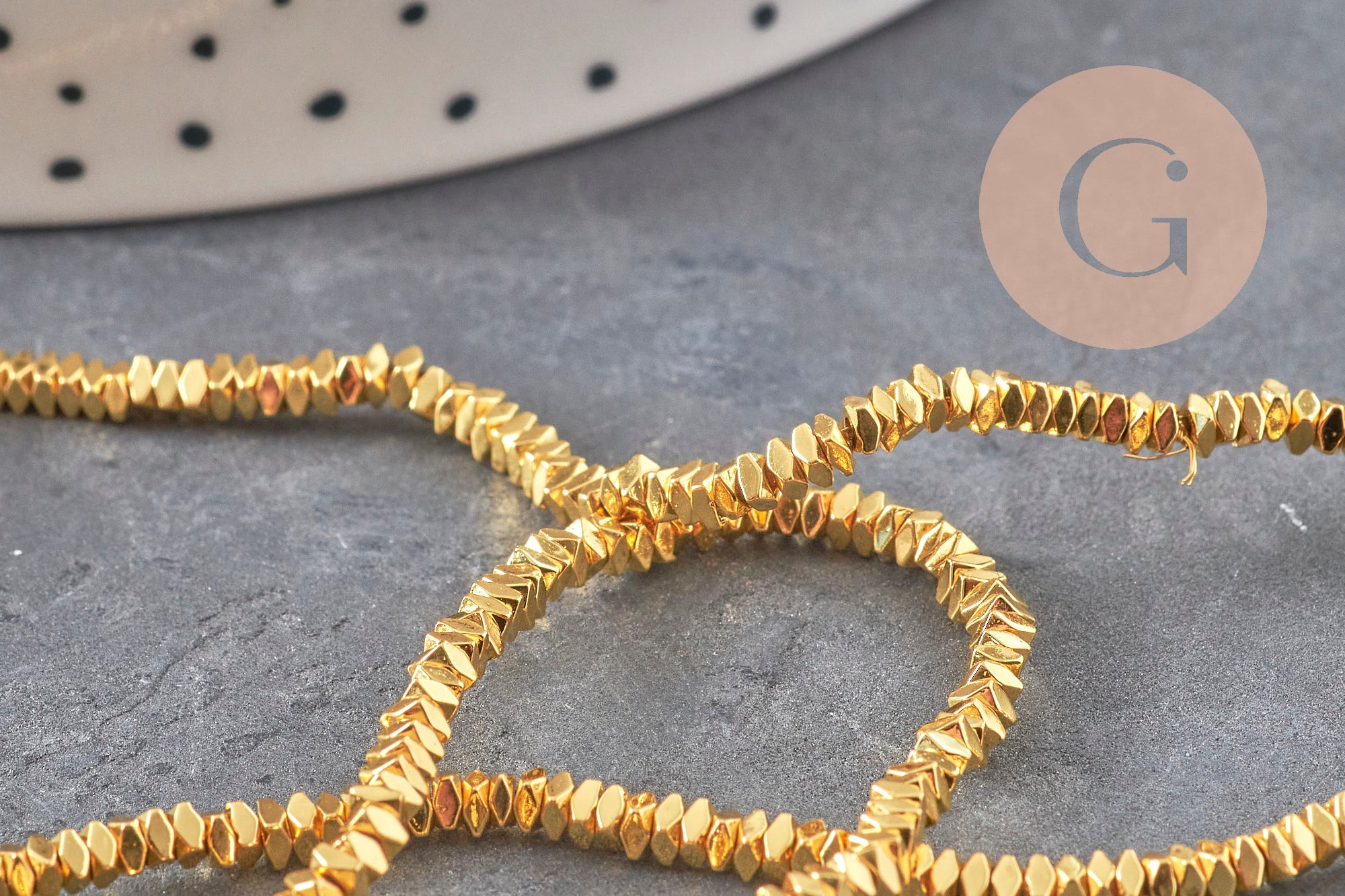 Estas cuentas cuadradas de 2 mm de hematita sintética bañadas en oro son ideales para añadir un toque gráfico, refinado y contemporáneo a tus creaciones de joyería DIY. Su forma cuadrada regular crea un moderno juego de líneas, perfecto para estructurar una pieza de joyería con un toque delicado.